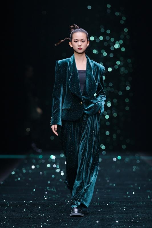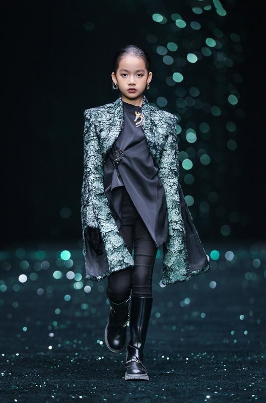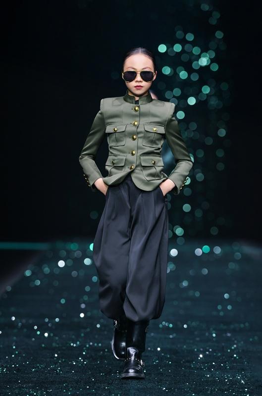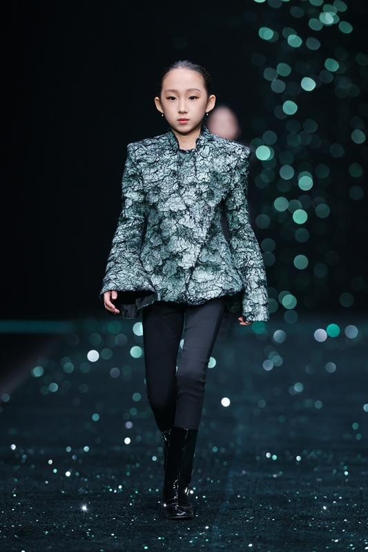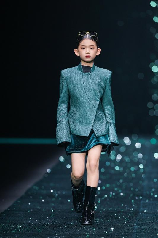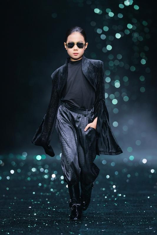 黑灰白主色调高级克制,将成人时装的精致剪裁与童装的舒适实穿完美融合,让每个孩子都能自信展现个性态度。这场秀不仅是一场视觉盛宴,更传递出"不被定义、自在生长"的时尚理念,为中国童装设计注入了全新活力。