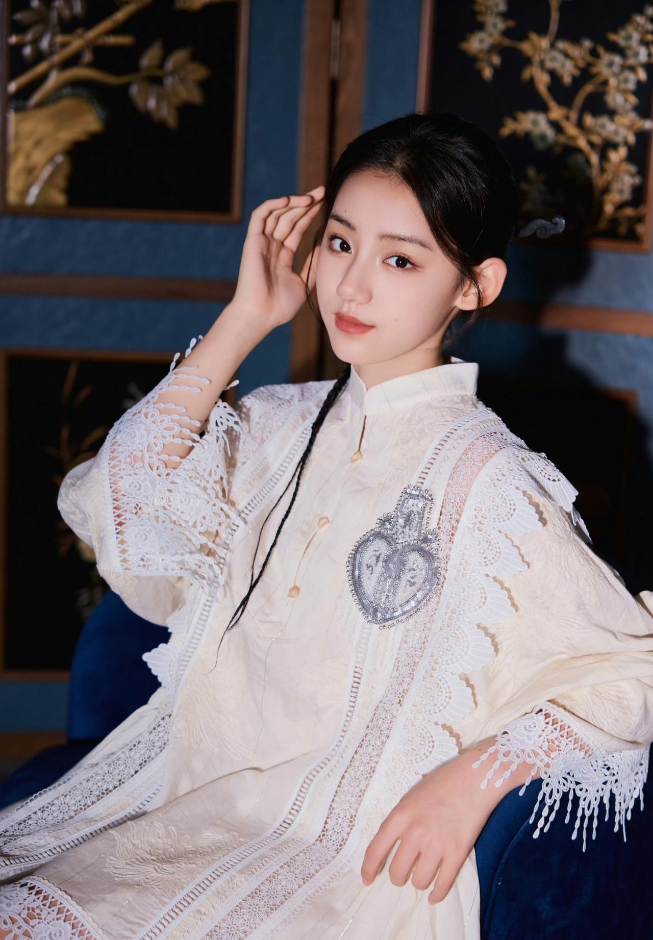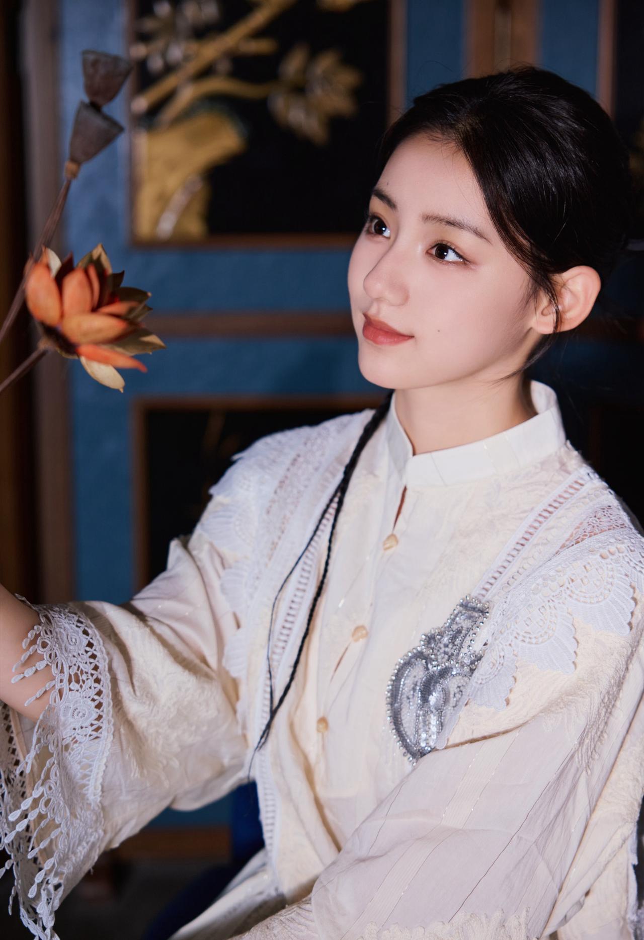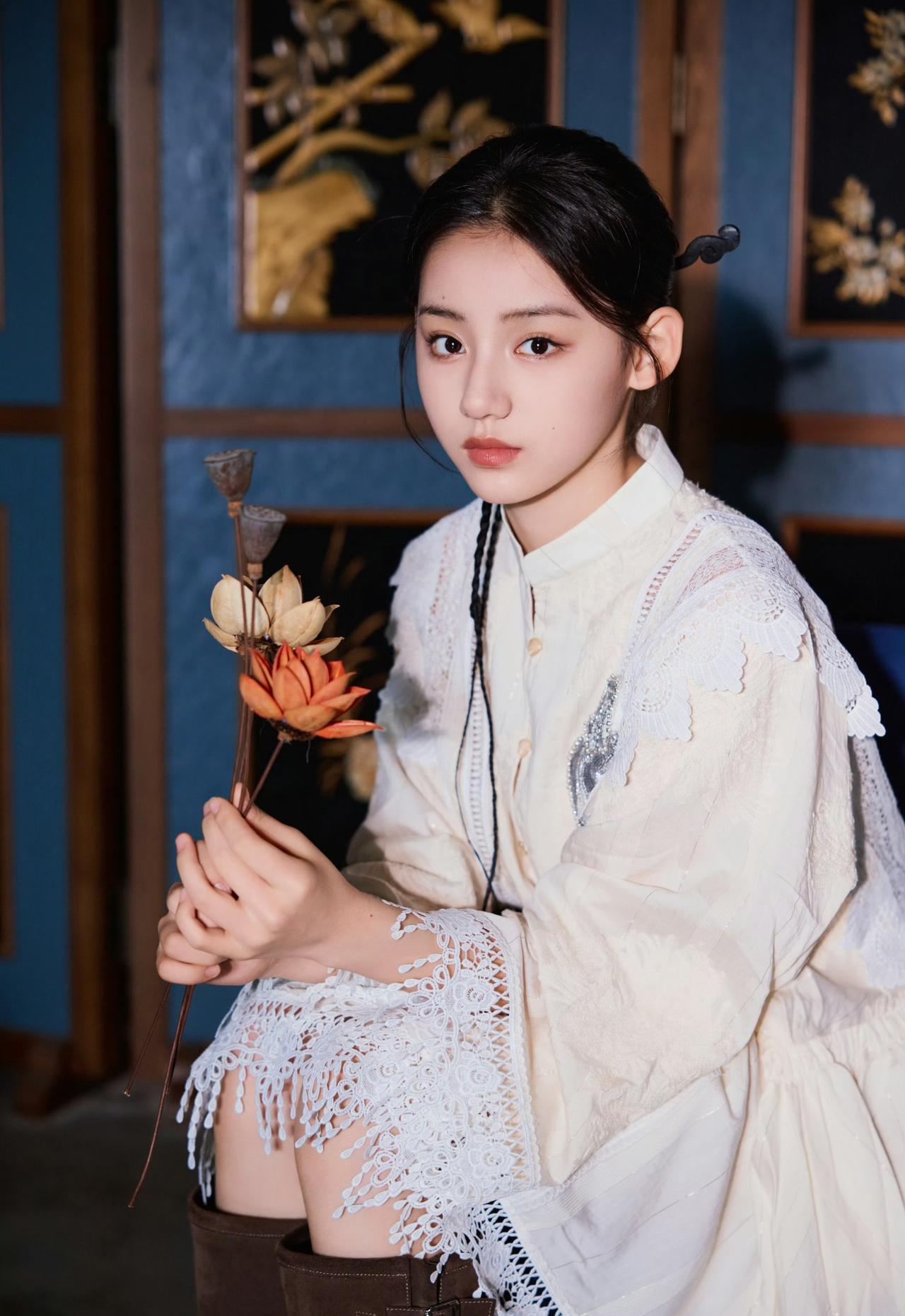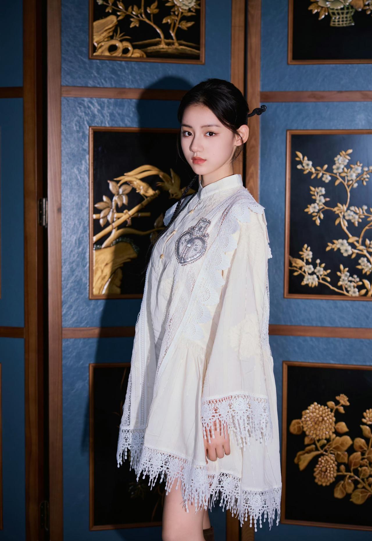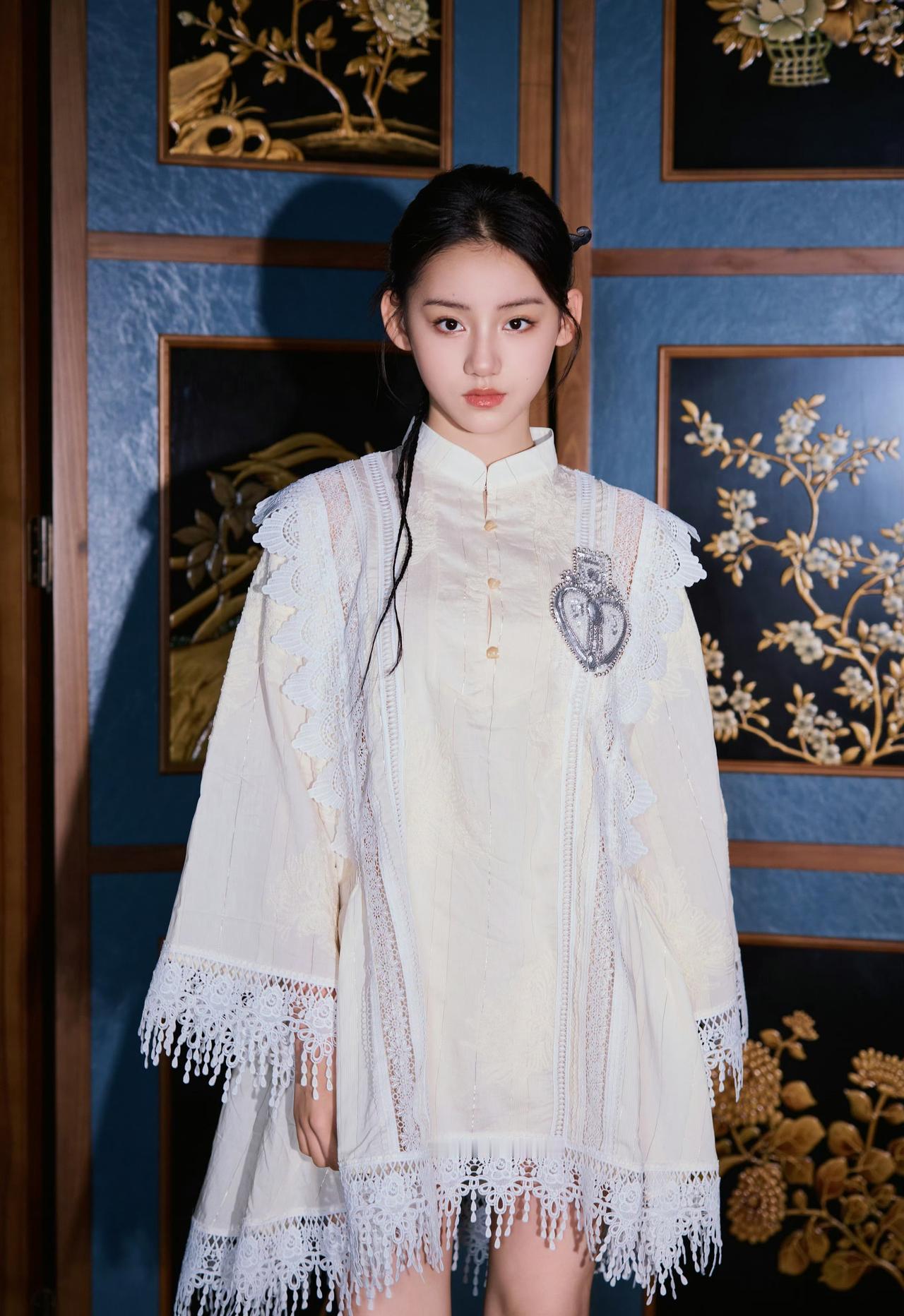 旗袍领+盘扣的中式基底,叠加蕾丝流苏、爱心装饰这些甜美元素,再配一双复古靴,既有东方韵味的雅致,又带点俏皮的酷感,是“国风甜妹”的独特气质~刘佳玺