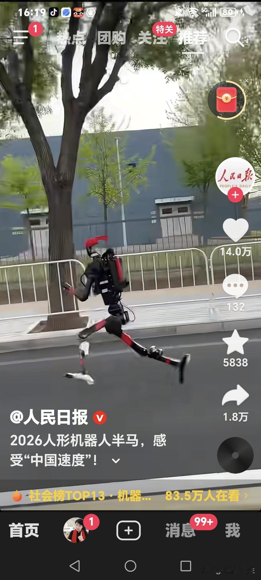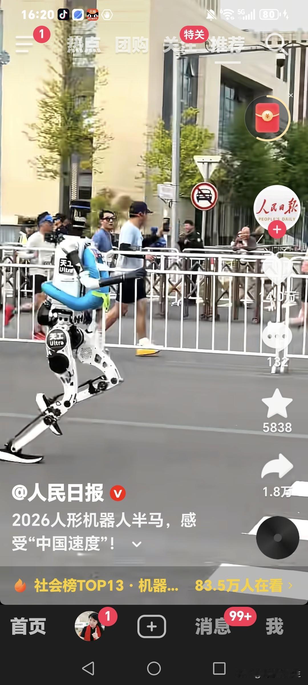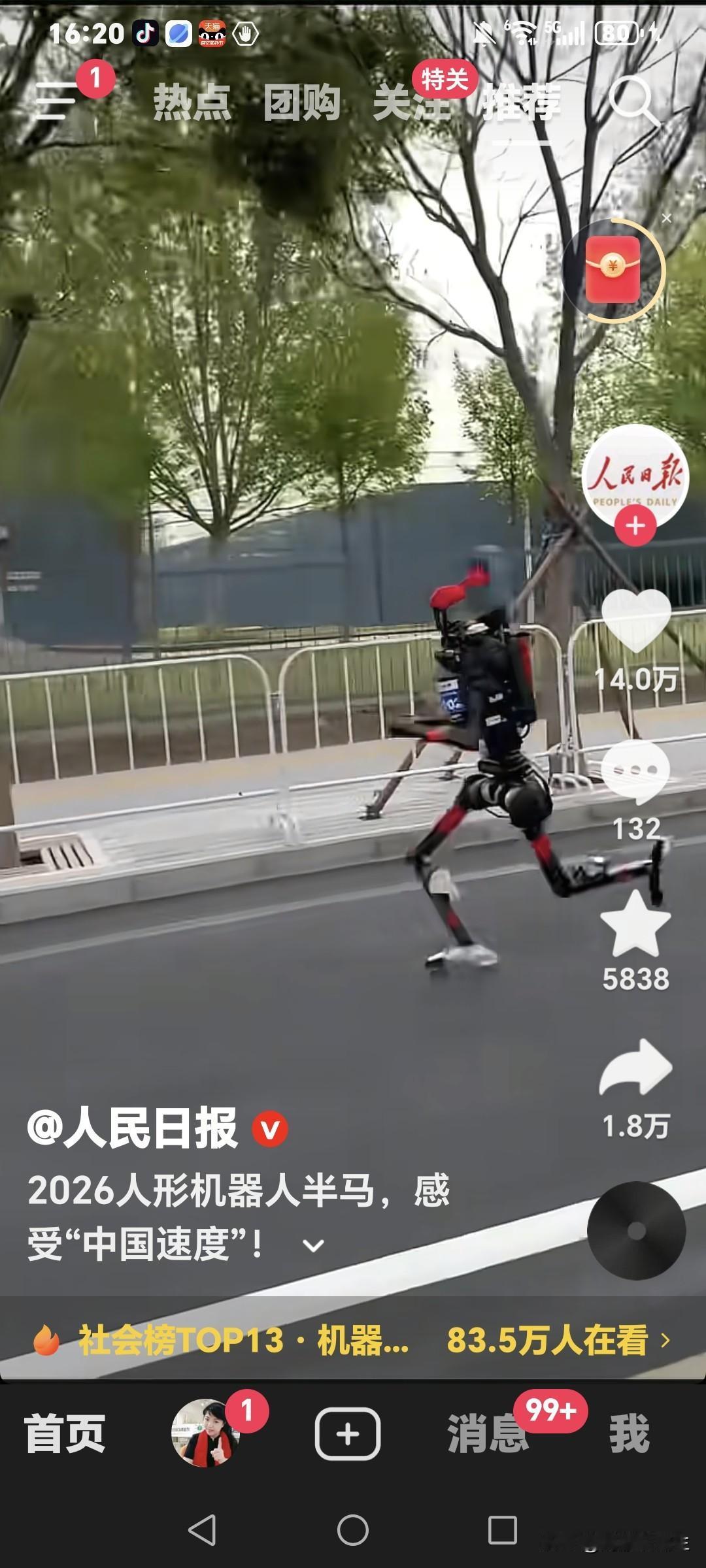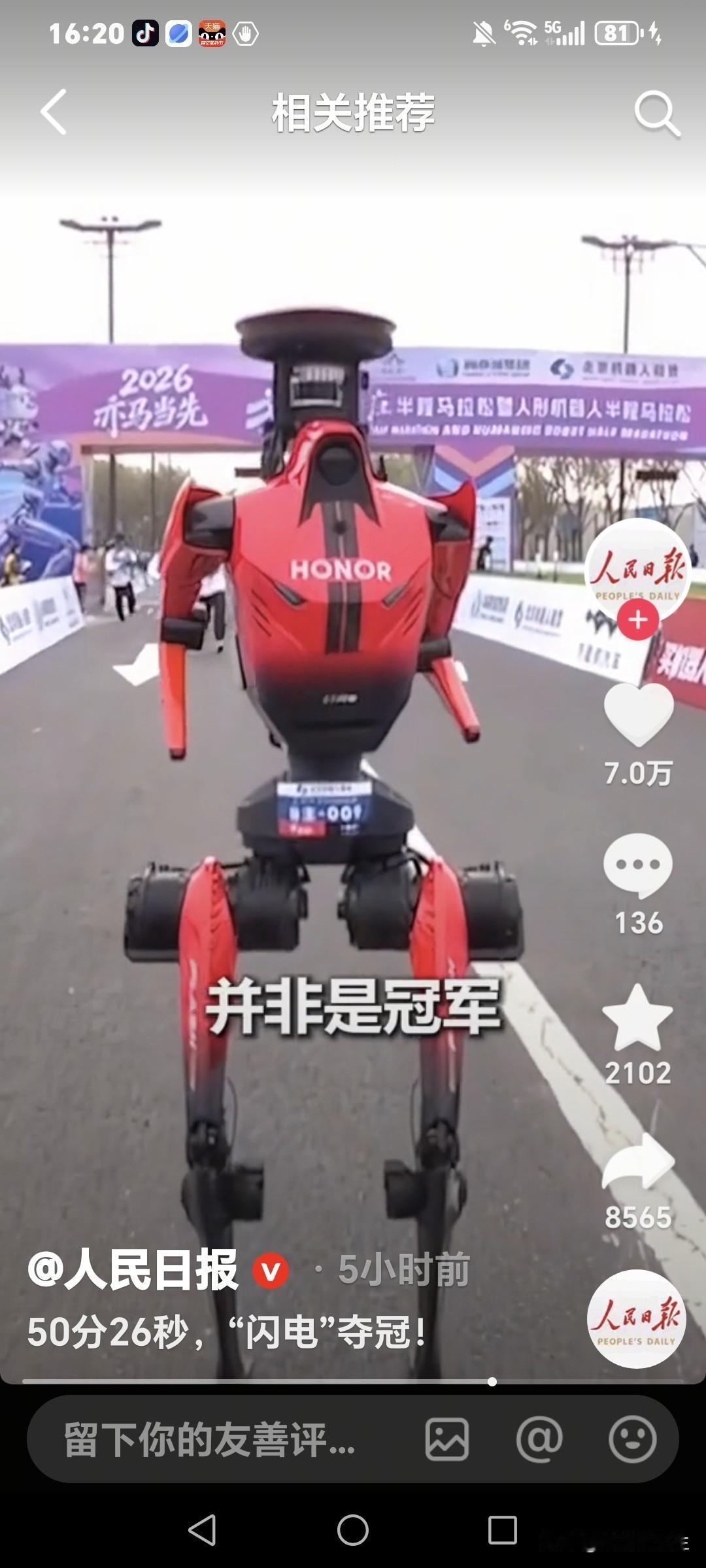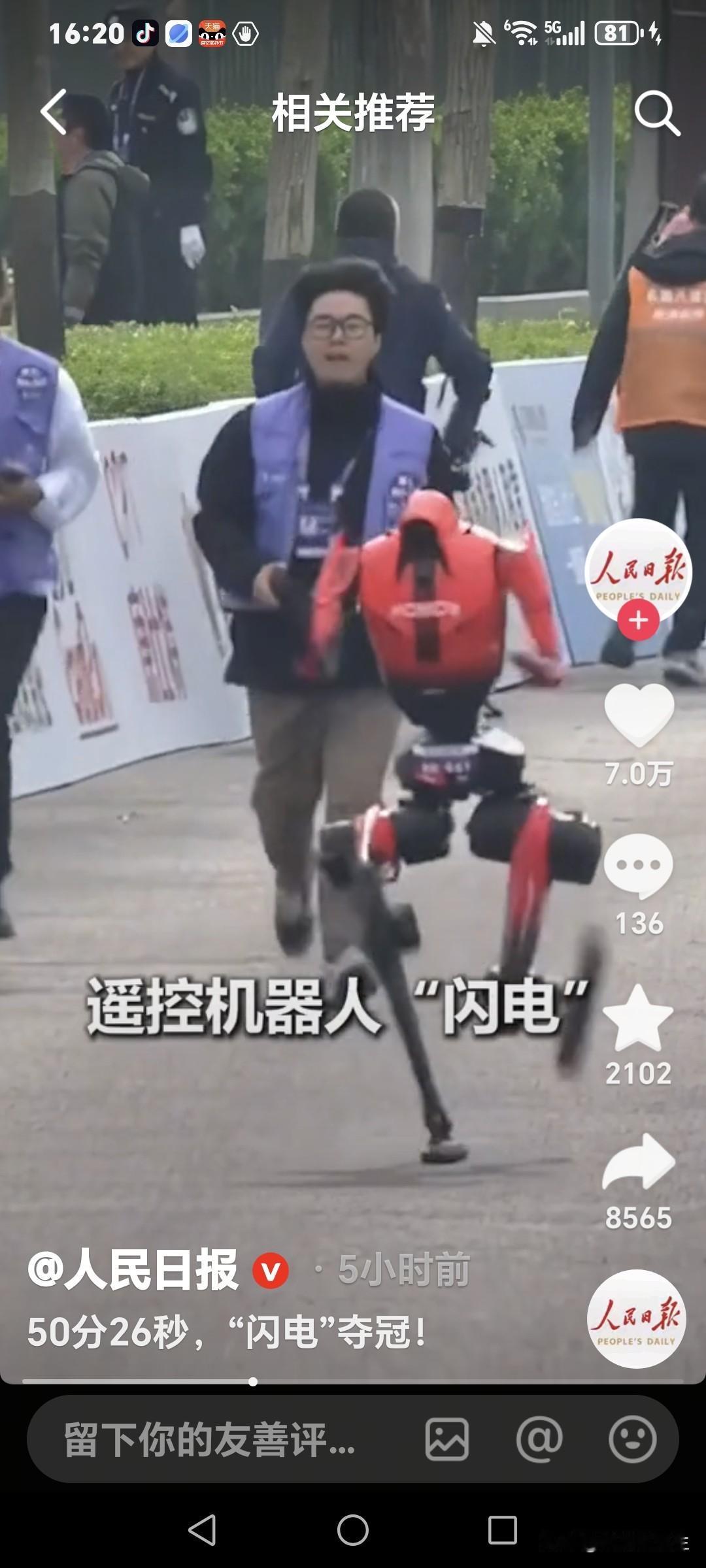 这也太快了,机器人半马比赛,“闪电”跑出50分26秒的好成绩,获得冠军!不是我不明白,这世界变化快,科技发展日新月异,上一次机器人跑步还是笨笨咔咔,如今嗖嗖滴,步伐稳,速度快!如果机器人要去救援,你说是不是跟它得名字一样,闪电!雷霆出击啊!你觉得咱们机器人发展的怎么样?你认为机器人最应该去干什么?