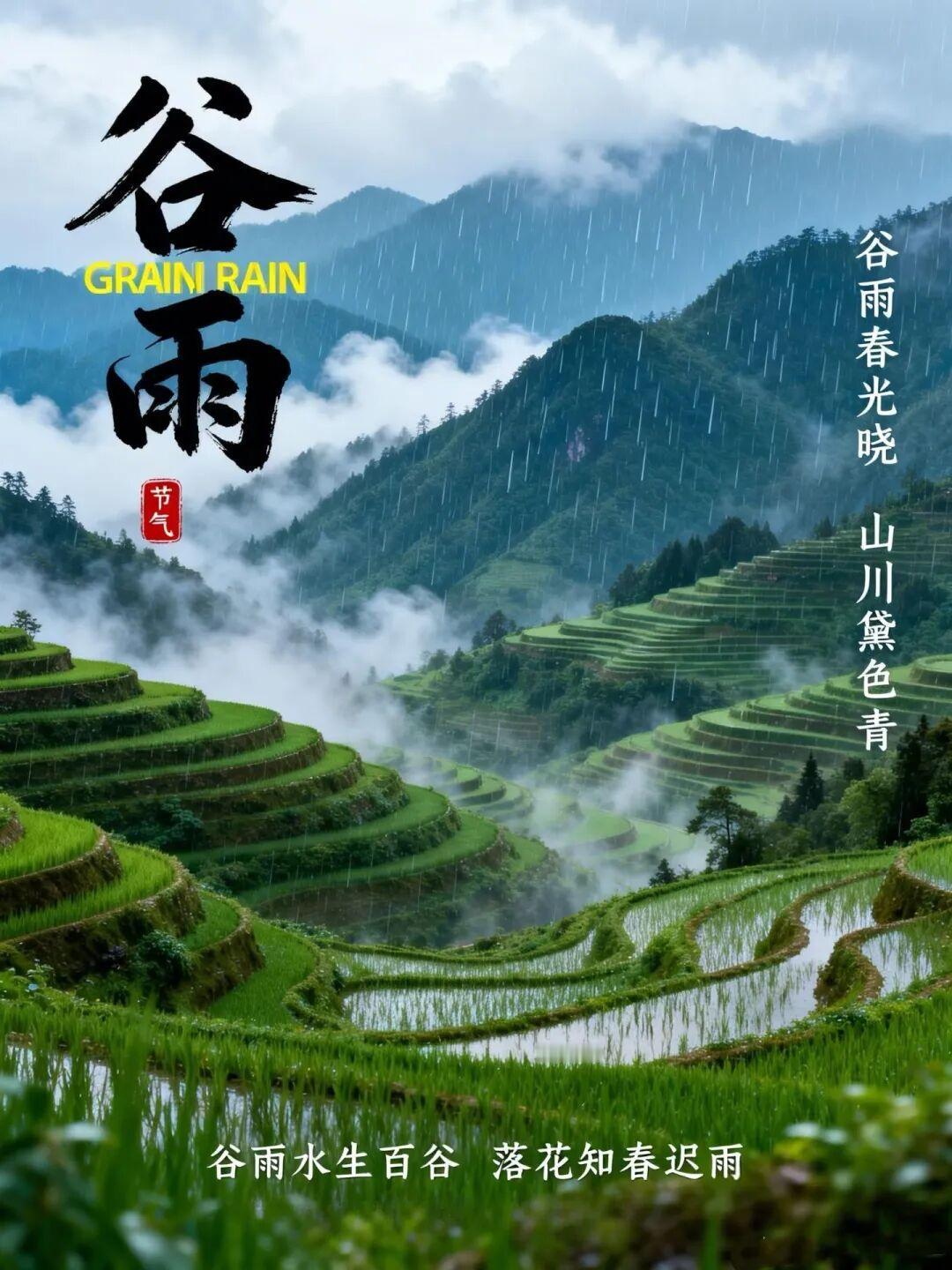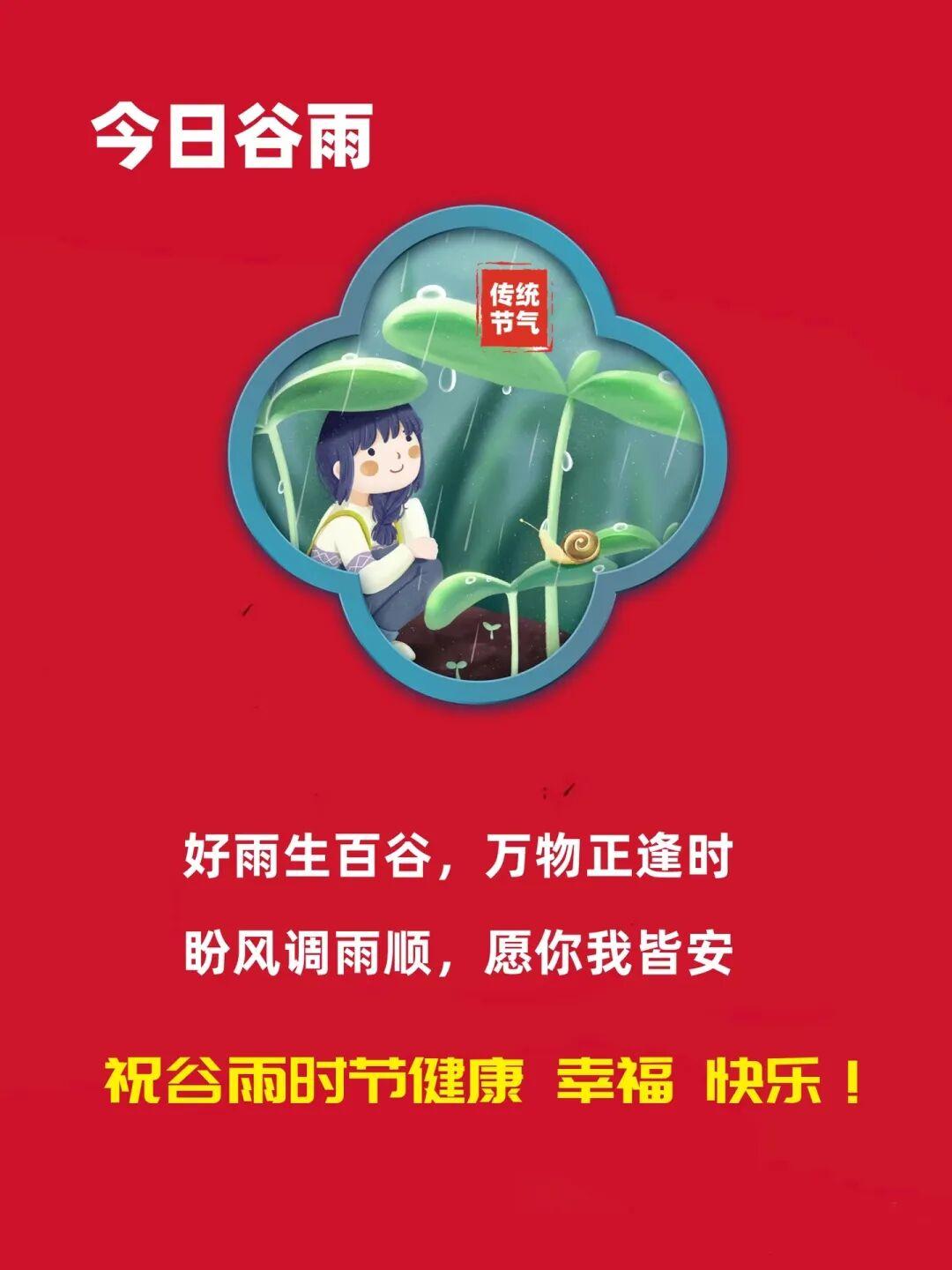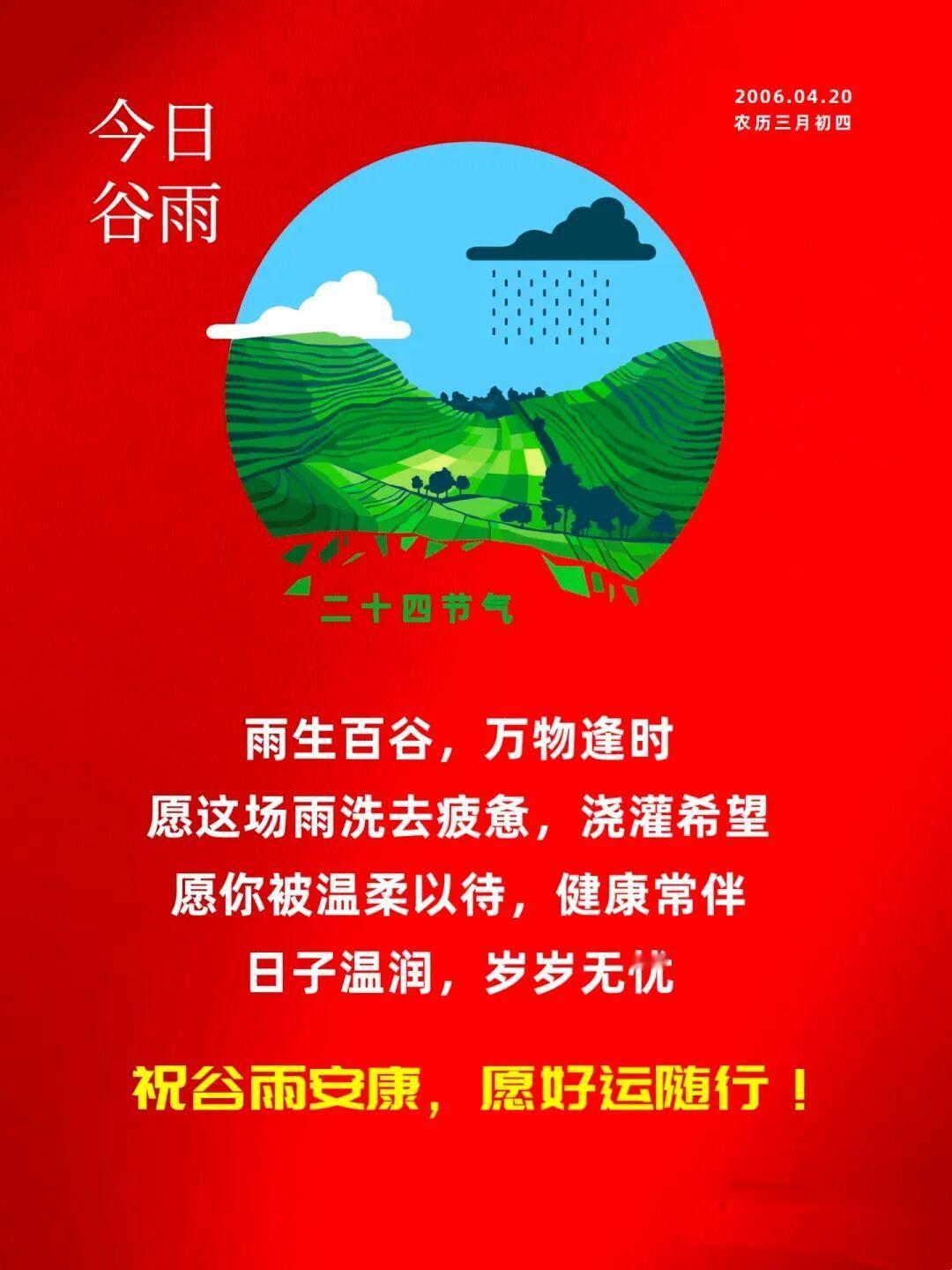 🌾今日谷雨🍃谷雨好时节,甘雨正当时;丰收有盼头,欢喜满心头。愿你爱情、财源、健康、快乐、幸福齐丰收。谷雨节气安康♥