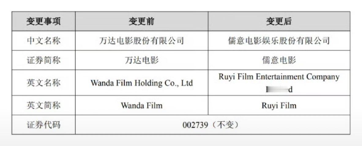 万达电影4月20日起更名为儒意电影 今天(4月19日),万达电影股份有限公司发布“关于变更公司名称、证券简称暨完成工商变更登记的公告”称:万达电影股份有限公司变更公司名称为儒意电影娱乐股份有限公司。明天(2026年4月20日),公司证券简称由“万达电影”变更为“儒意电影”,公司证券代码“002739”保持不变。