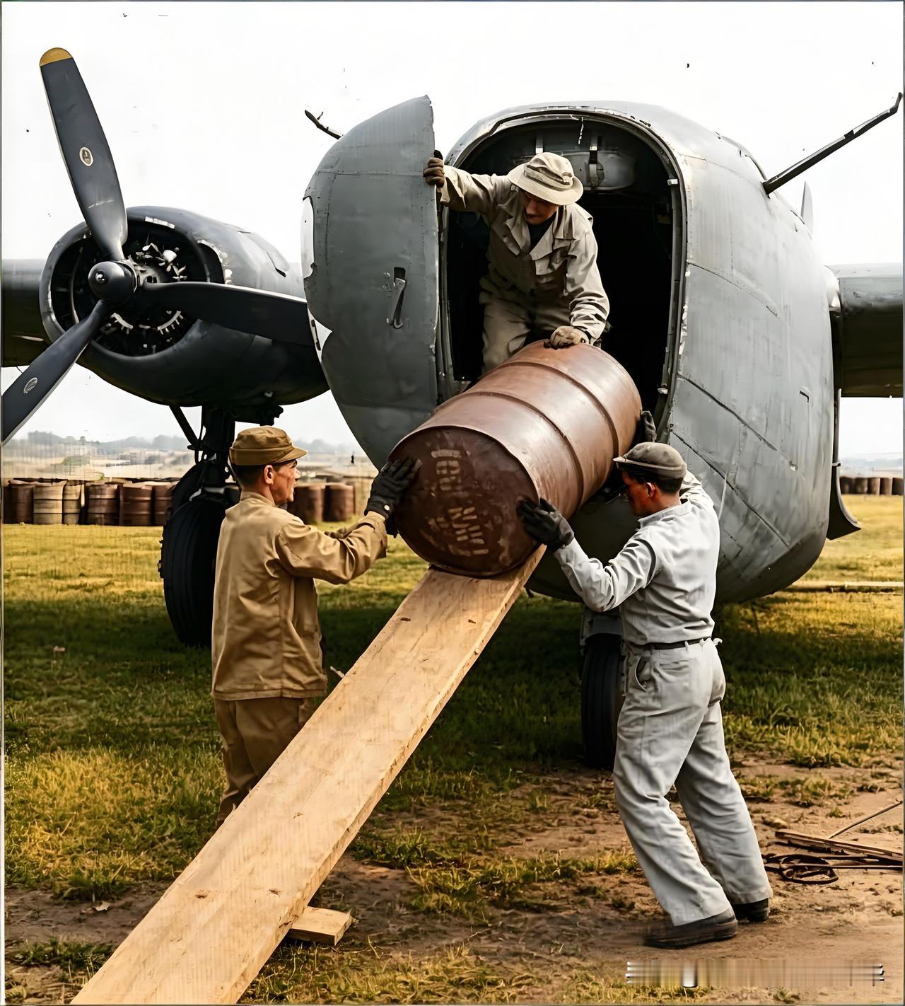 1944年的昆明,美军援华物资经由驼峰航线,源源不断地运抵大后方昆明。照片上是美军地勤人员从运输机上卸载物资,看不懂这是何种运输机,看起来飞机不大,装载不了多少物资。尤其是飞机货仓门好像不能完全打开,卸货很不方便,还要用一块长木板做卸货滑梯,感觉这种运输机很落后。牢记历史爱我中华