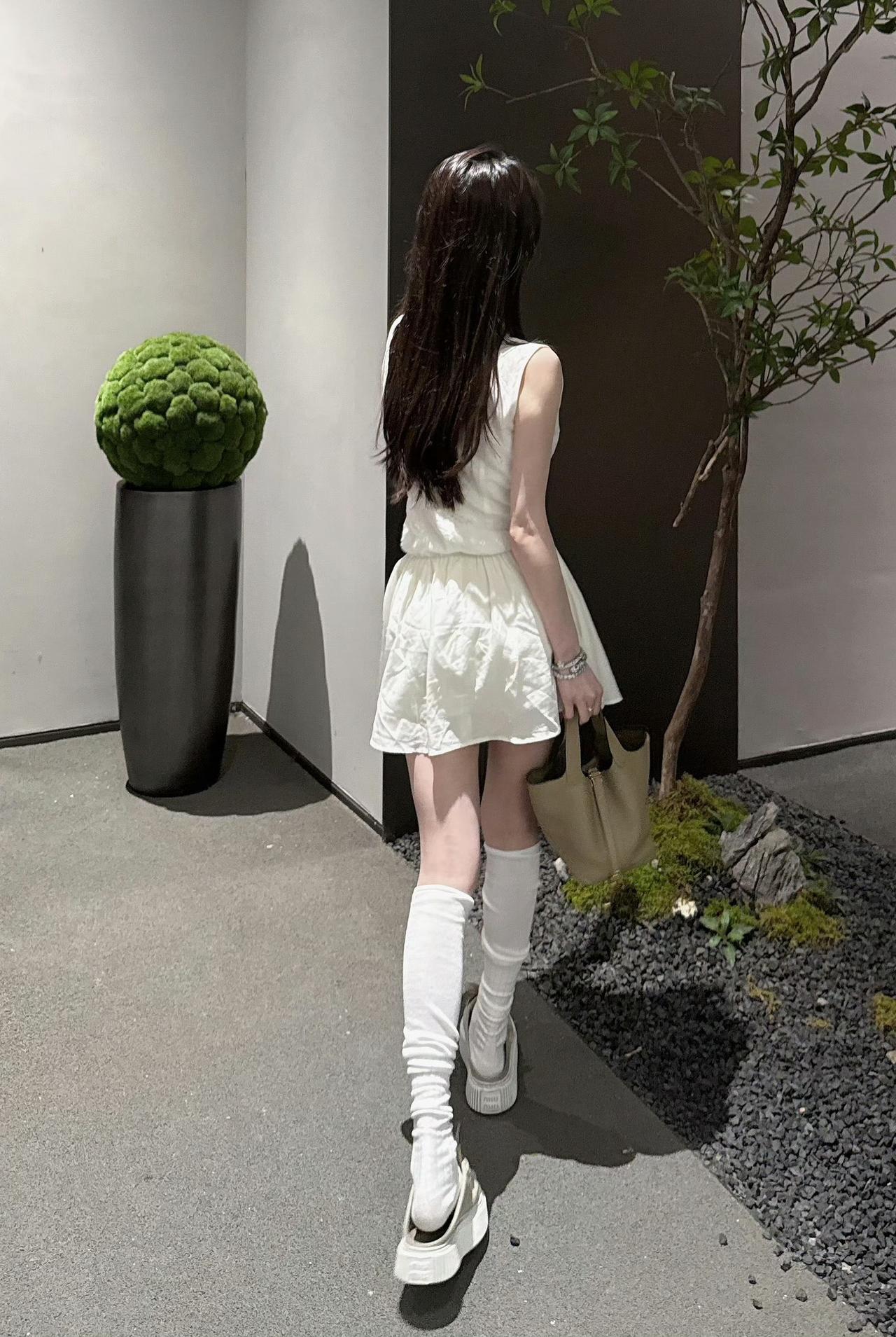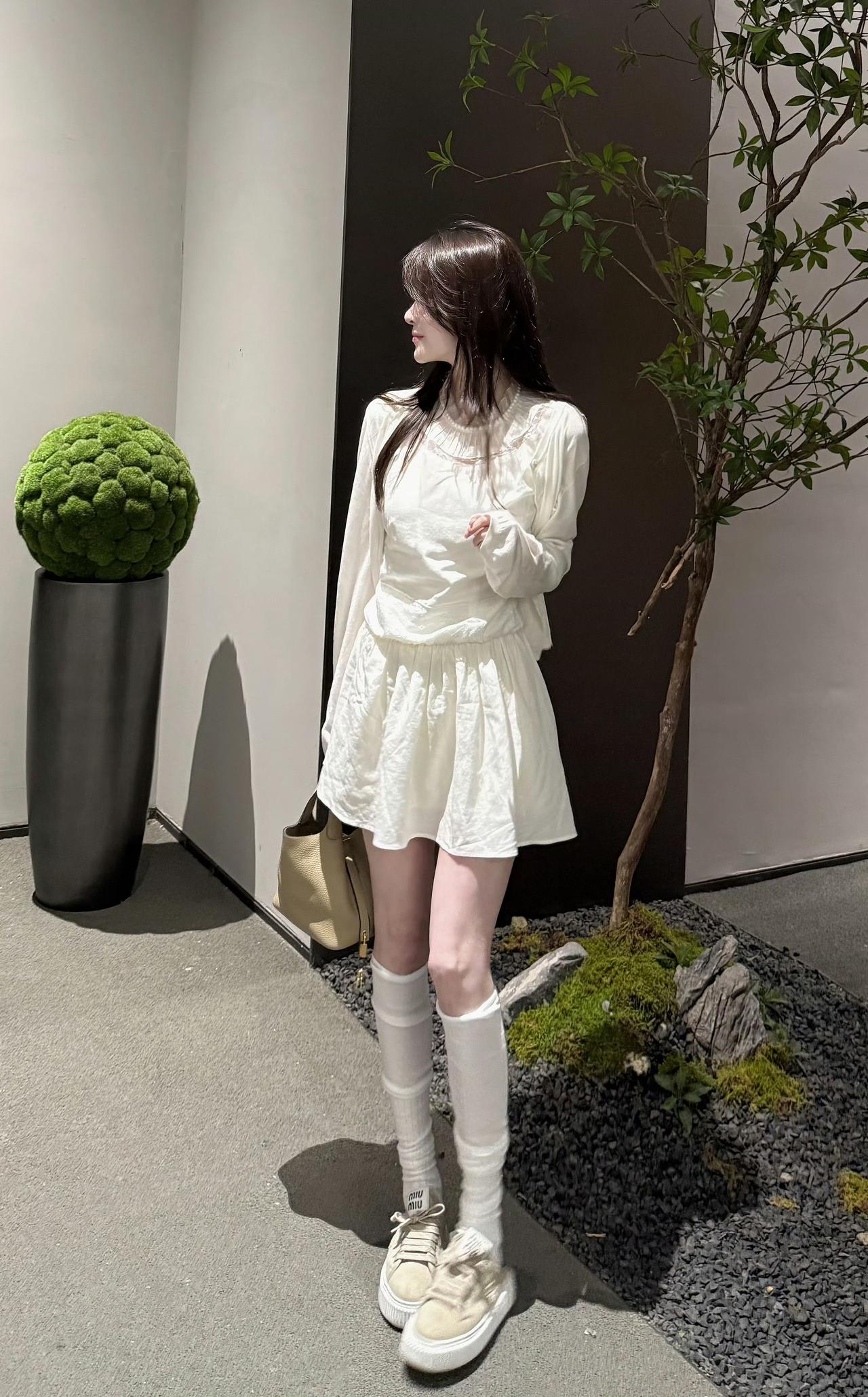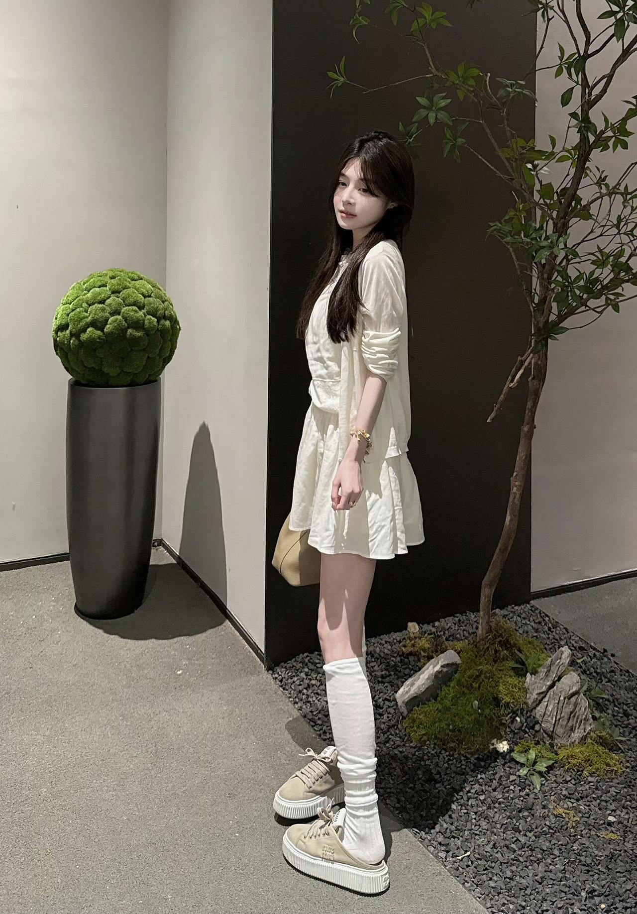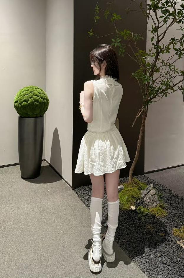 这套服装领口有手缝珍珠,胸前有褶皱与蕾丝拼接,腰间有蕾丝装饰,面料含80%莱塞尔和20%亚麻,经洗水工艺处理,收腰有弹性,能遮肉,适合多种身材[灵光一闪]