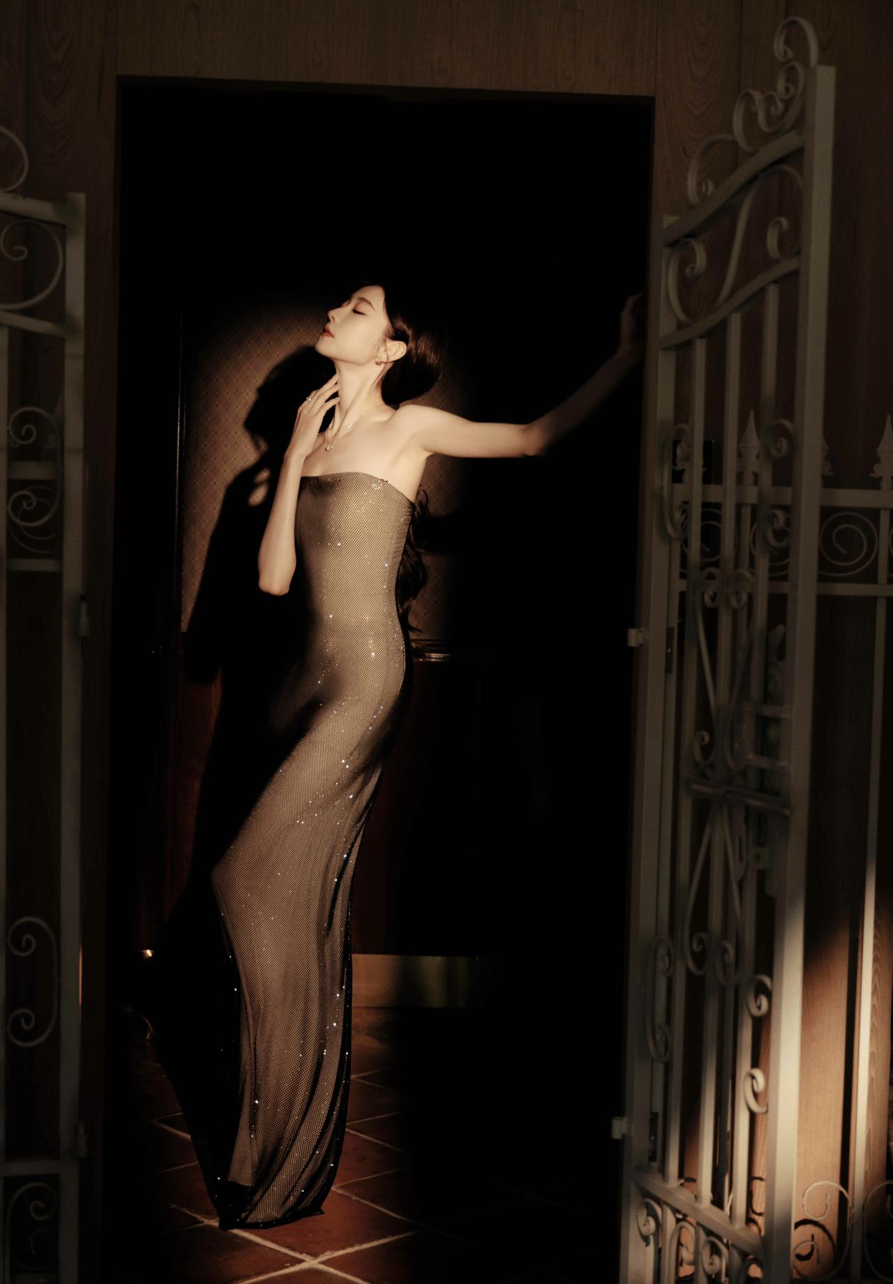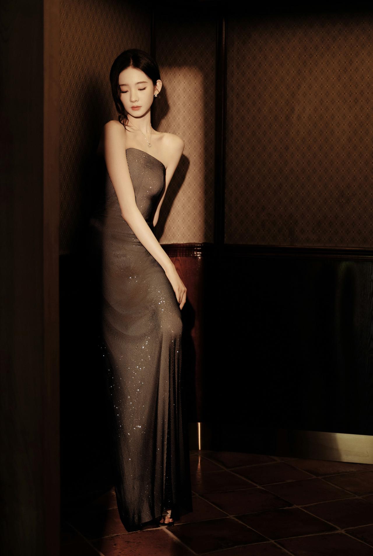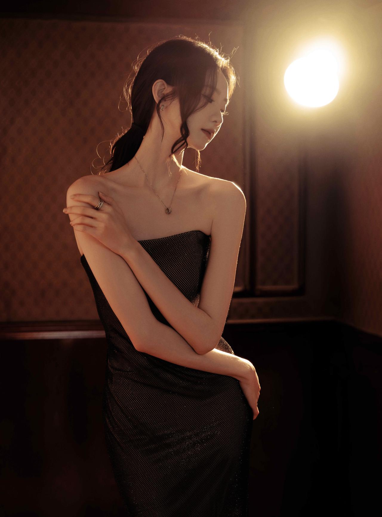 张艺凡这套造型真的把“清冷贵气”焊在身上了!一袭黑色网纱抹胸长裙,细闪在光影里流淌,像把整个银河都穿在了身上。 利落的抹胸剪裁完美勾勒肩颈线条,搭配简约的钻饰项链,没有多余的堆砌,却把高级感拉满,是暗夜中自带故事感的黑天鹅没错了。
