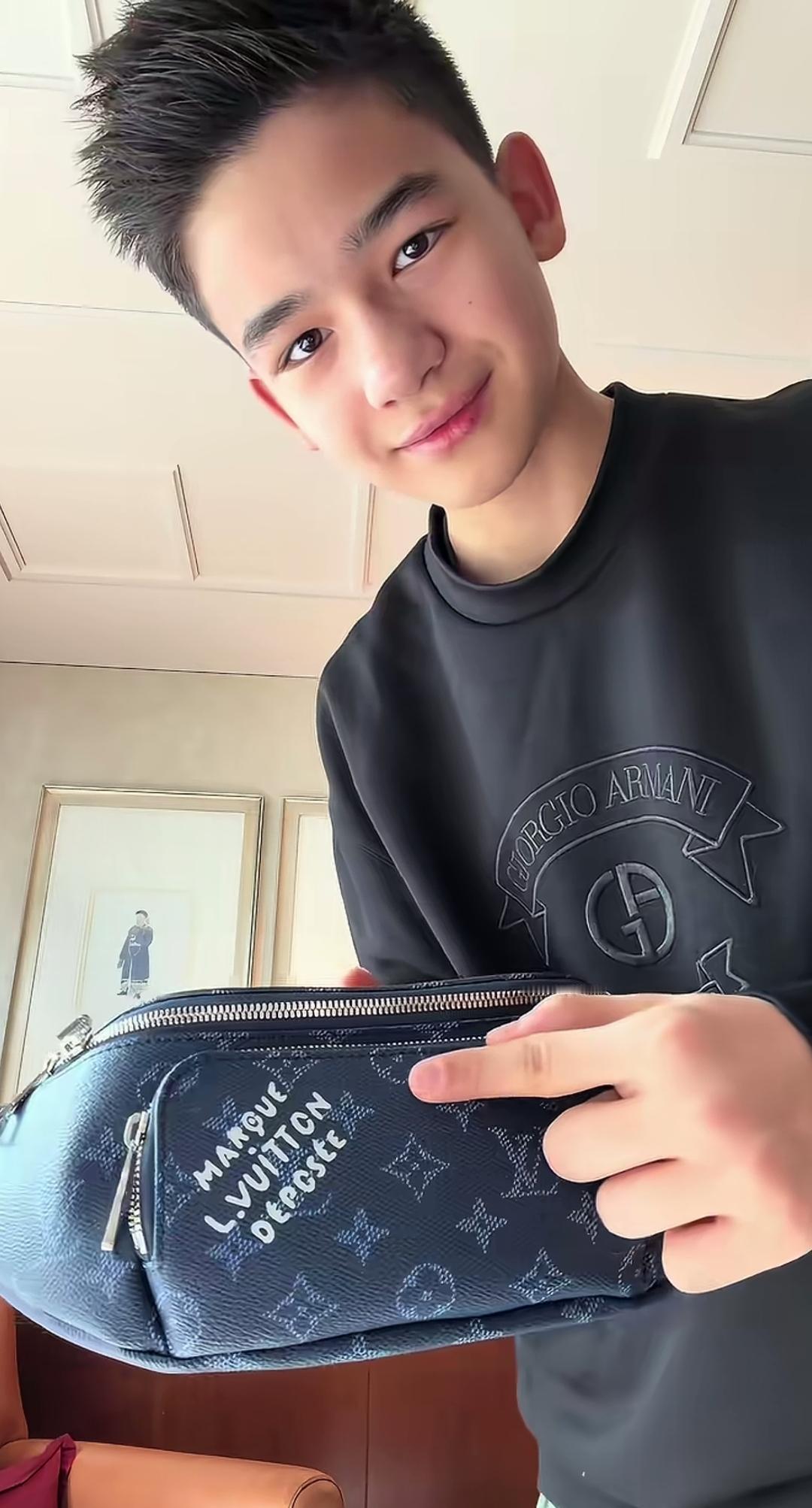 他拿着妈妈帮他买的名牌鞋子、衣服、包包、发油,在镜头前展示,每件物品必须展示品牌标志,他才善罢甘休。