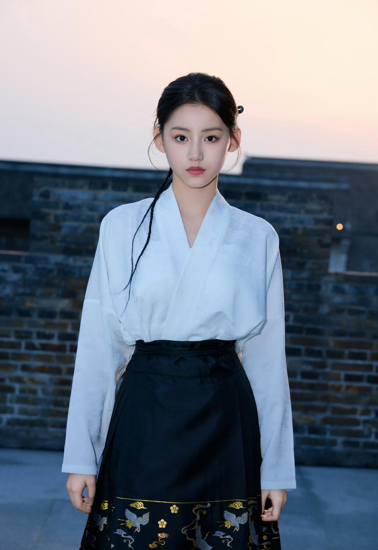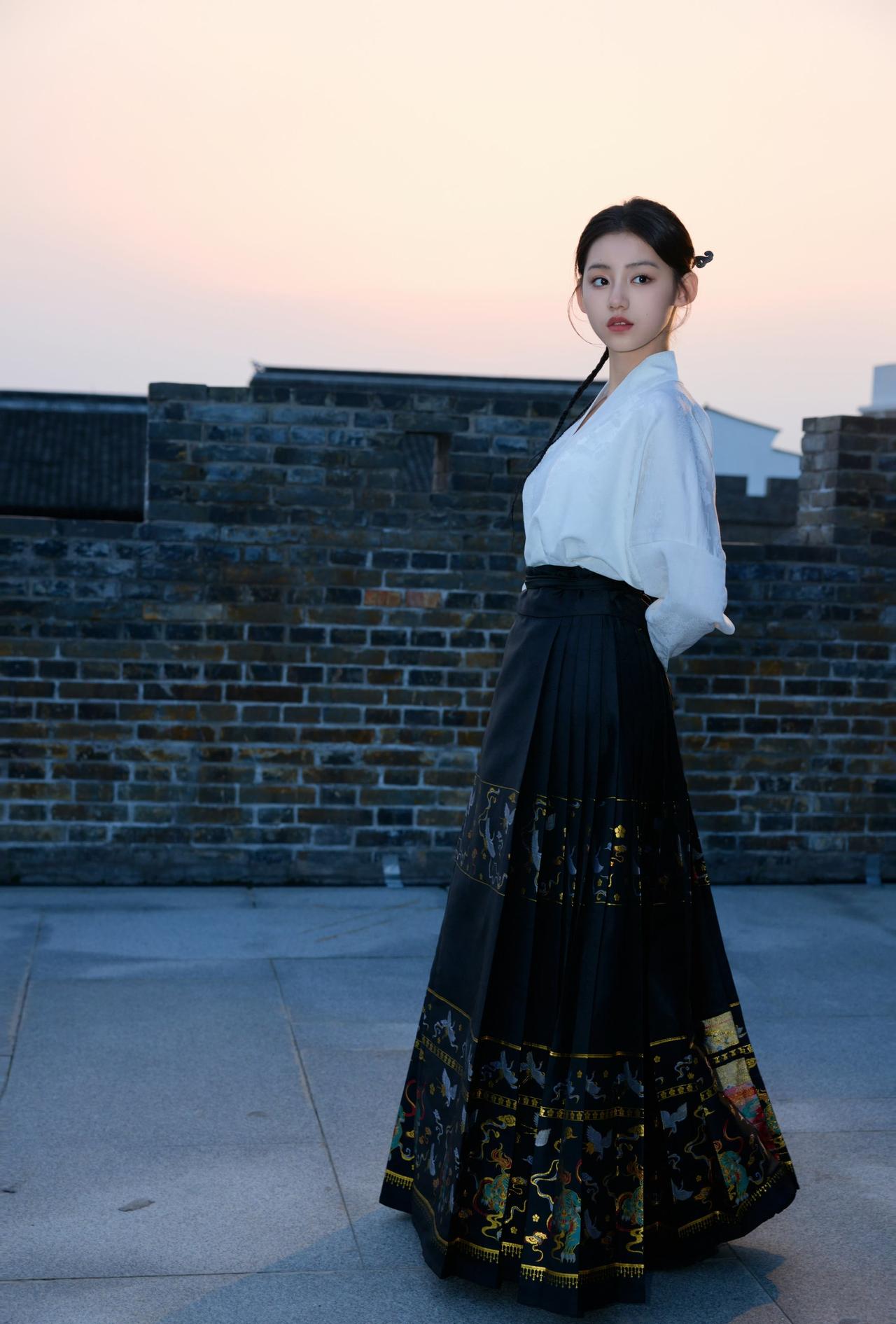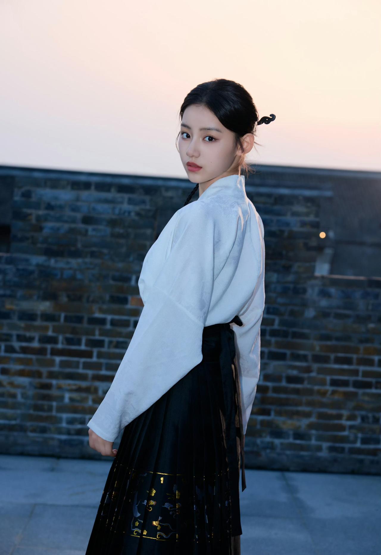 素白交领上衣+黑底金纹马面裙,极简的上衣衬得裙身的烫金纹样更显精致,黑白配色干净利落,低调又有质感。刘佳玺