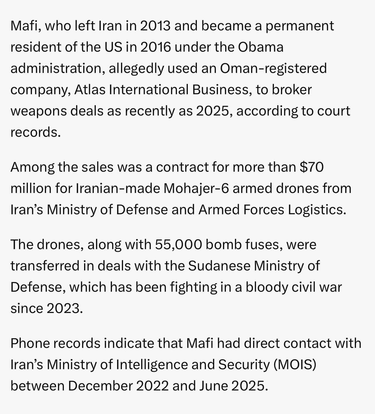 一名居住在洛杉矶的持有绿卡的伊朗籍女商人因涉嫌在美国的平静生活中充当中间人,向苏丹军方兜售伊朗武器而在洛杉矶国际机场被捕,就在她即将启程前往土耳其的前一刻,被控兜售