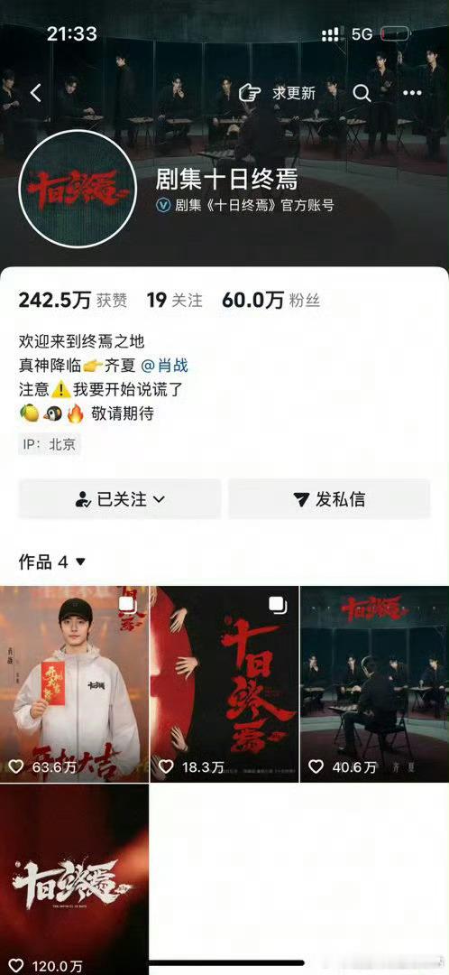 肖战《十日终焉》官抖粉丝破60万咯,首个视频点赞更是超120万了!今晚安吉尔直播