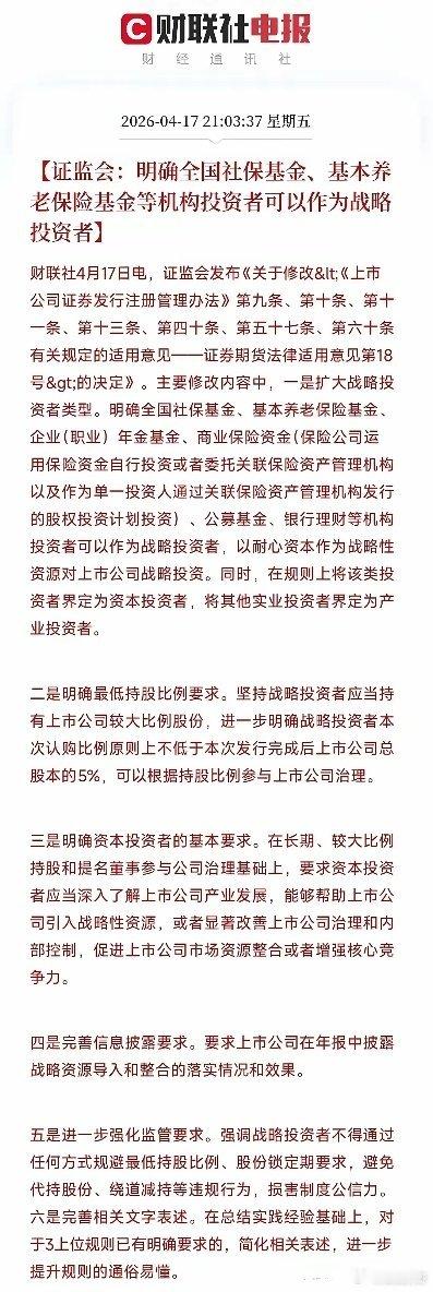 证监会新规放大招,彻底解决了资金蓄水池的问题!万亿长钱入市,A股迎来真正的“活水”!4月17日证监会新规直接打通社保、养老金、公募等万亿长钱入市通道,明确战略投资者持股不低于5%,倒逼“长钱长投”。这不仅是给A股建了源源不断的蓄水池,更从根源上解决了市场“资金短炒、牛短熊长”的顽疾。新规还强化了信息披露与监管,杜绝绕道减持,让机构真正成为上市公司的长期股东。不过,目前文件未提及量化交易改革,但万亿级别的长期资金进场,将重塑市场定价逻辑,倒逼A股走向价值投资。当长钱不再是口号,A股的慢牛根基,正在被一步步筑牢。