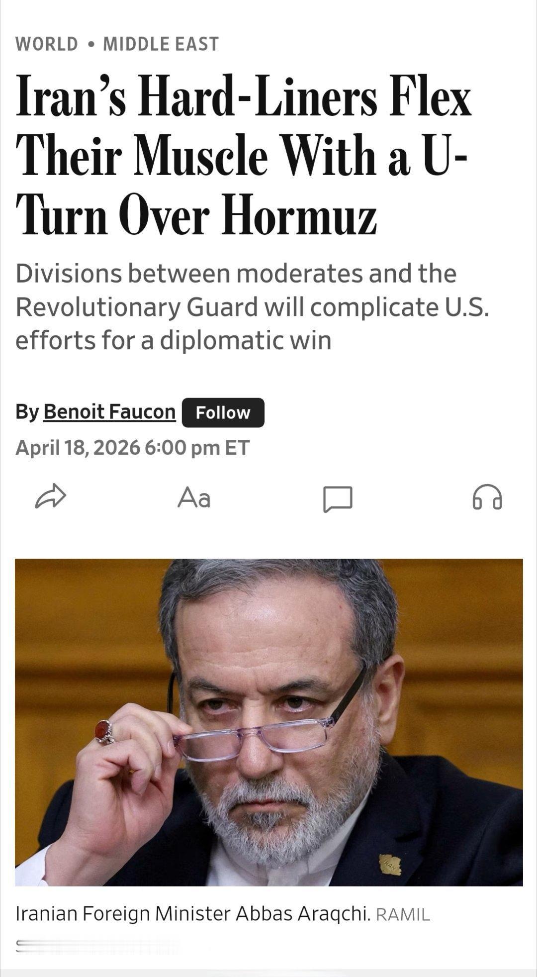 据美国《华尔街日报》报道,伊朗强硬派势力对决策进程的影响力日益增强,使得伊朗在与美国谈判中维持统一立场的努力变得愈发复杂。近期关于霍尔木兹海峡地位问题的政策调整,暴露了伊朗外交领导层与该国军方(尤其是伊朗伊斯兰革命卫队)之间的分歧。伊朗外交部长阿拉格奇在宣布霍尔木兹海峡开放前未与伊朗伊斯兰革命卫队协调,这一举动激怒了该组织。
