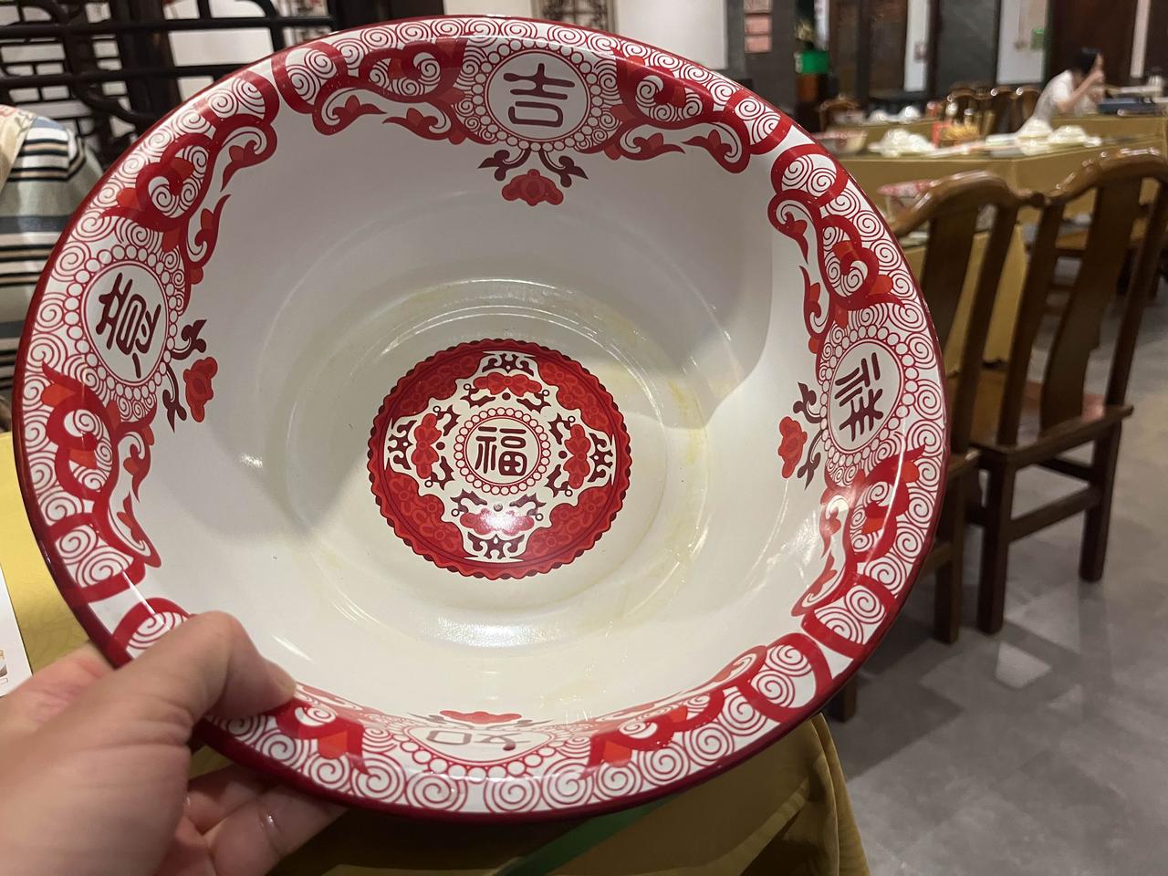 这个湘菜馆装水的盆也太特别了,80年代复古的东西,一开始我还以为装饭或装汤的!