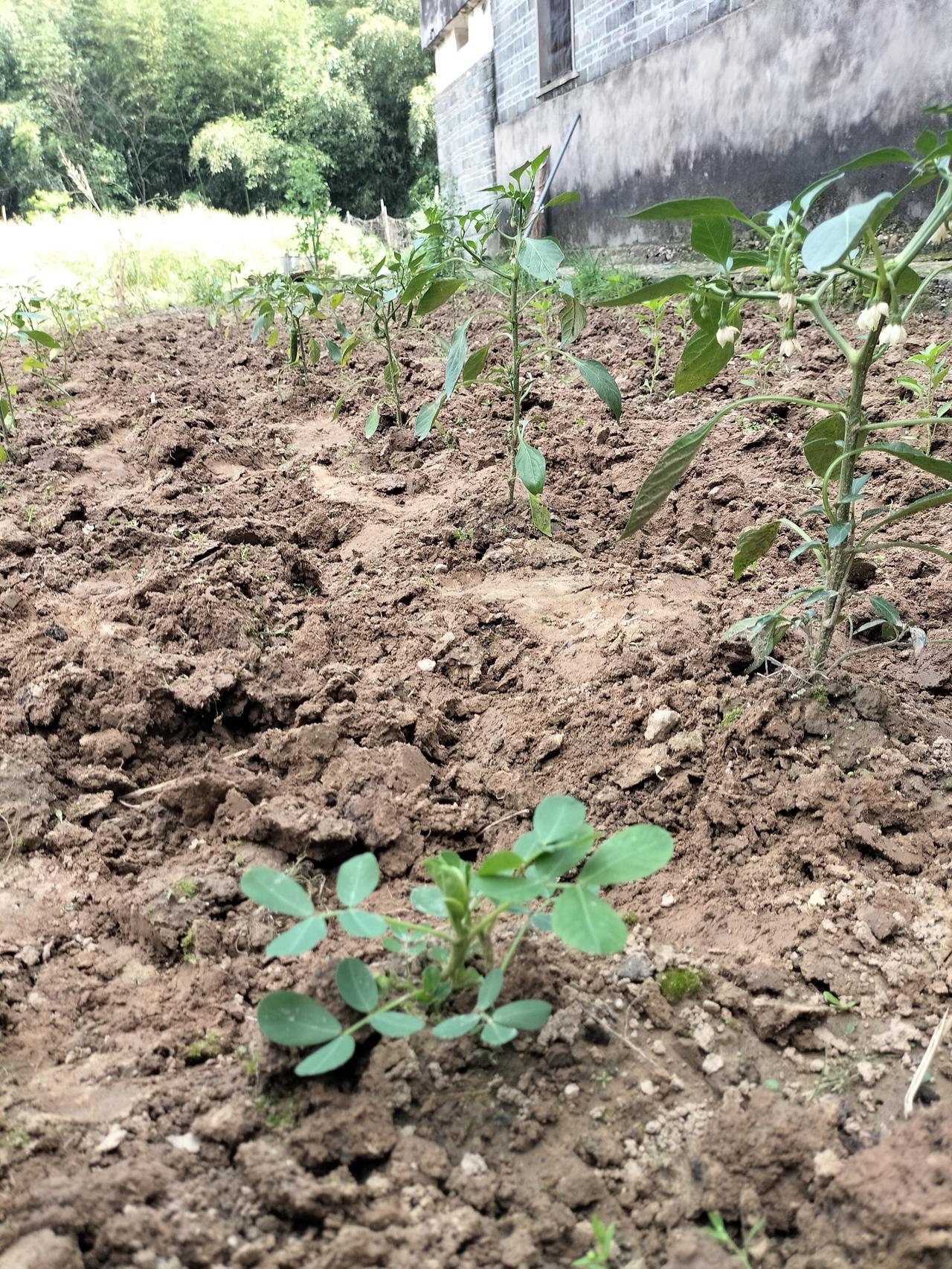 我看到这棵花生苗,有所启发,辣椒苗中间是可以种花生的,而且我种的辣椒苗两边距离很宽,于是今天下午我播种花生颗粒了,就种在辣椒苗中间。