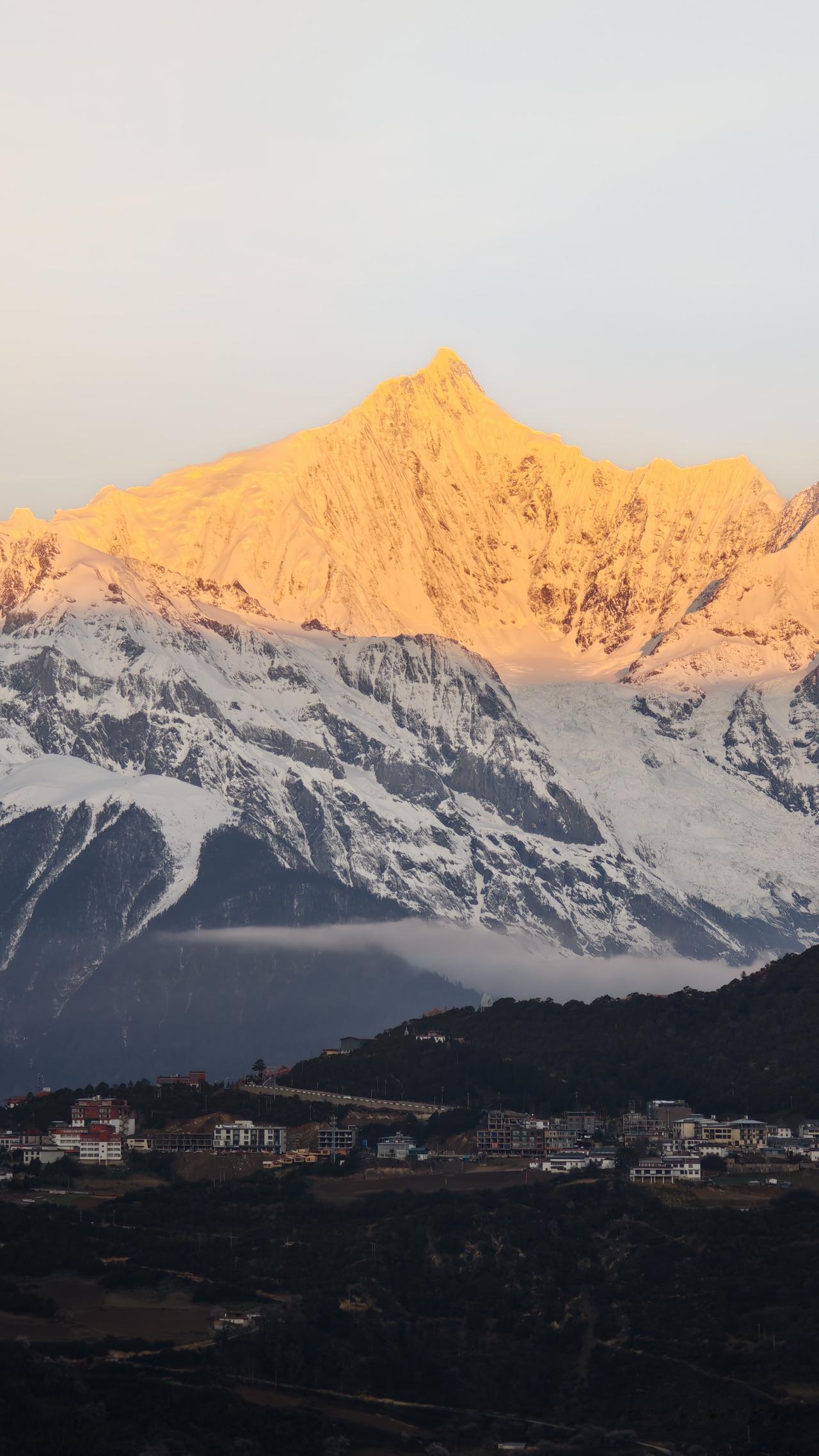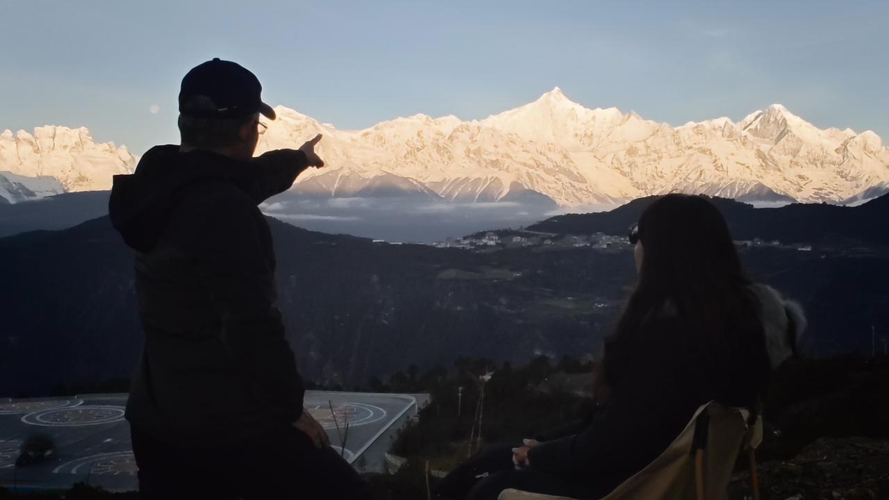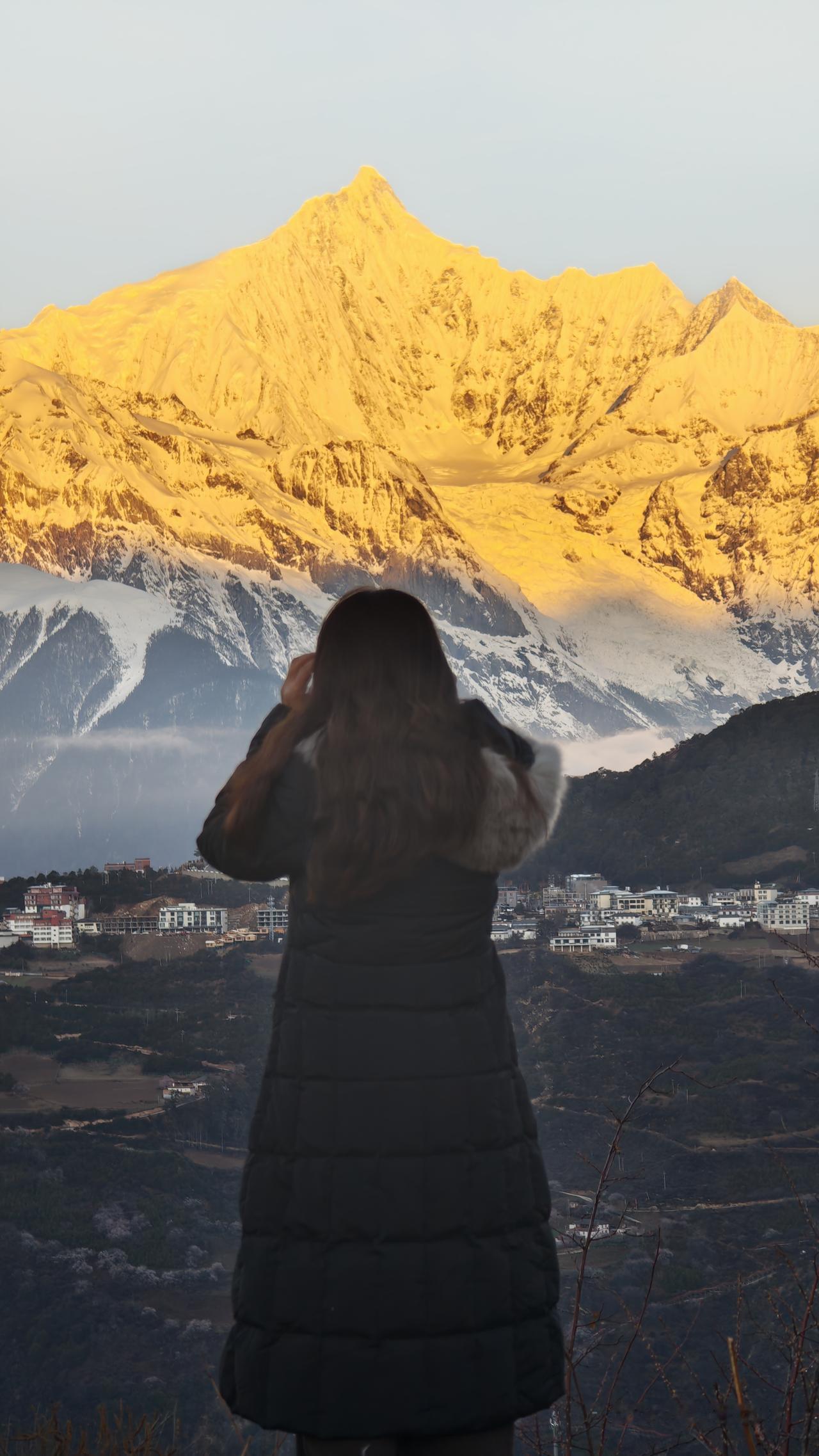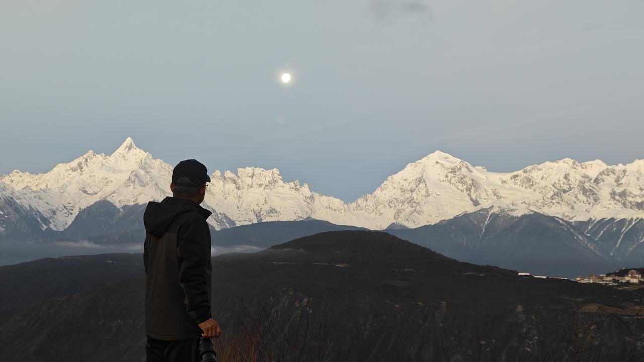 关键十五的月亮也在梅里雪山那边。哇,太给力了。日月同辉呀!不一会出现了日照金山,太壮观了。无法用言语形容。我感叹我们来的真对呀。就是多跑几百公里,也值得的。有些人来多少次都没见到雪山真容,而我们第一次来就碰到了。而且昨天下午也很好,今天上午更好。那是一通狂拍。