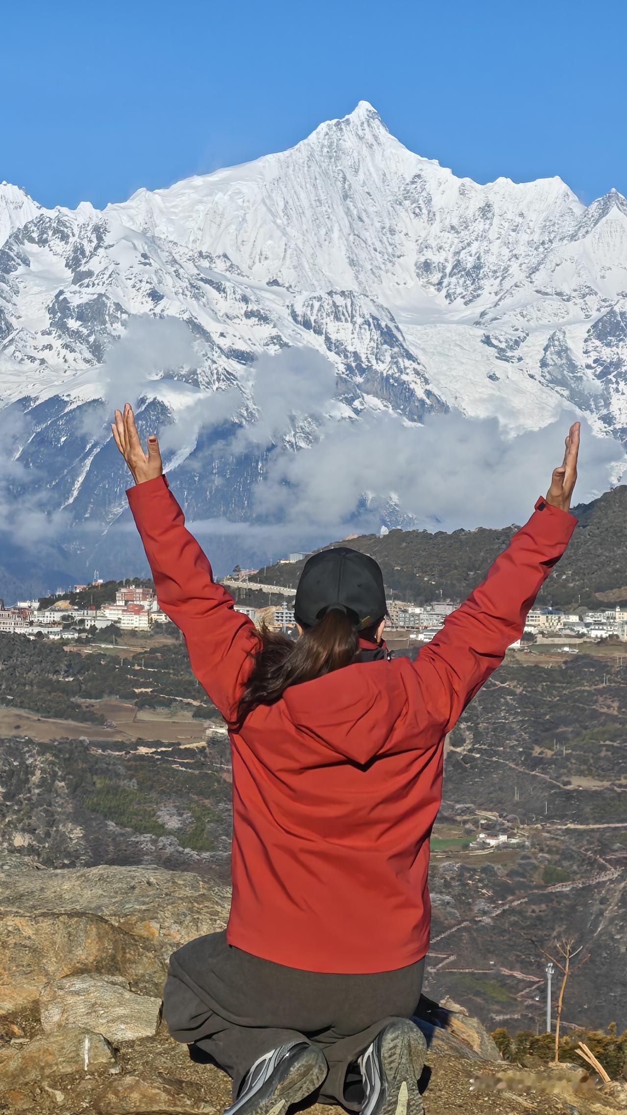 早上6:40起来。突然发现梅里雪山清晰的横陈在我们前面。太让人激动了。已经有好多人都过来拍摄。本来我们昨天看天气预报,觉得今天希望不大。没想到今天这么运气好。