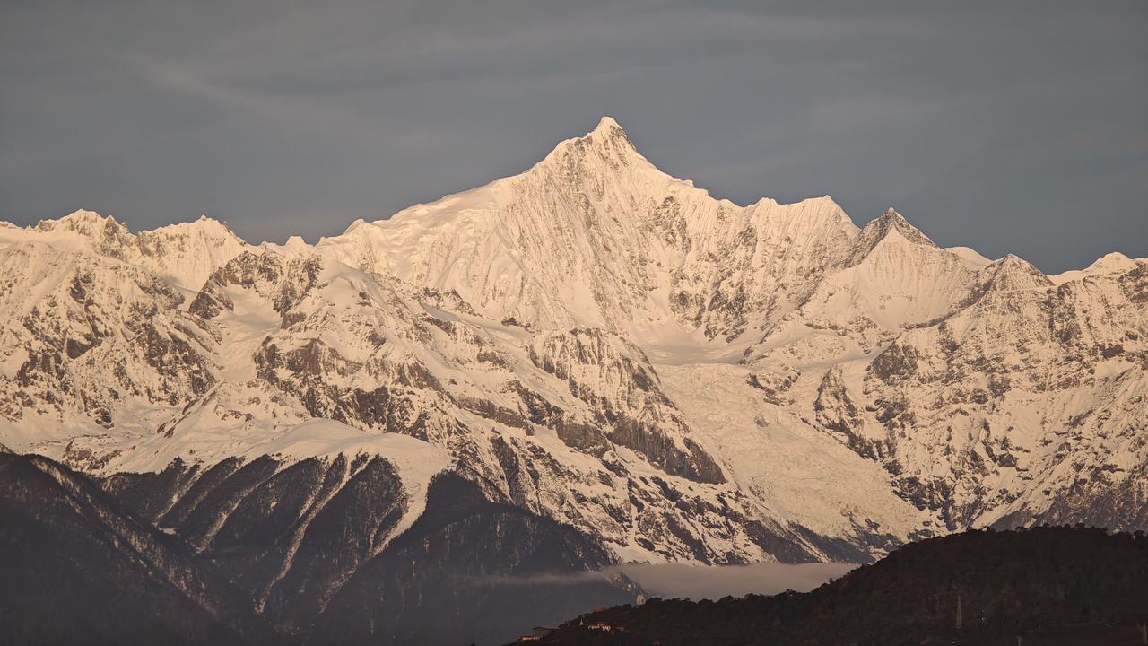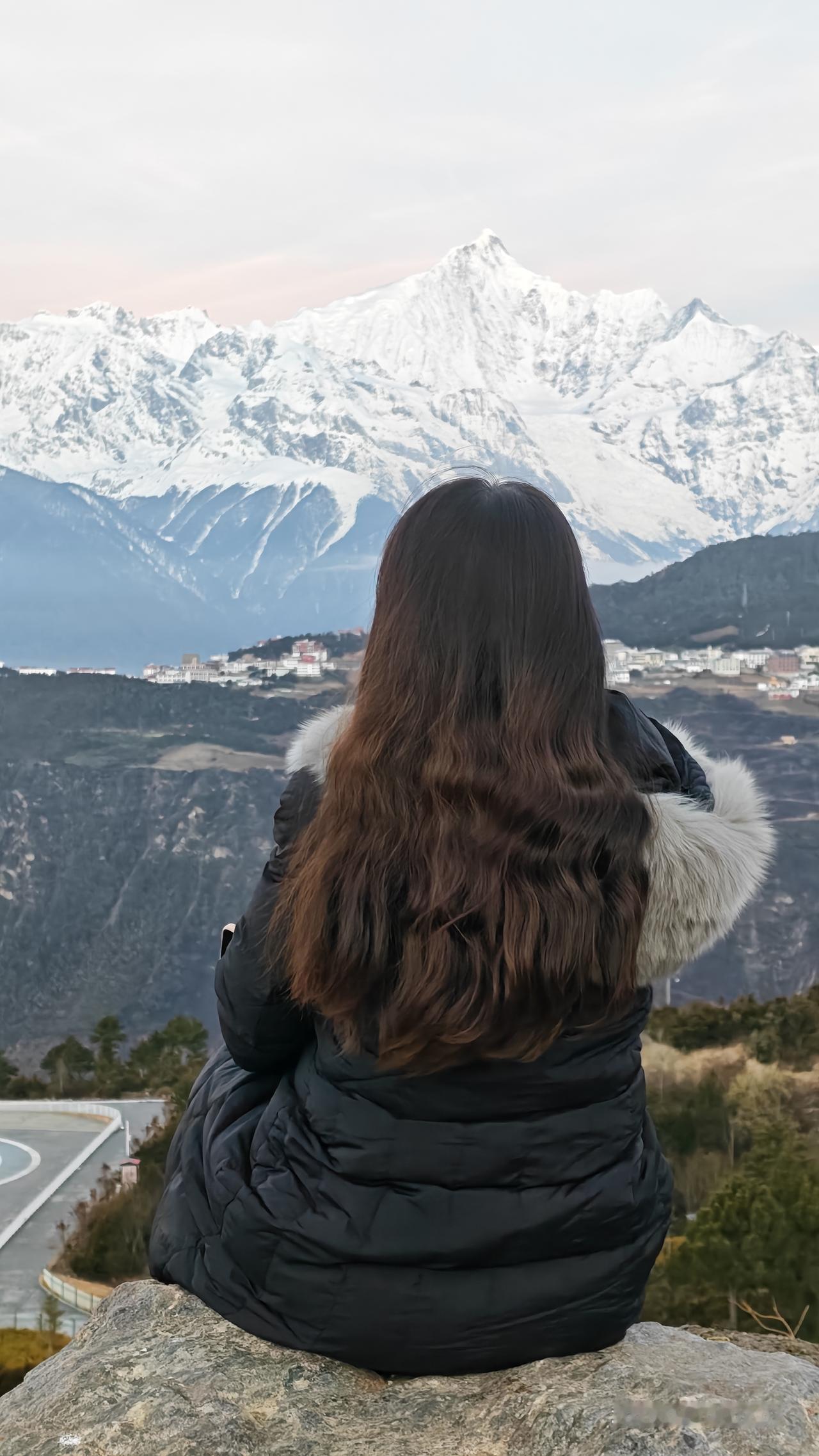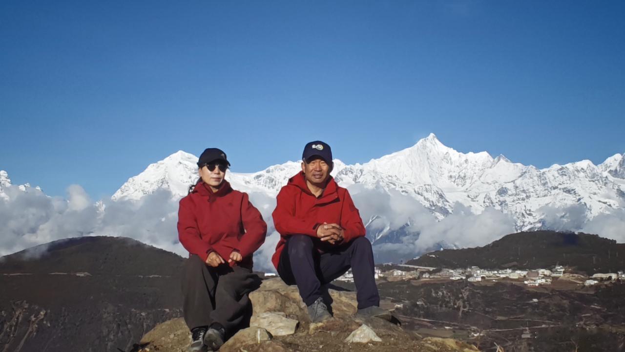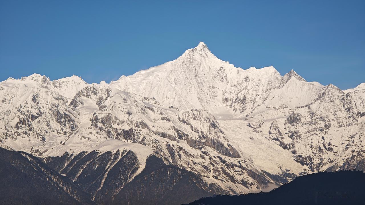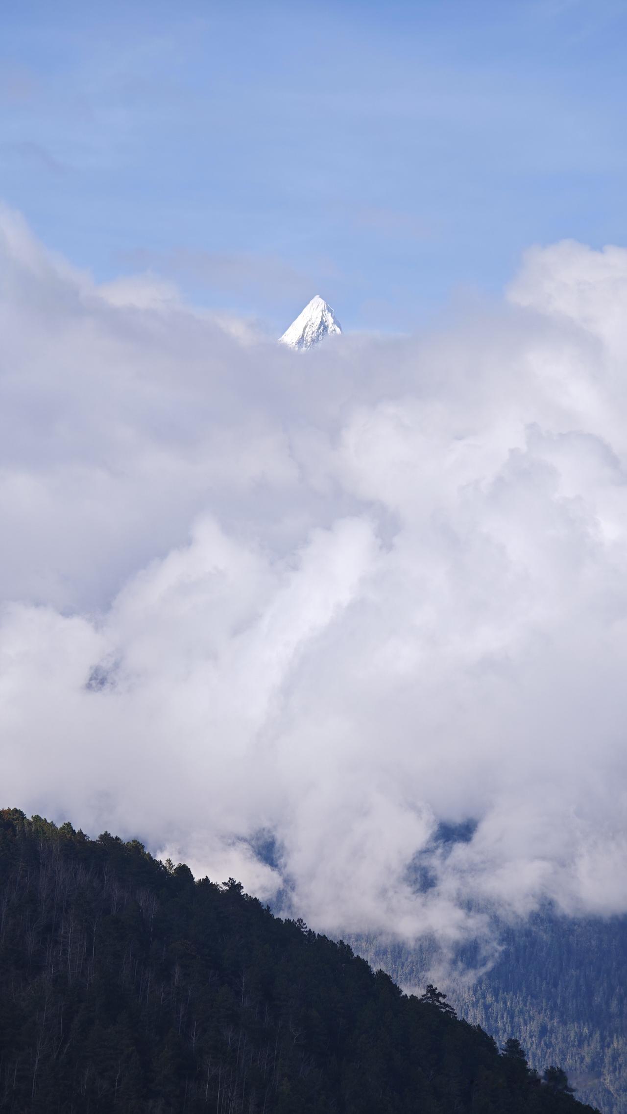 之后上大坡到飞来寺观景台。但是这时一团浓云已经遮住雪山。偶尔有几个峰尖露出来,但很长时间,主峰一直藏在云朵里。依依不舍的向下走。原来沿着214国道有好多地方都能看。路边也有停车场。但整体山峰永远看不到,能看到露出来的一部分山体。这次雨崩徒步就不去了,等下一次吧。