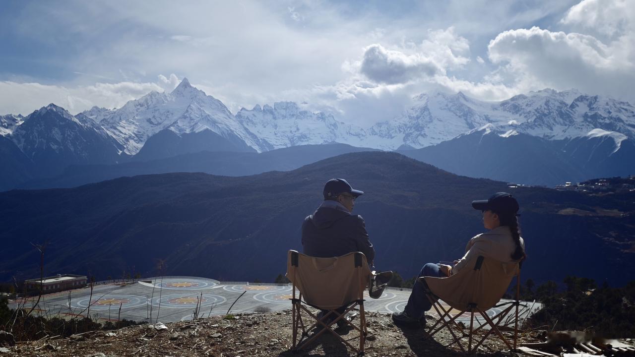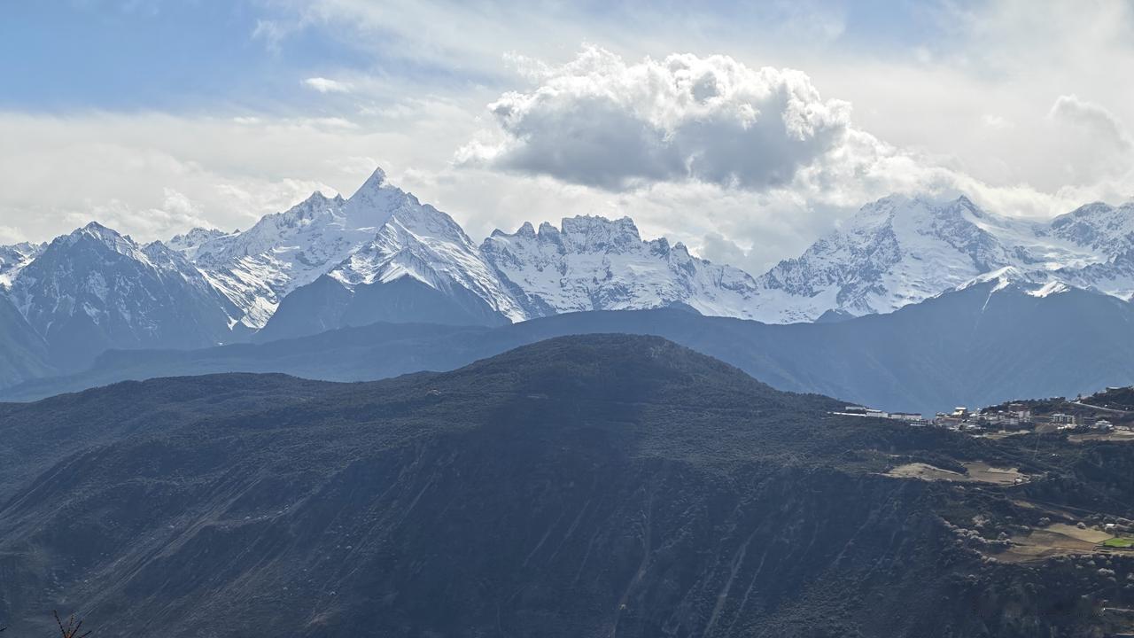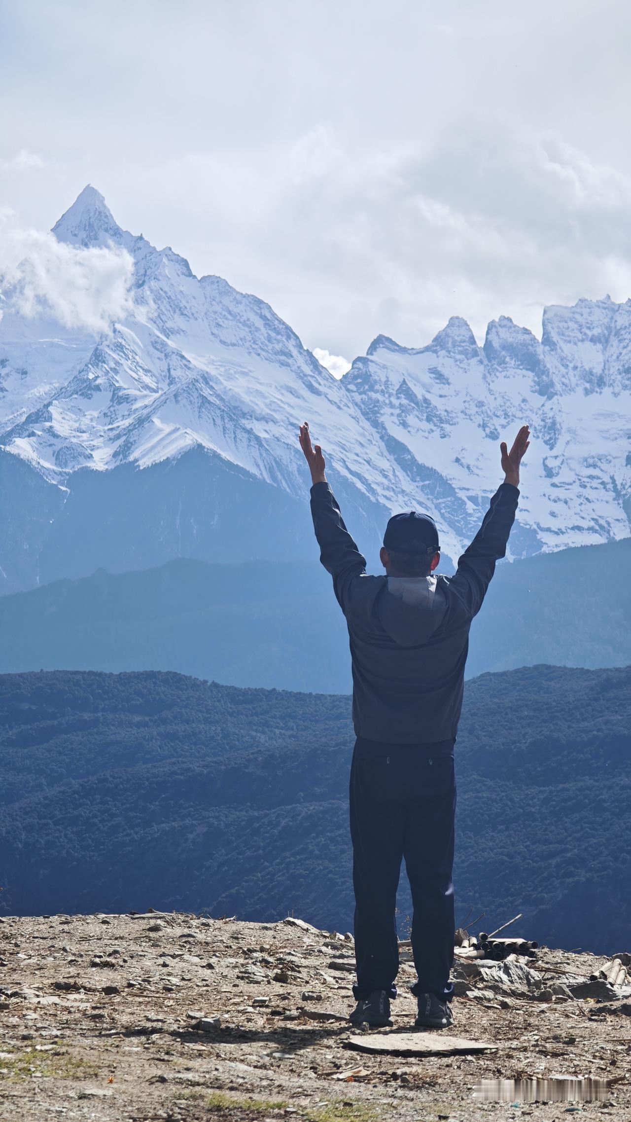 上去之后,很快就看到了朝思暮想的雪山。梅里雪山位于中国云南省德钦县,是藏传佛教著名的朝圣地之一,被誉为“雪山之神”。梅里雪山是著名的雪山山群,位于中国云南省迪庆藏族自治州德钦县境内,地处青藏高原东南缘,是澜沧江与怒江之间一段北南走向的连续山脉,属横断山脉怒山山脉中段,梅里雪山平均海拔在6000米以上的有十三座山峰,俗称“太子十三峰”,主峰卡瓦格博峰,海拔6740米,为云南第一高峰,是至今仍未被世人征服的山峰,也是唯一一座因文化保护而禁止攀登的高峰。虽然偶尔主峰被云层笼罩,但他不断的探出头来。太美了,我们有时一阵狂拍。还在这里喝茶。看着美景,喝着茶。真的享受。