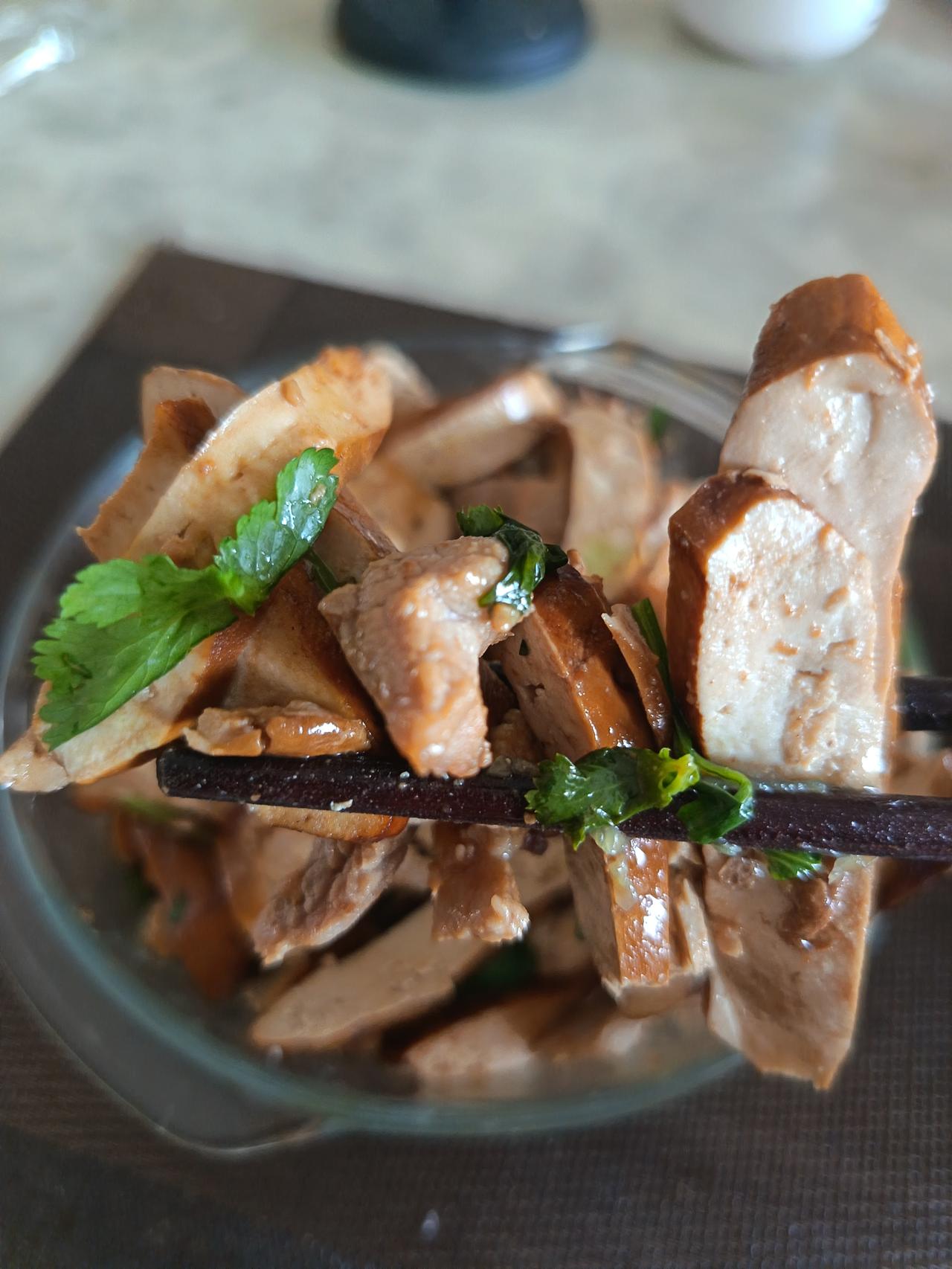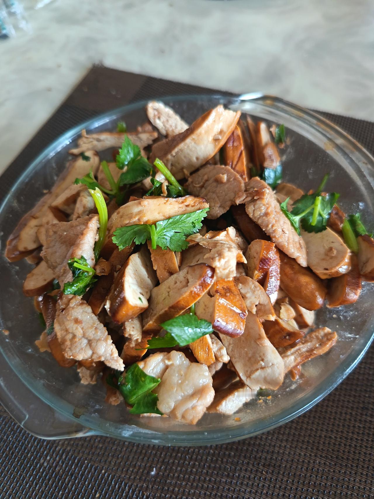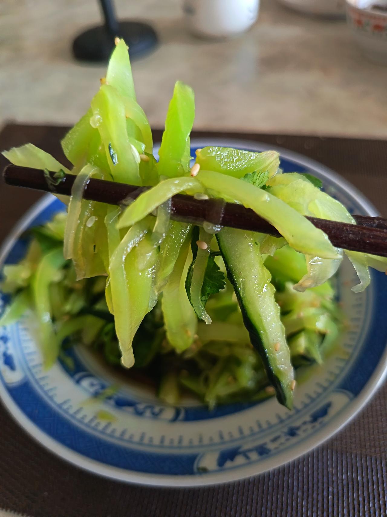 凉拌莴笋丝,放了一些香菜和芝麻,滴了几滴小磨麻油;再炒了一个香干肉片,属于一个“花荤”。