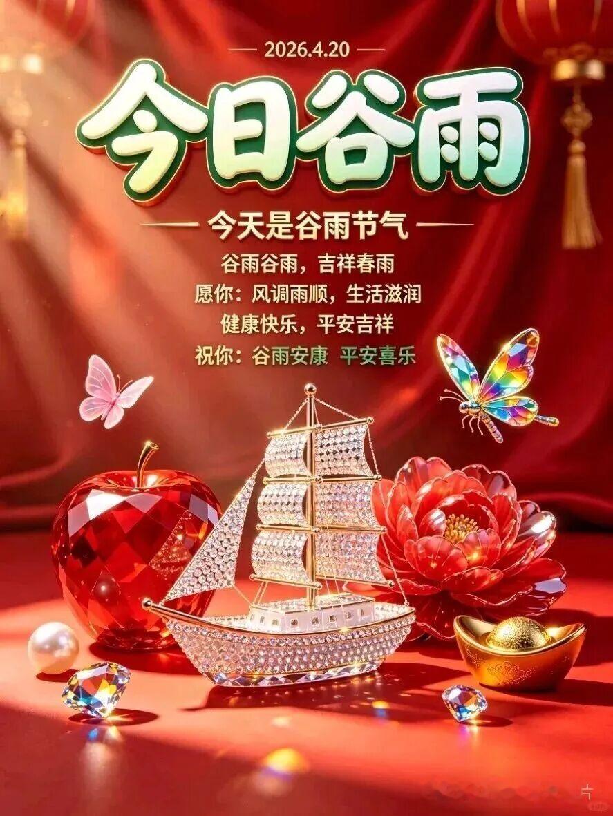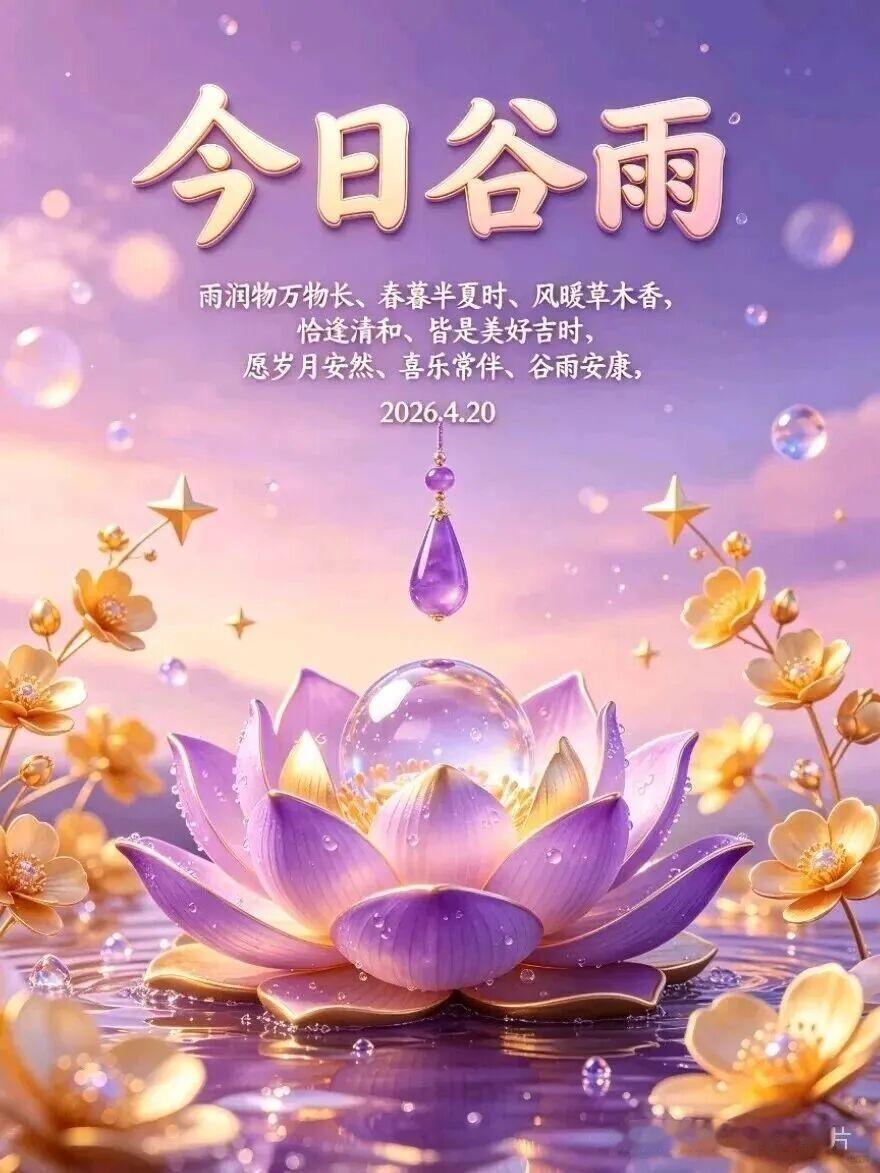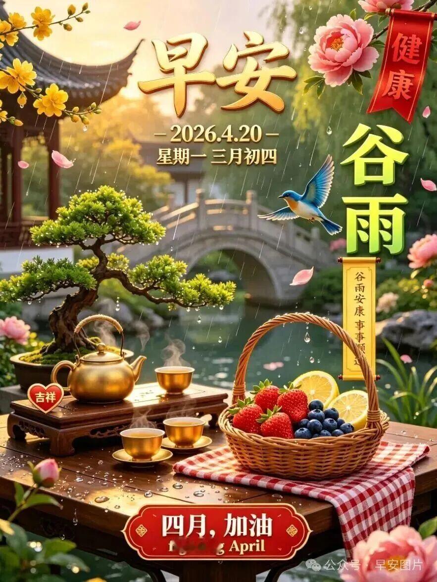 谷雨早安!谷雨临,春将暮,万物繁茂,雨润千谷,愿时光清和,年年平安,谷雨时分,细雨纷纷,风里带着暖意,雨里载着期盼,不负韶华,逐光而行,谷雨安康!🌱