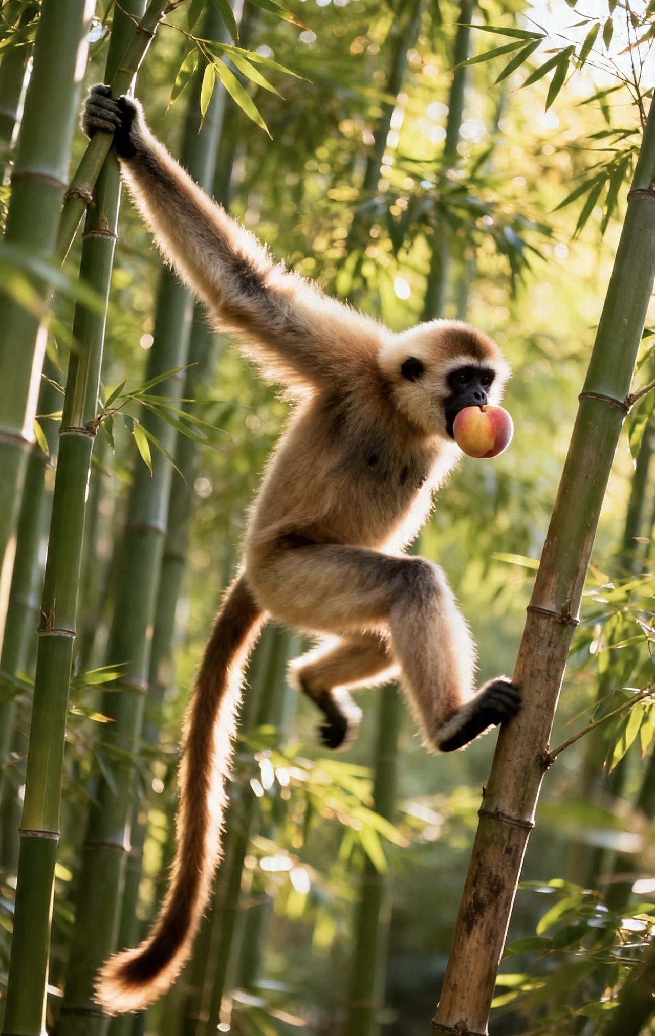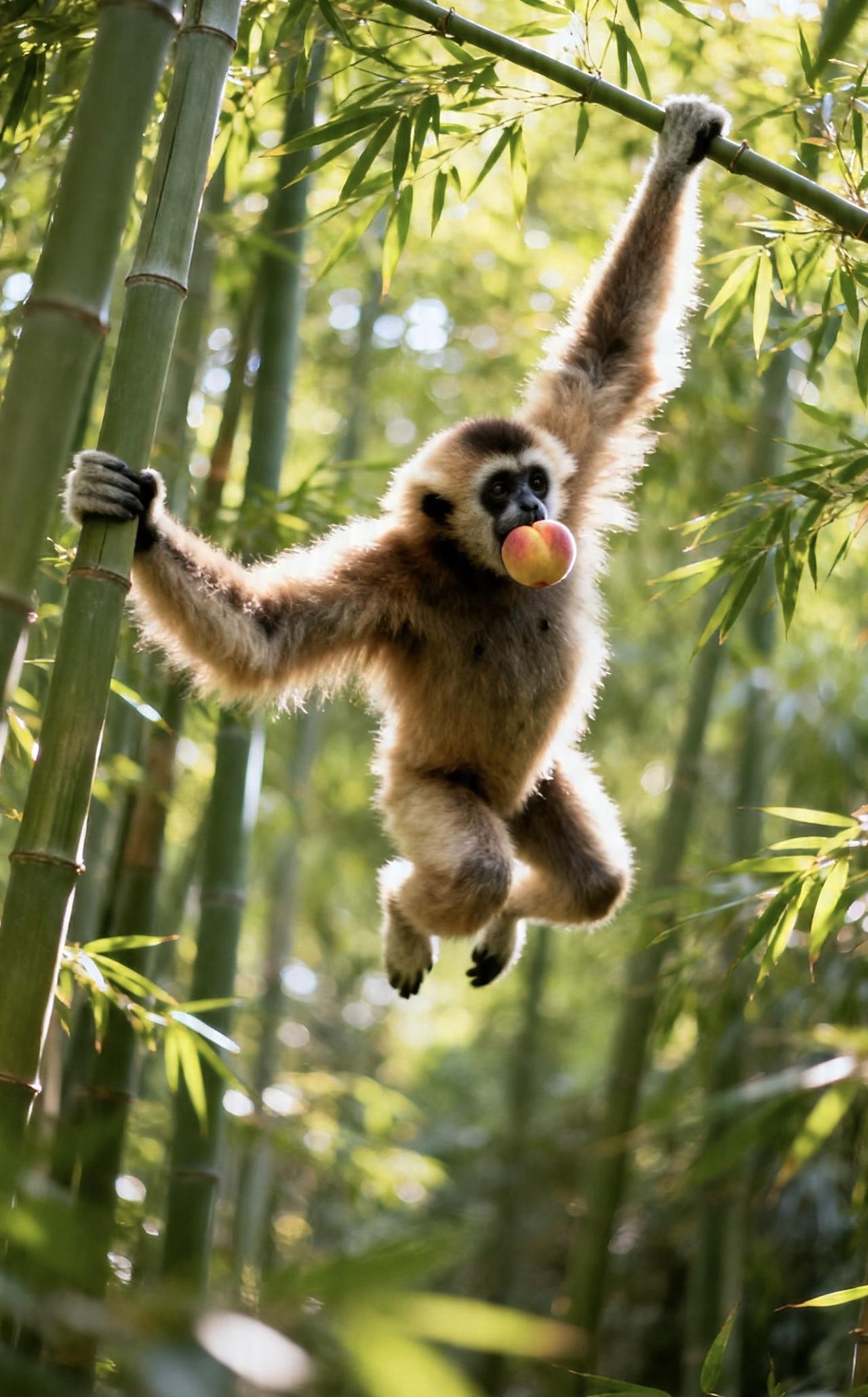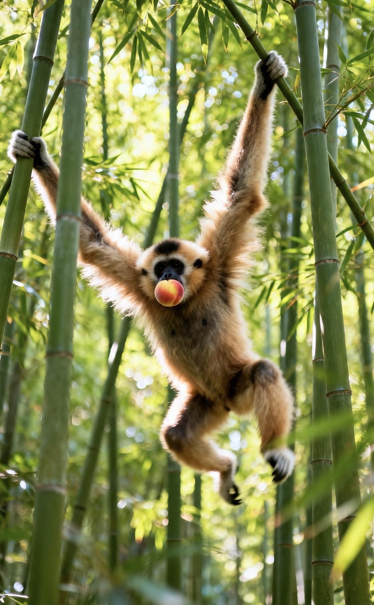 📝几只猴子在林间争抢着熟透的桃子,长臂猿身手矫健,紧随其后。它们在茂密的竹林间灵活穿梭,细长的手臂轻抓竹枝,身体顺势荡出,轻盈如飞。