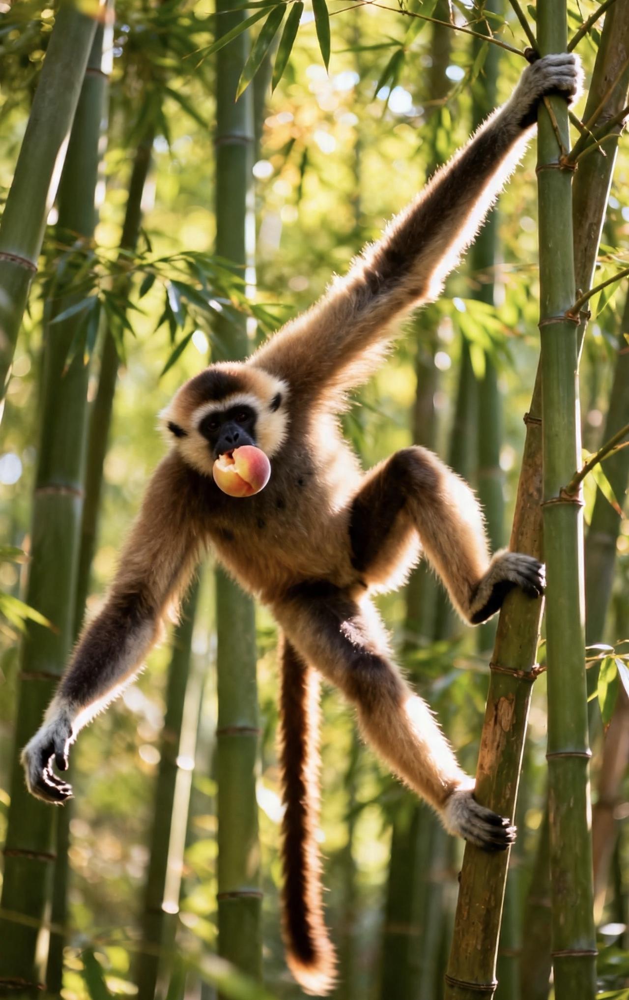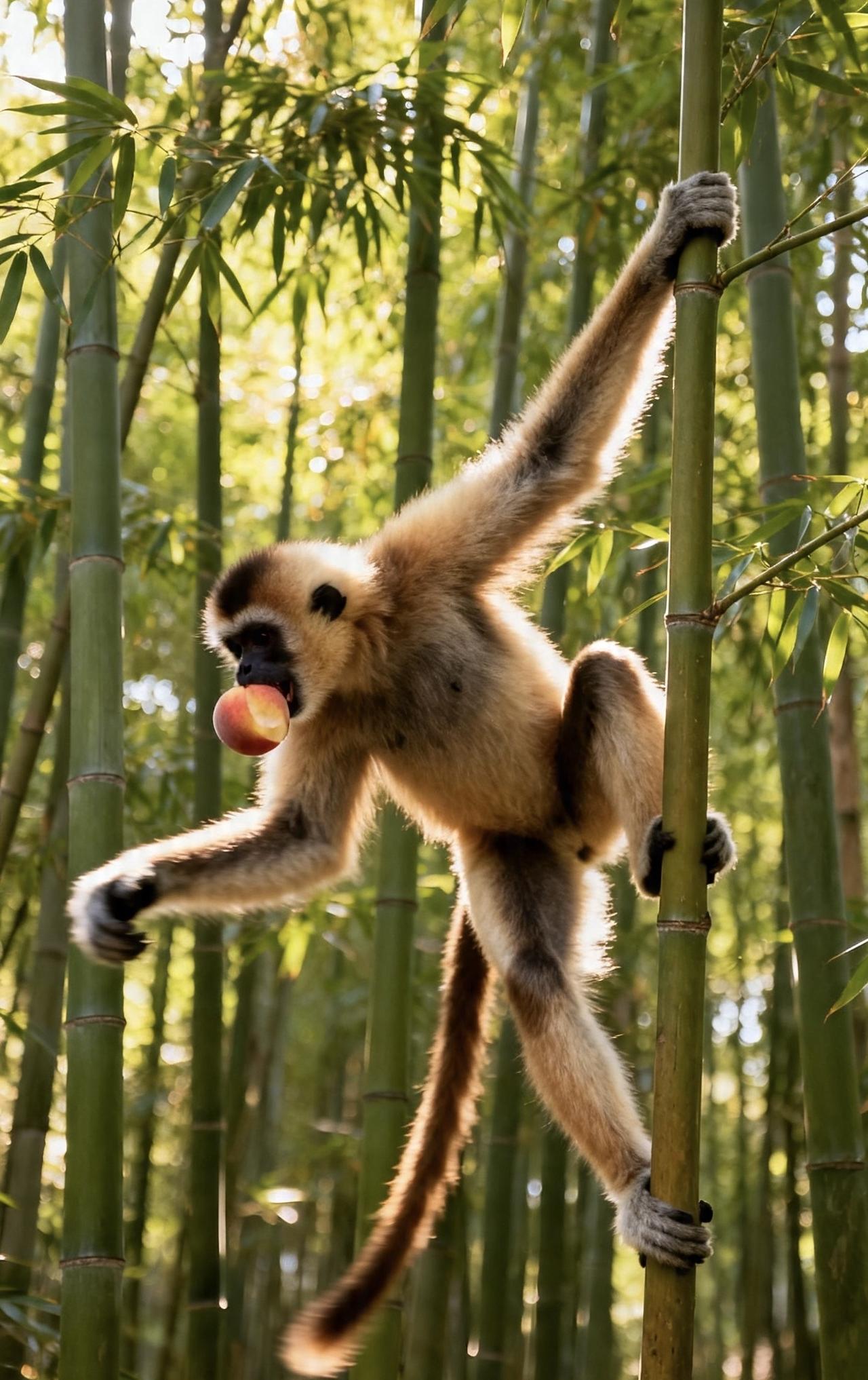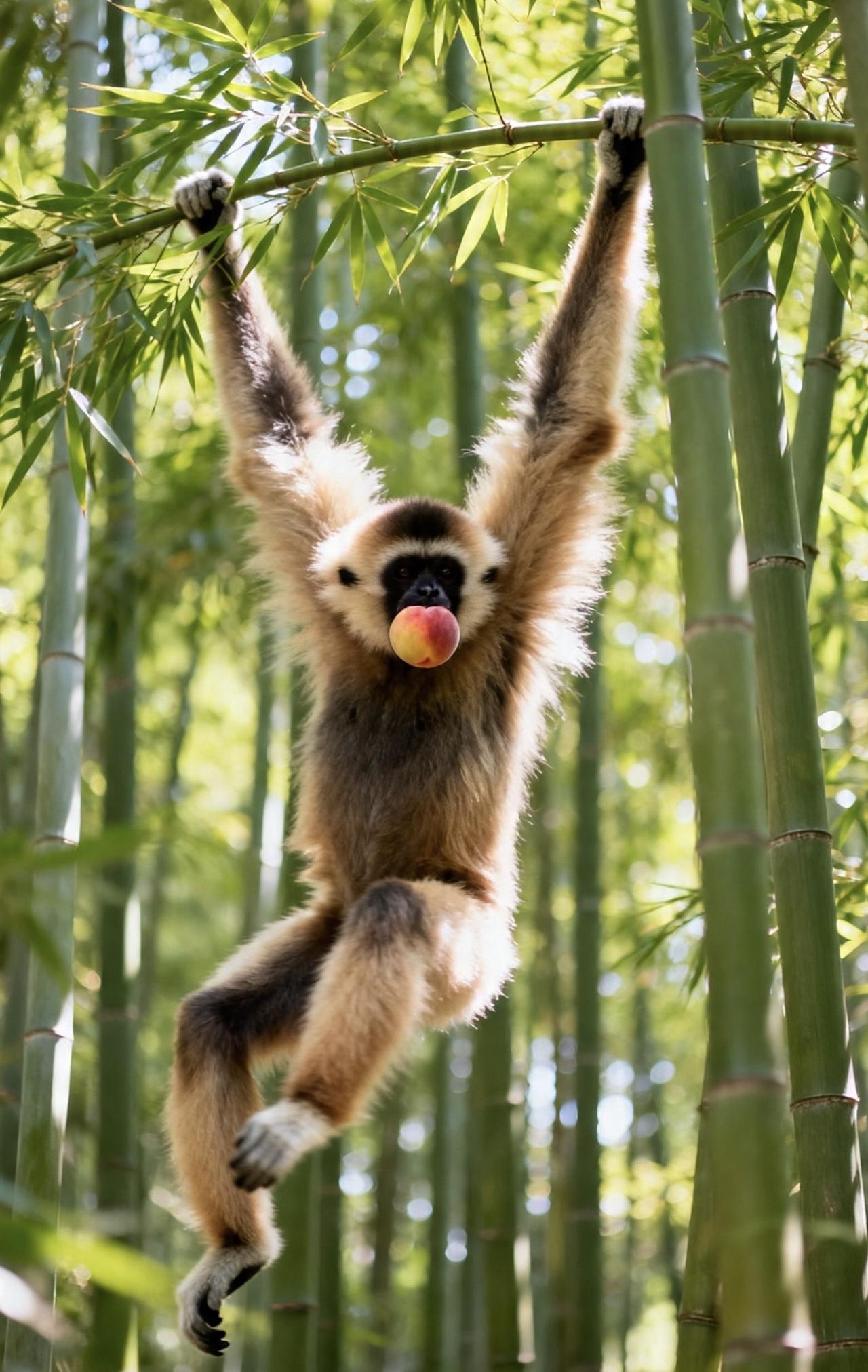 📝几只猴子在林间争抢着熟透的桃子,长臂猿身手矫健,紧随其后。它们在茂密的竹林间灵活穿梭,细长的手臂轻抓竹枝,身体顺势荡出,轻盈如飞。