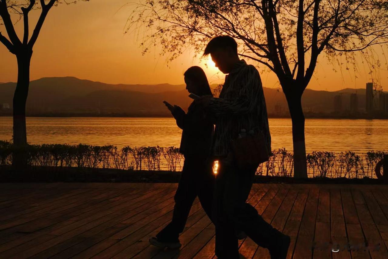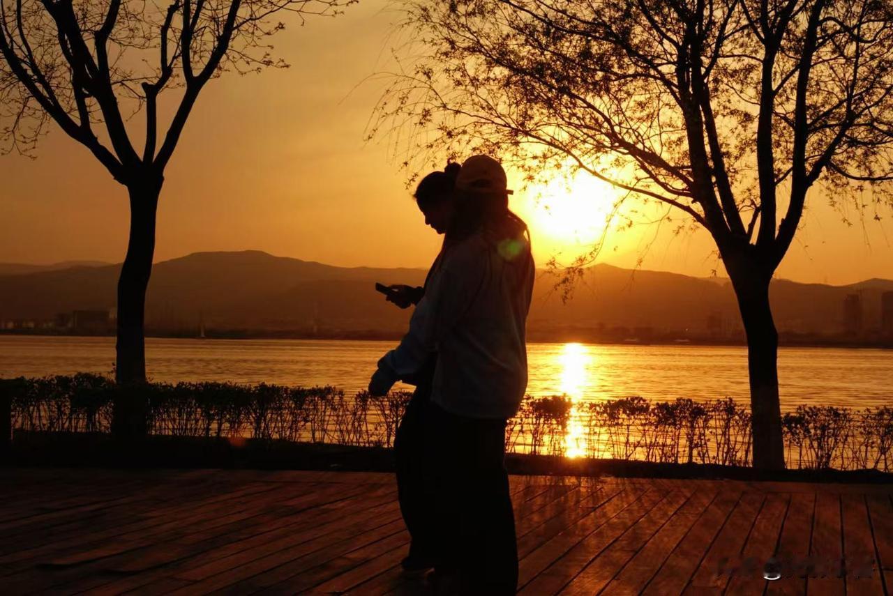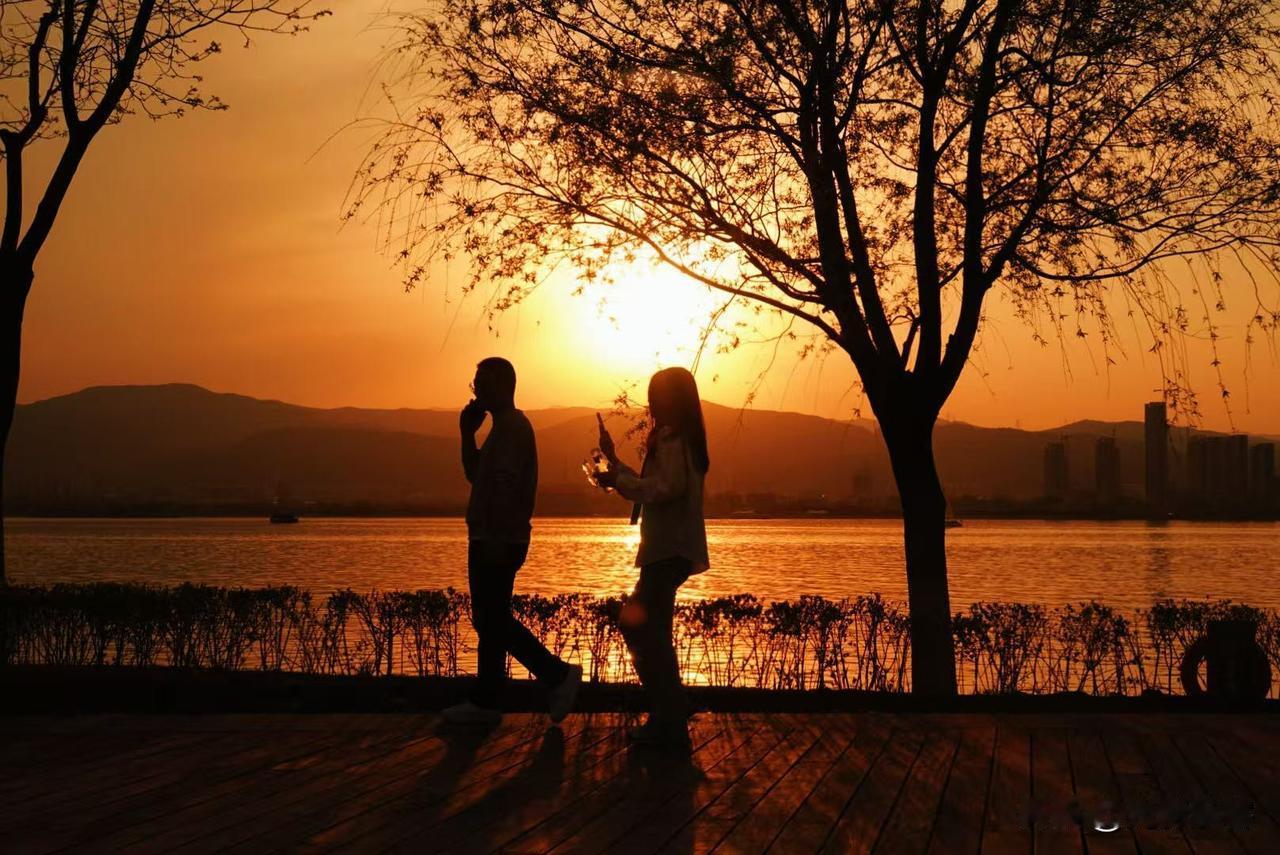 坐着湖边的条椅上,沐浴着红色的夕阳,看着太阳慢慢落下,使用相机记录下来个个剪影,似乎是在梦里,希望看清对方的面容就是看不清楚。