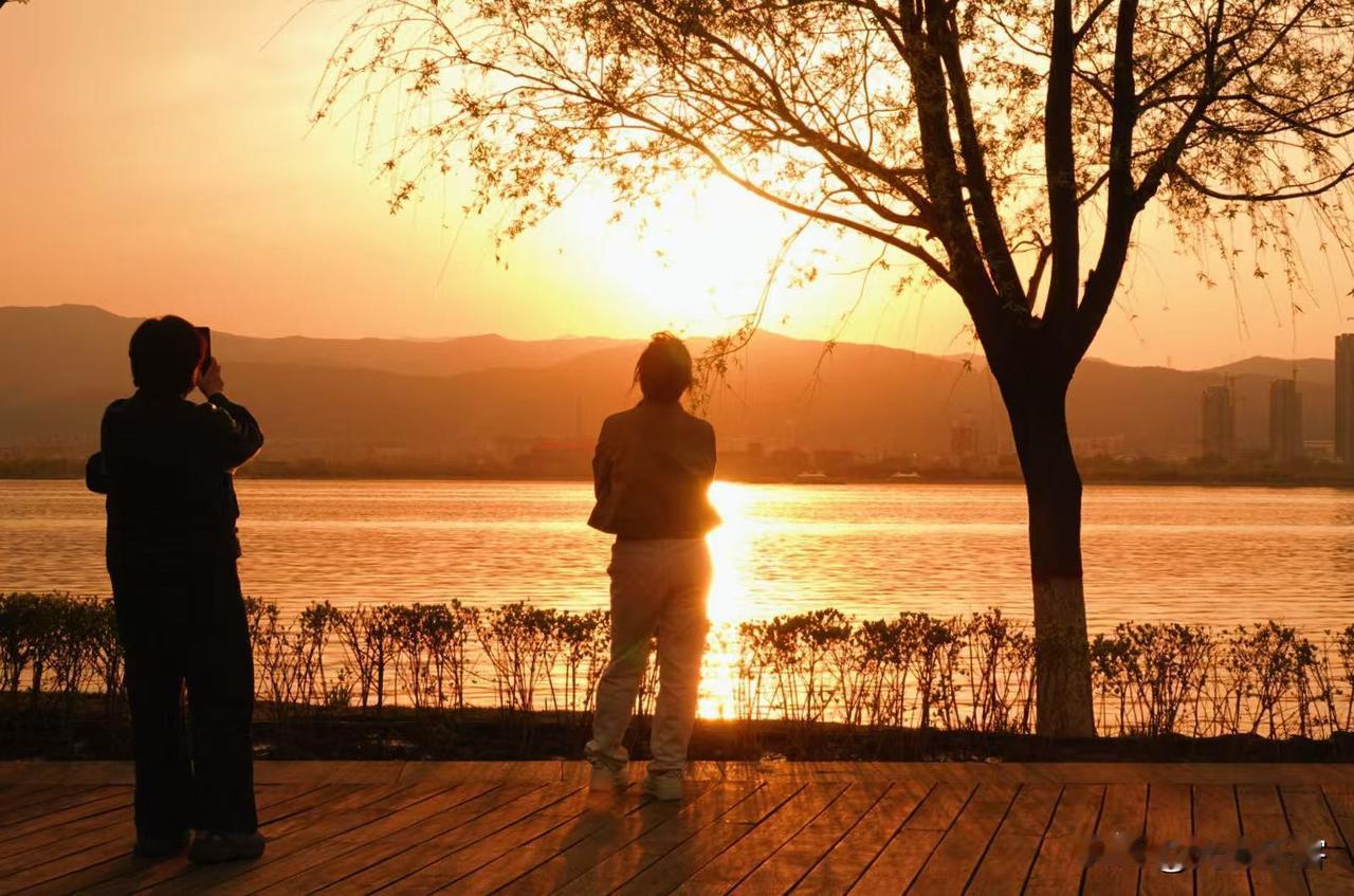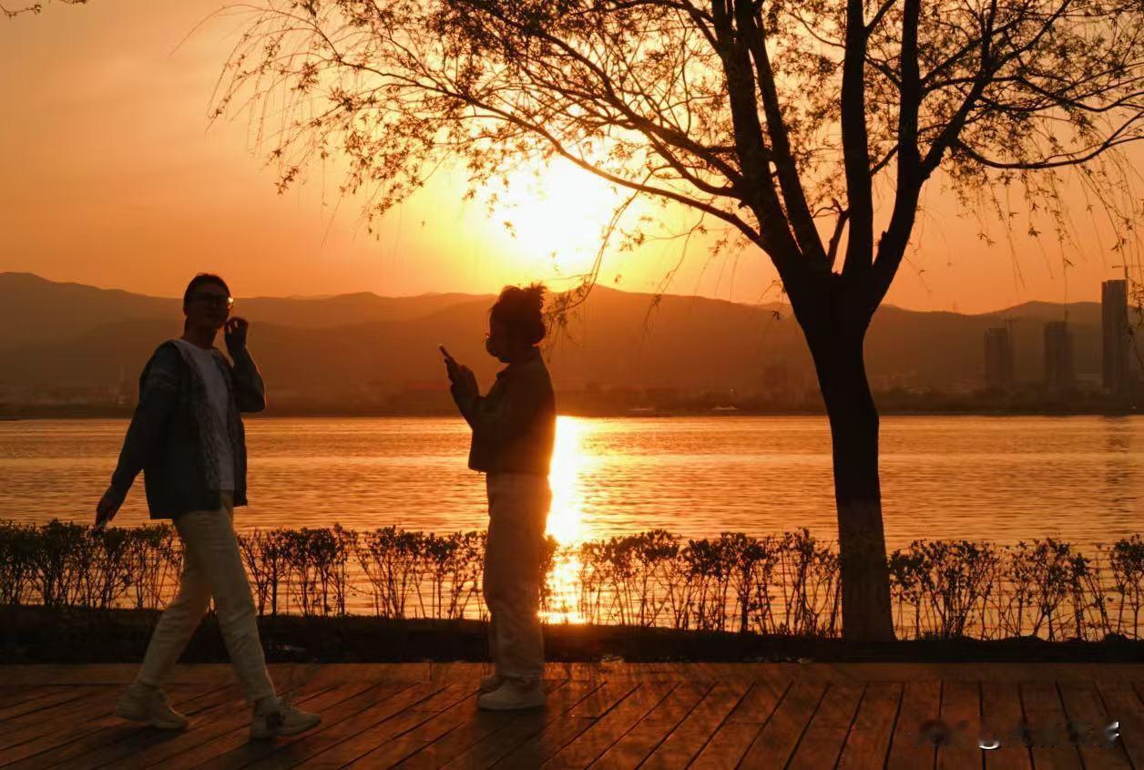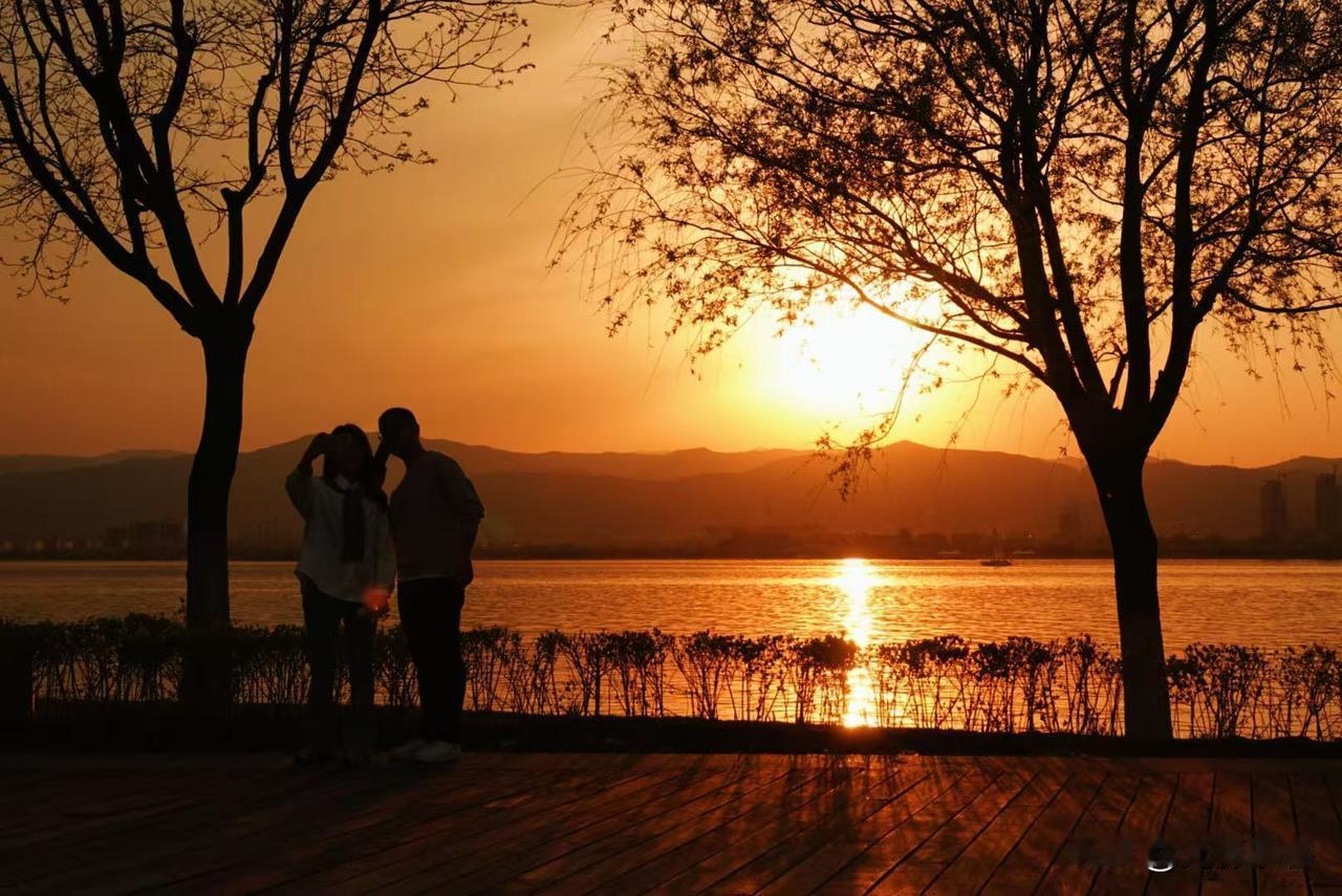 坐着湖边的条椅上,沐浴着红色的夕阳,看着太阳慢慢落下,使用相机记录下来个个剪影,