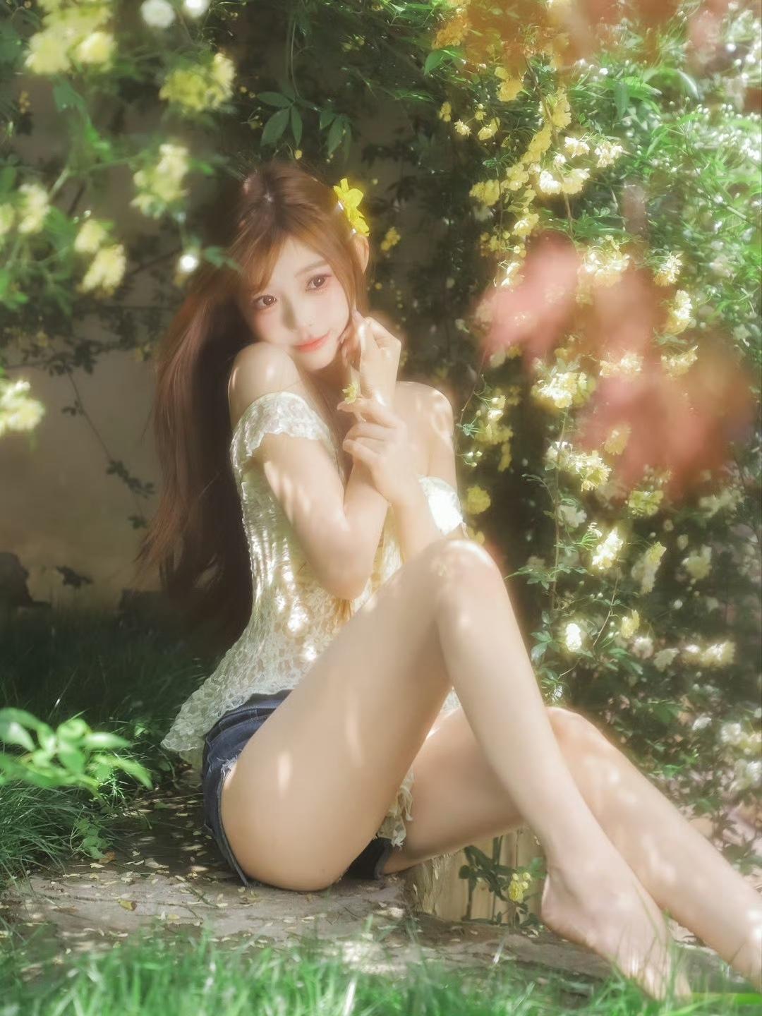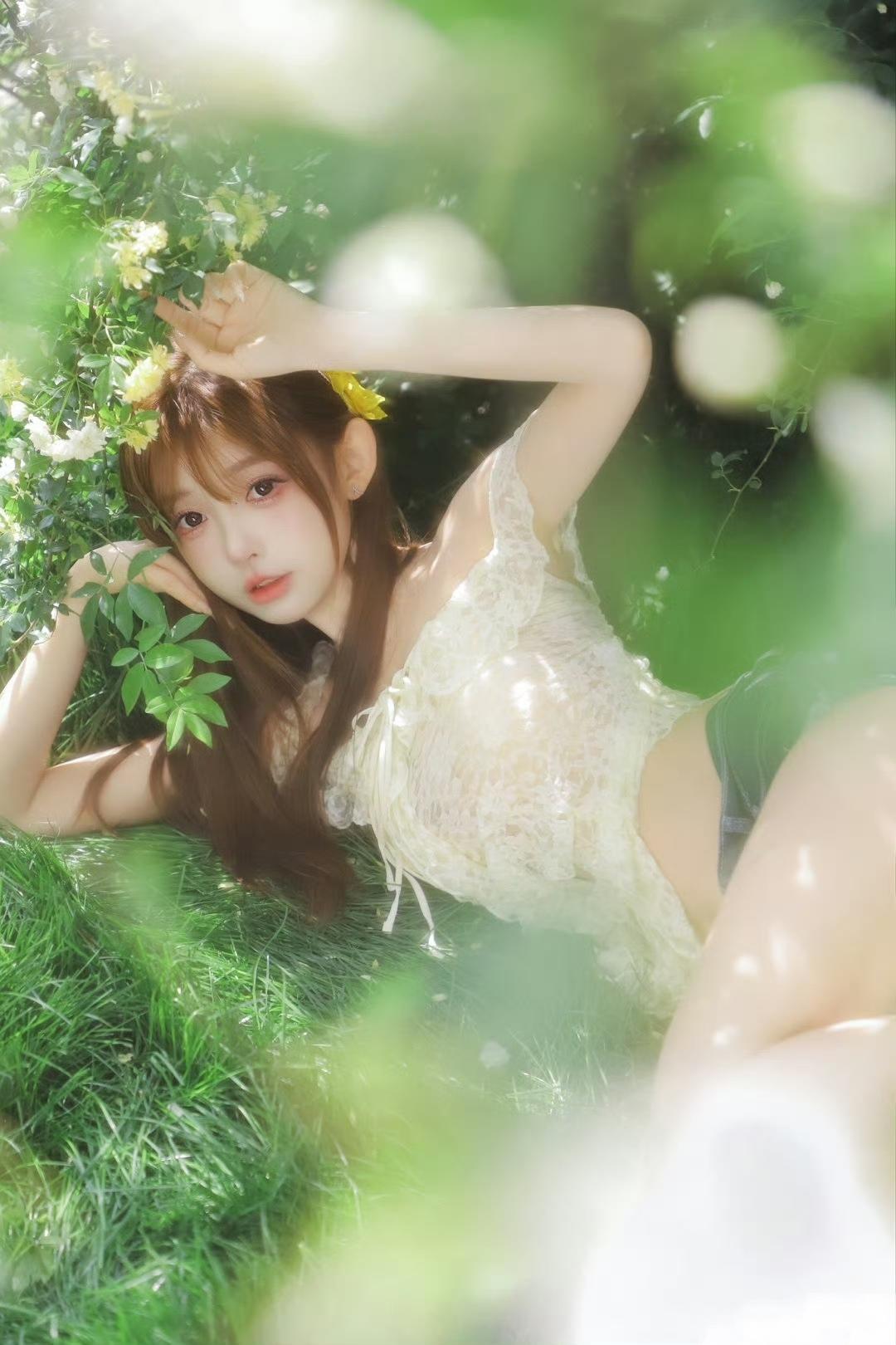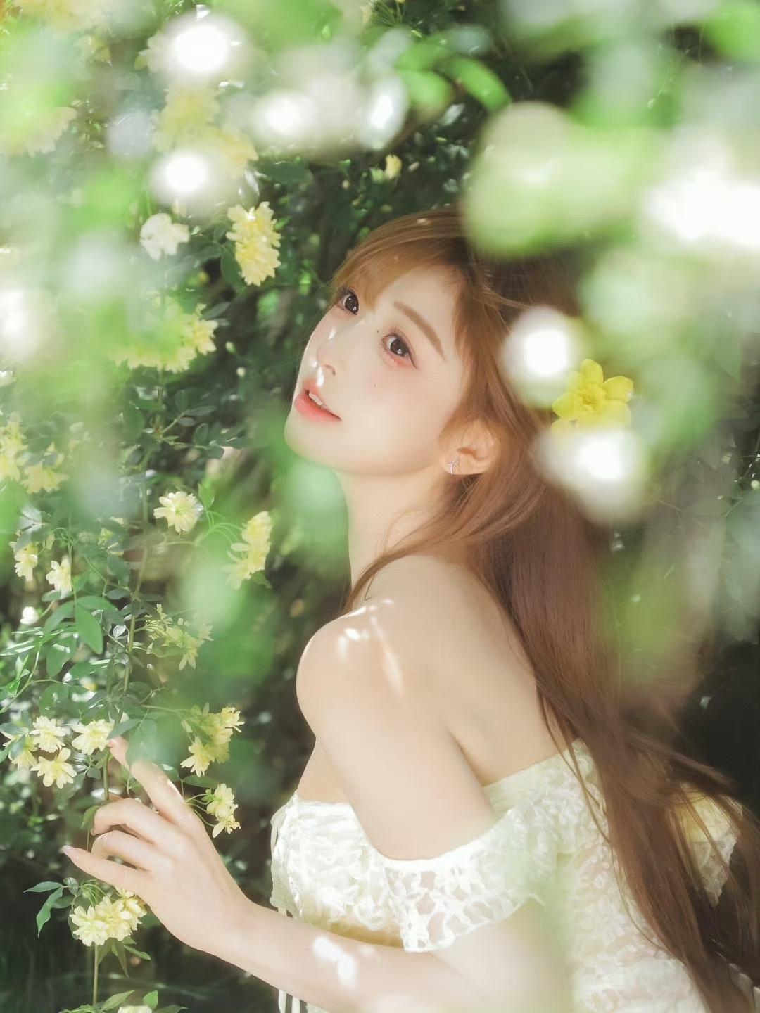 夏日粉裙,优雅坐椅,绿意盎然,美不胜收!粉裙微笑写真粉裙花畔照