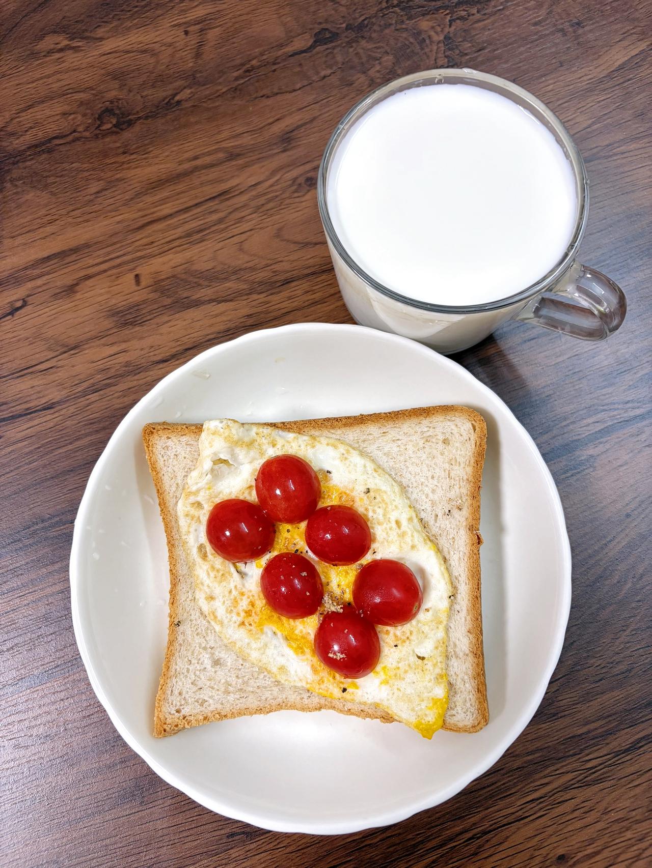 今日减脂早餐:全麦面包+无油煎蛋+番茄+纯牛奶