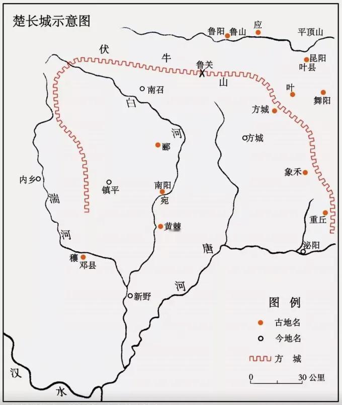 河南省南阳市境内的“楚长城”走向示意图。南阳楚长城为楚国北部屏障,西倚伏牛山,东