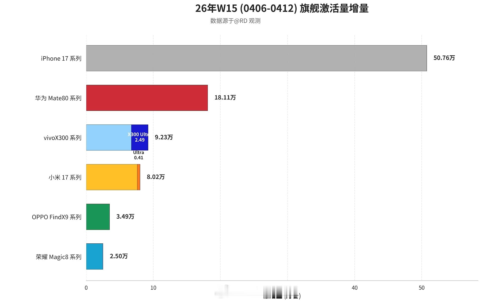 W15 旗舰激活量增量iPhone 17 系列 50.76 万华为 Mate80 系列 18.11 万小米 17 系列 8.02 万台(含 Ultra 0.41 万)vivoX300 系列 9.23 万(含 X300 Ultra 2.49 万)OPPO FindX9 系列 3.49 万荣耀 Magic8 系列 2.5 万