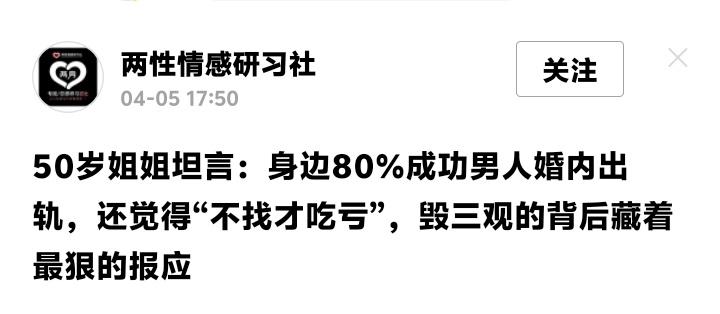 更可怕的是这种风气正在蔓延。年轻创业者竟把“有几个红颜知己”当作成功的标志,酒桌上炫耀情史成了常态。道德的底线被不断拉低,忠诚成了稀缺品,整个社会的婚姻观都在被这种扭曲的价值观侵蚀。