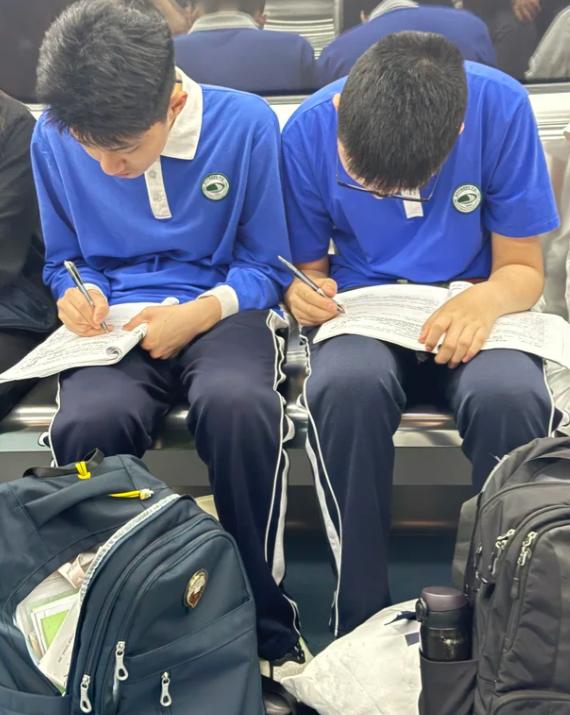 还有拎着折叠桌上地铁的孩子,在颠簸的车厢里支起桌子,端端正正地埋头苦写。这哪里是在坐地铁,分明是奔赴“第二战场”。