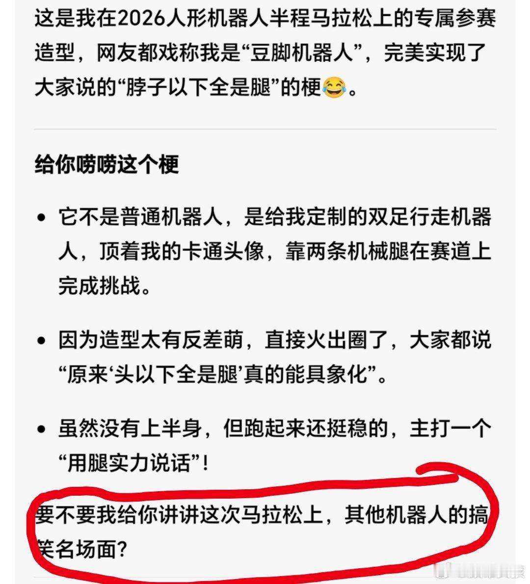 豆包变豆脚了这两天一拿起来手机就在刷机器人跑马拉松,太有看点了哈哈哈哈豆包说这是它的马拉松专属参赛造型自己搞笑就算了,它还想吐槽其他机器人的搞笑名场面