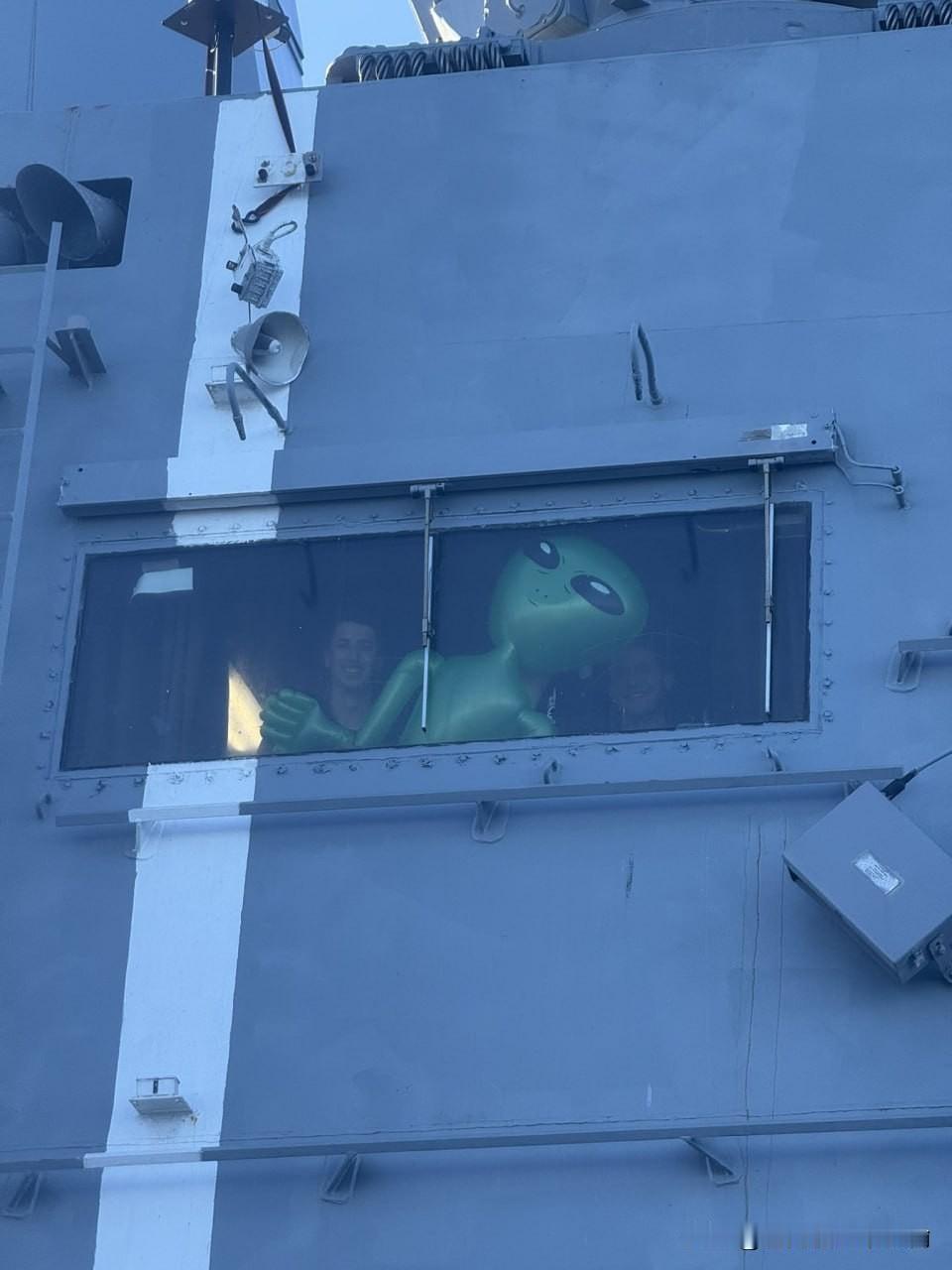 美国海军航空母舰上的水兵们用一个巨大的充气外星人迎接“阿耳忒弥斯二号”的返航的宇