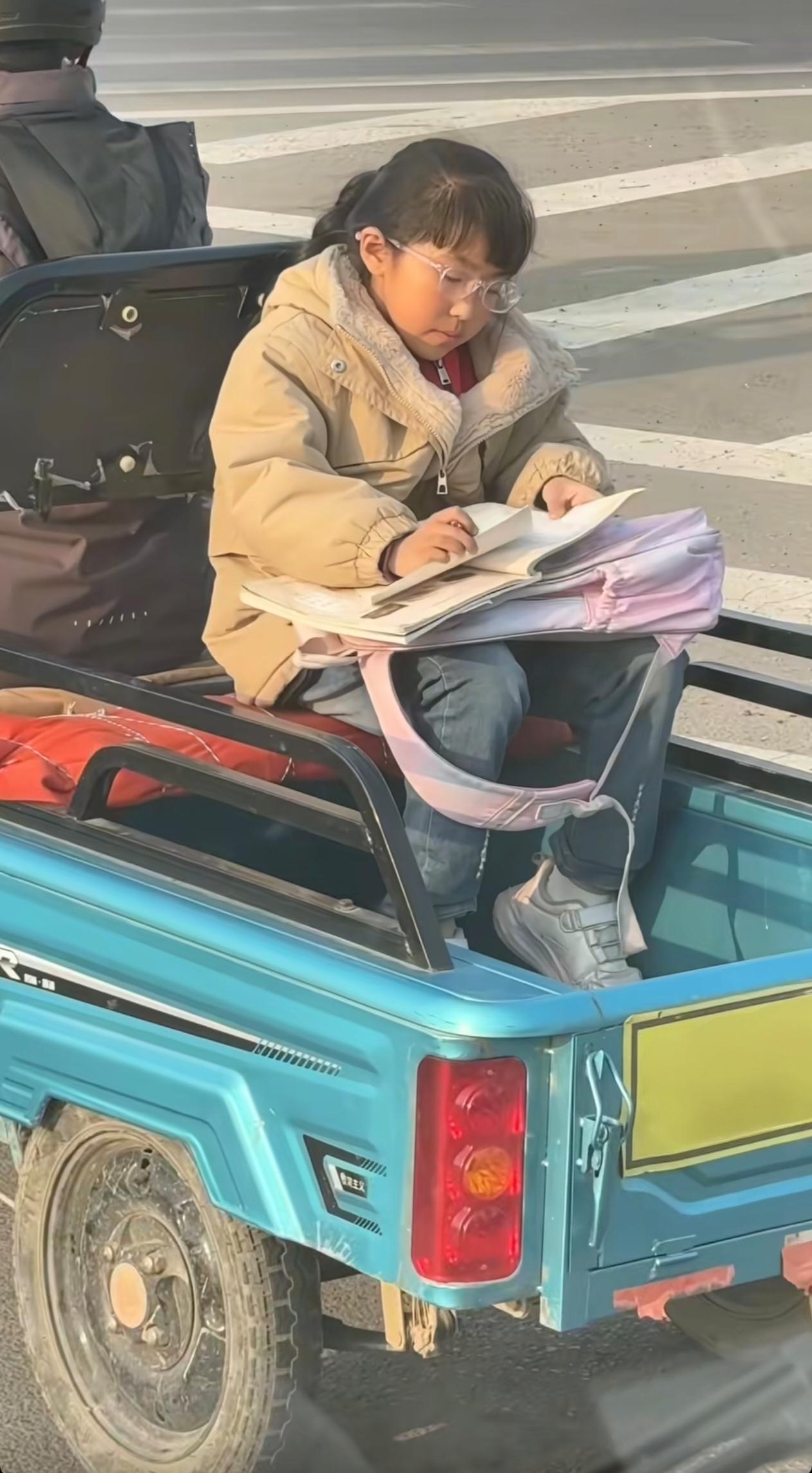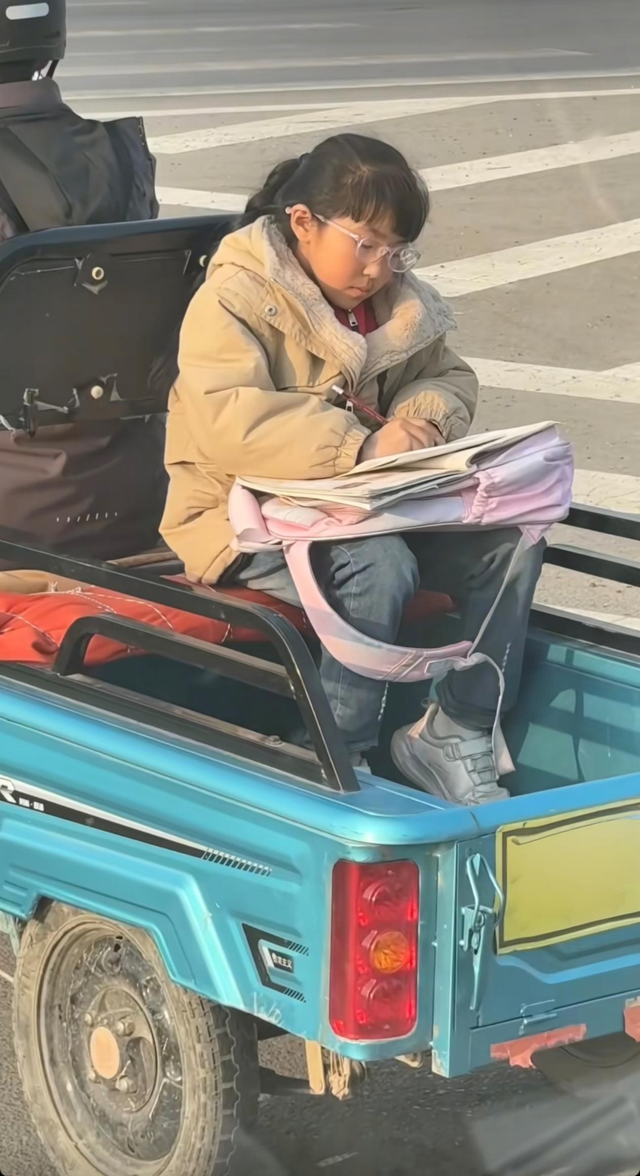 别人都在玩闹,她却坐在三轮车上,就着书包写作业,全程专注得头都没抬一下。