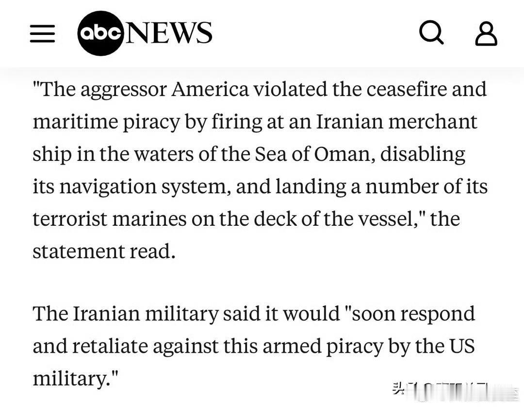 美国破坏了停火协议,朝货船开炮是海盗行为,登上伊朗船只的美军是恐怖份子…伊朗即将实施报复 。