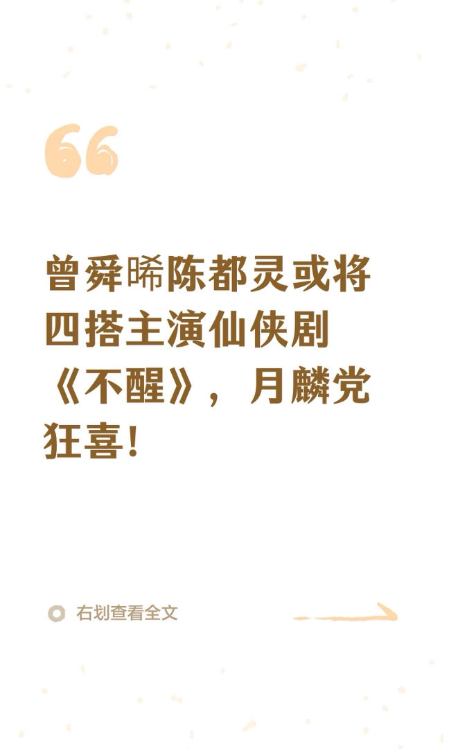 曾舜晞陈都灵或将四搭主演仙侠剧《不醒》,网传曾舜晞和陈都灵有望再次合作,主演改编