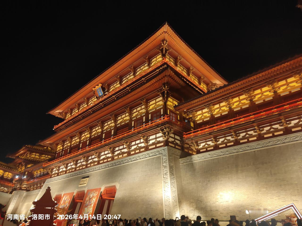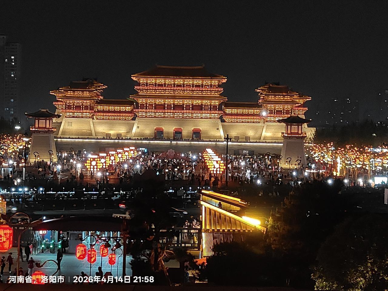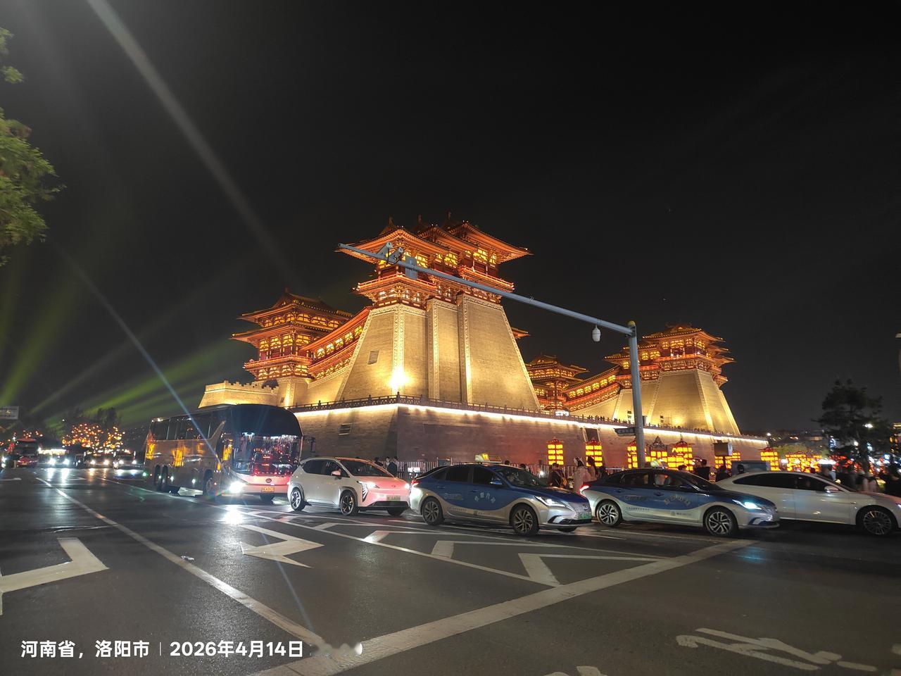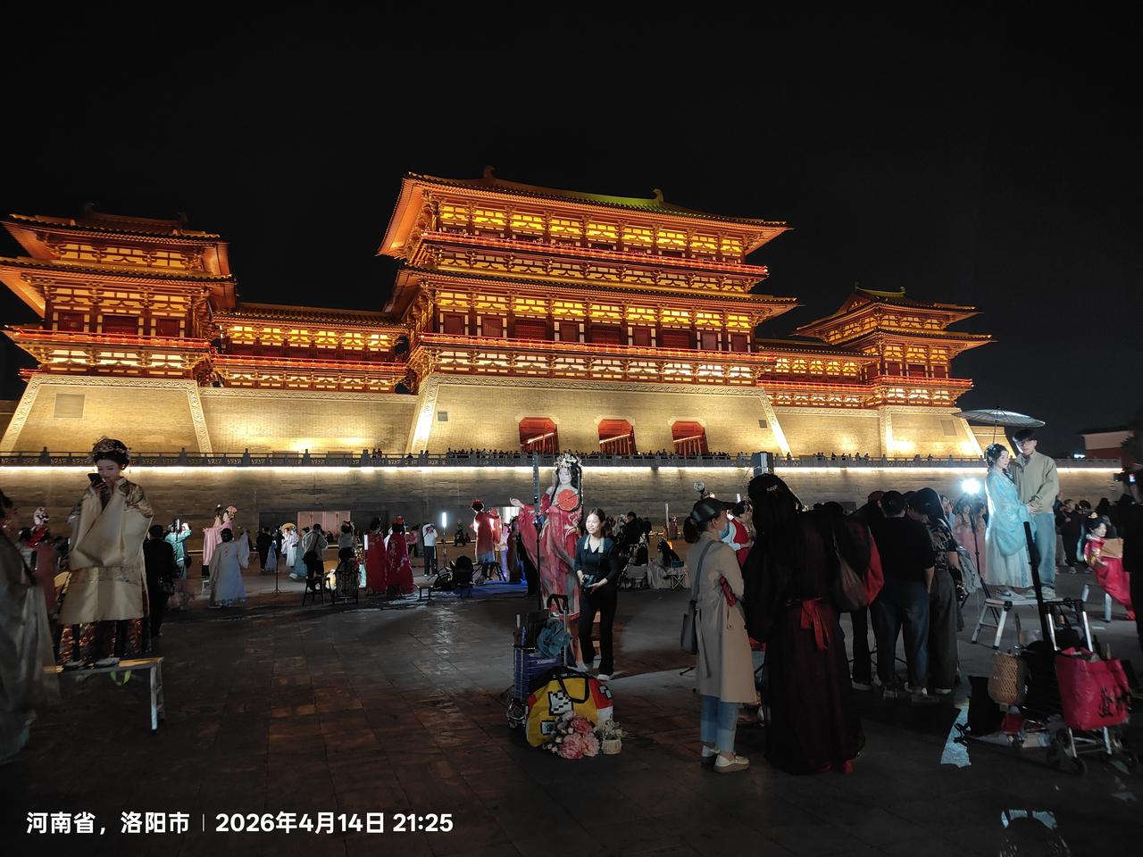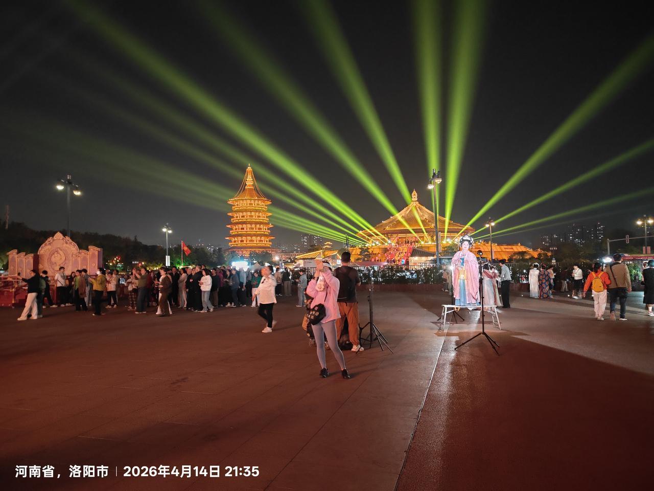 夜幕下的应天门,华灯初上,金碧辉煌。飞檐翘角如鲲鹏展翅,斗拱层叠照千年风华。朱红宫墙在光影里庄重又温柔, 两岸霓虹倒映,晚风轻拂,老街灯笼摇曳,游人笑语相迎,很多小美女身穿汉服,行走在人群中,让人感觉时空穿越隋唐,一派盛世繁华景象。