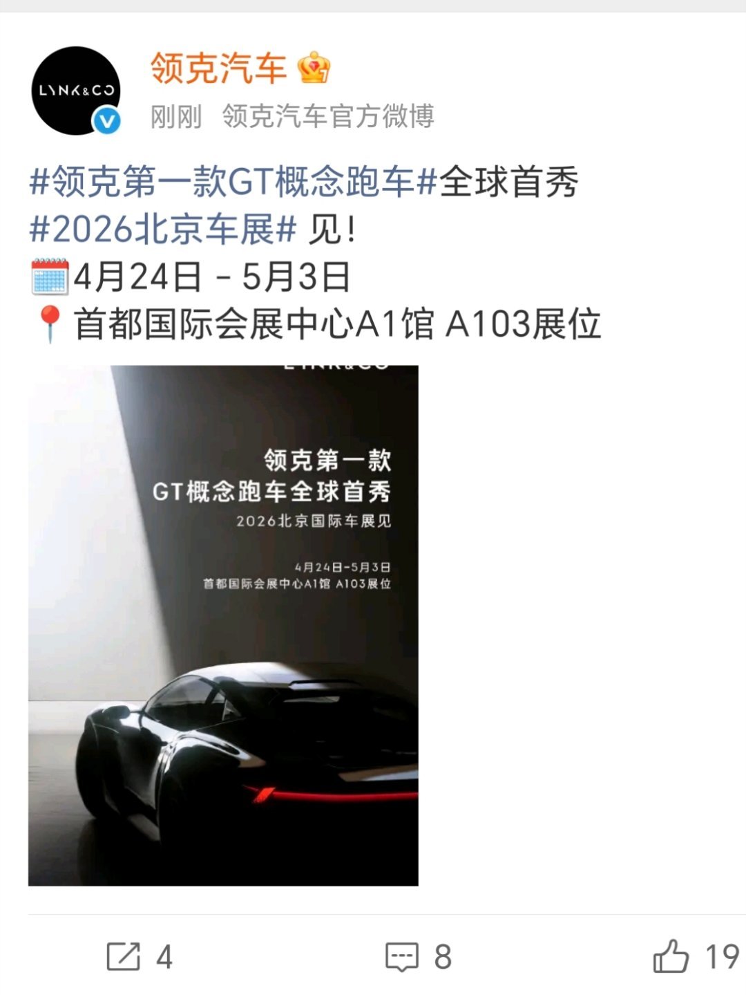 不是,领克第一款GT概念跑车这就来了是 3.0T V6 那种吗不知道北京车展能不