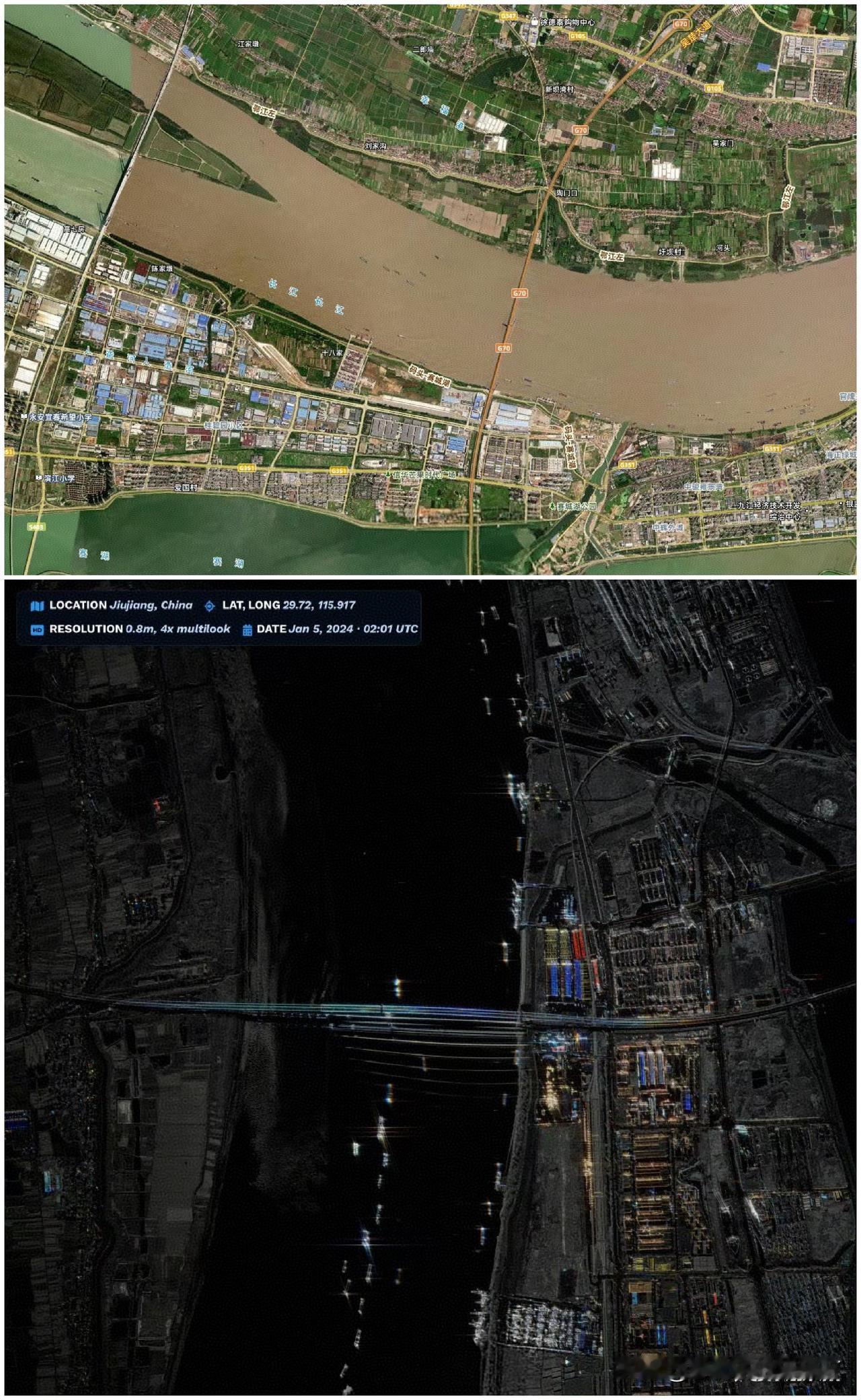 咱们的卫星看上去应该是合成孔径雷达卫星。合成孔径雷达能穿透一定的厚度、材质物体,应用非常广泛。图2是合成孔径雷达卫星下的九江,分辨率0.8m。