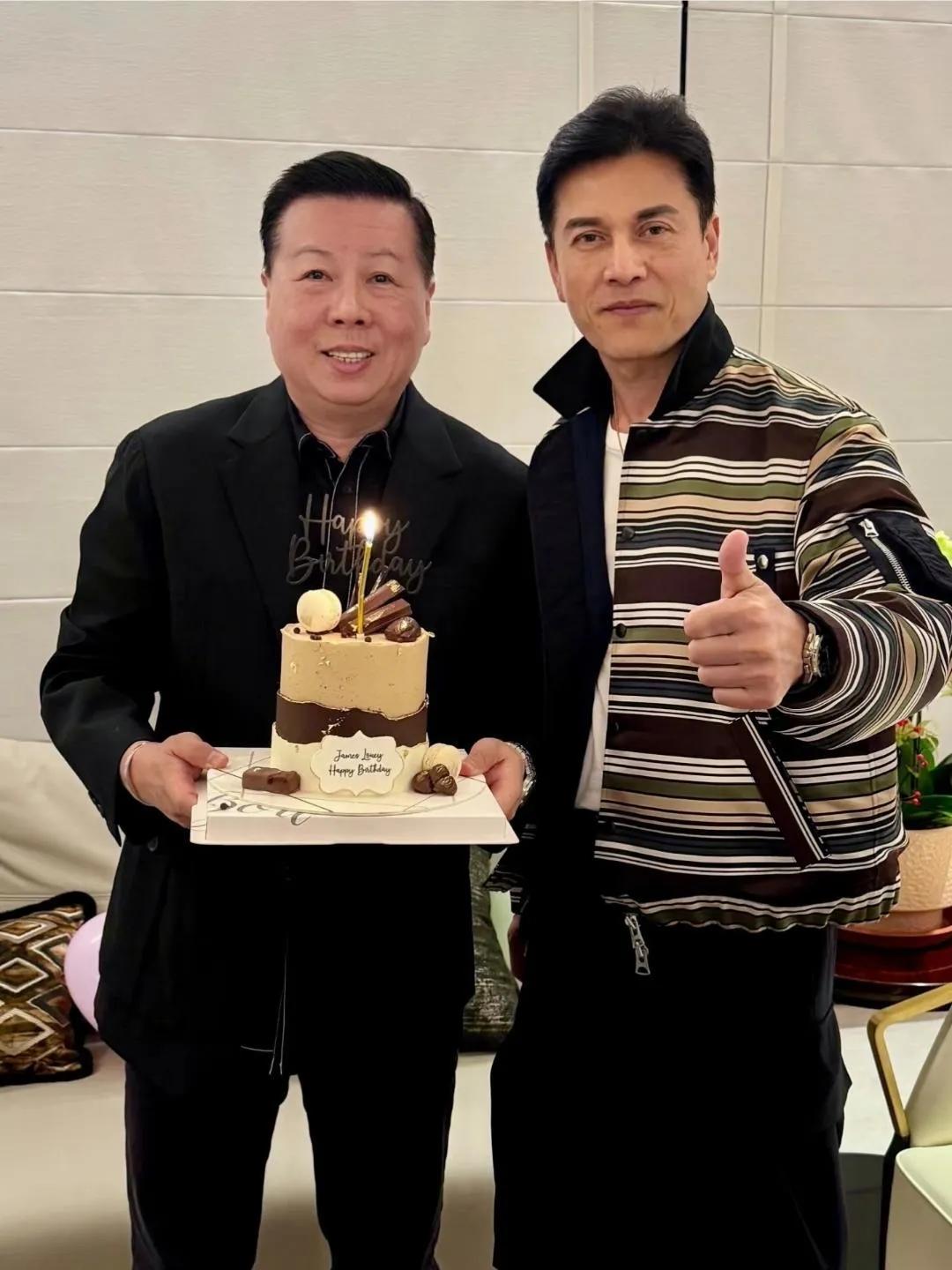 吕良伟和老婆杨小娟给好朋友过生日,四个人围在一起有说有笑,吕良伟更是搂着杨小娟,感情真的很恩爱。