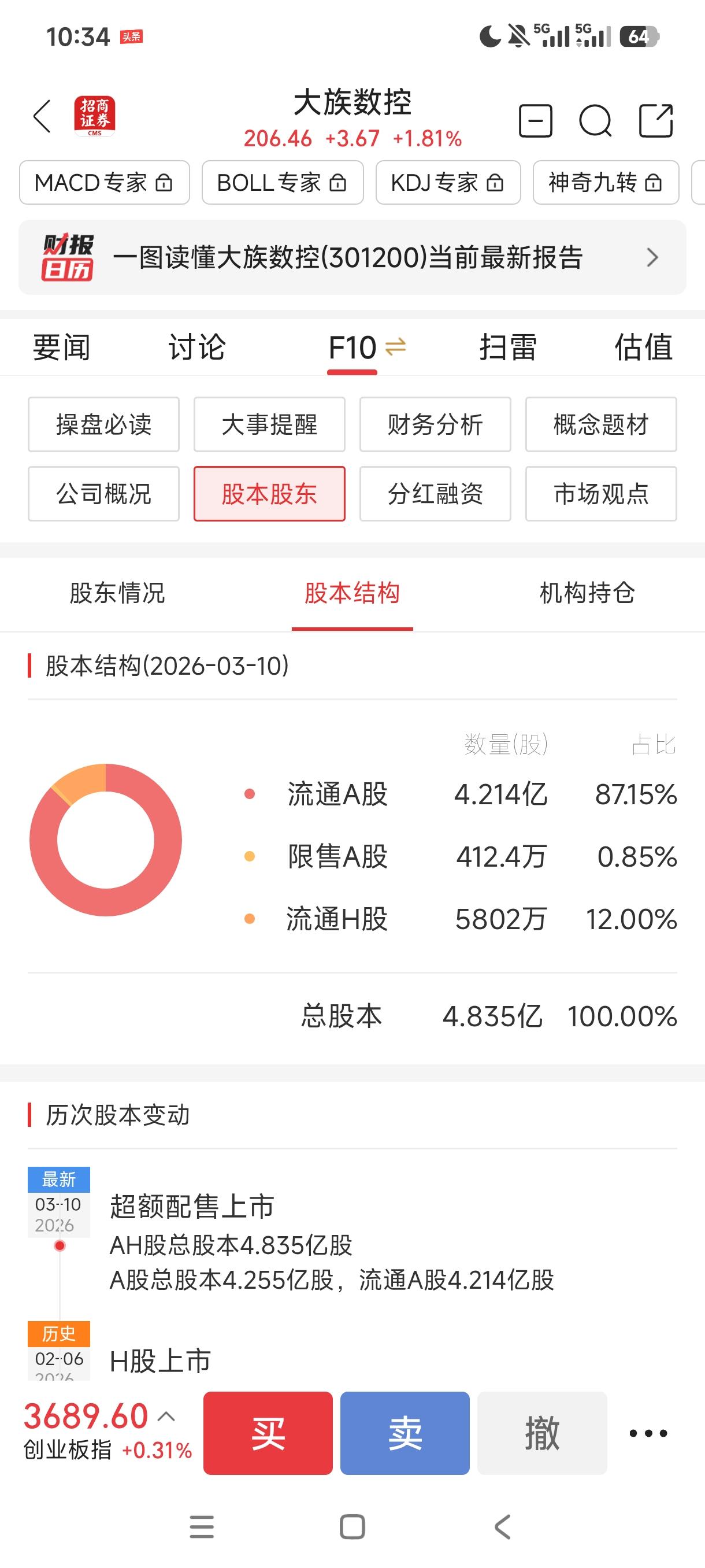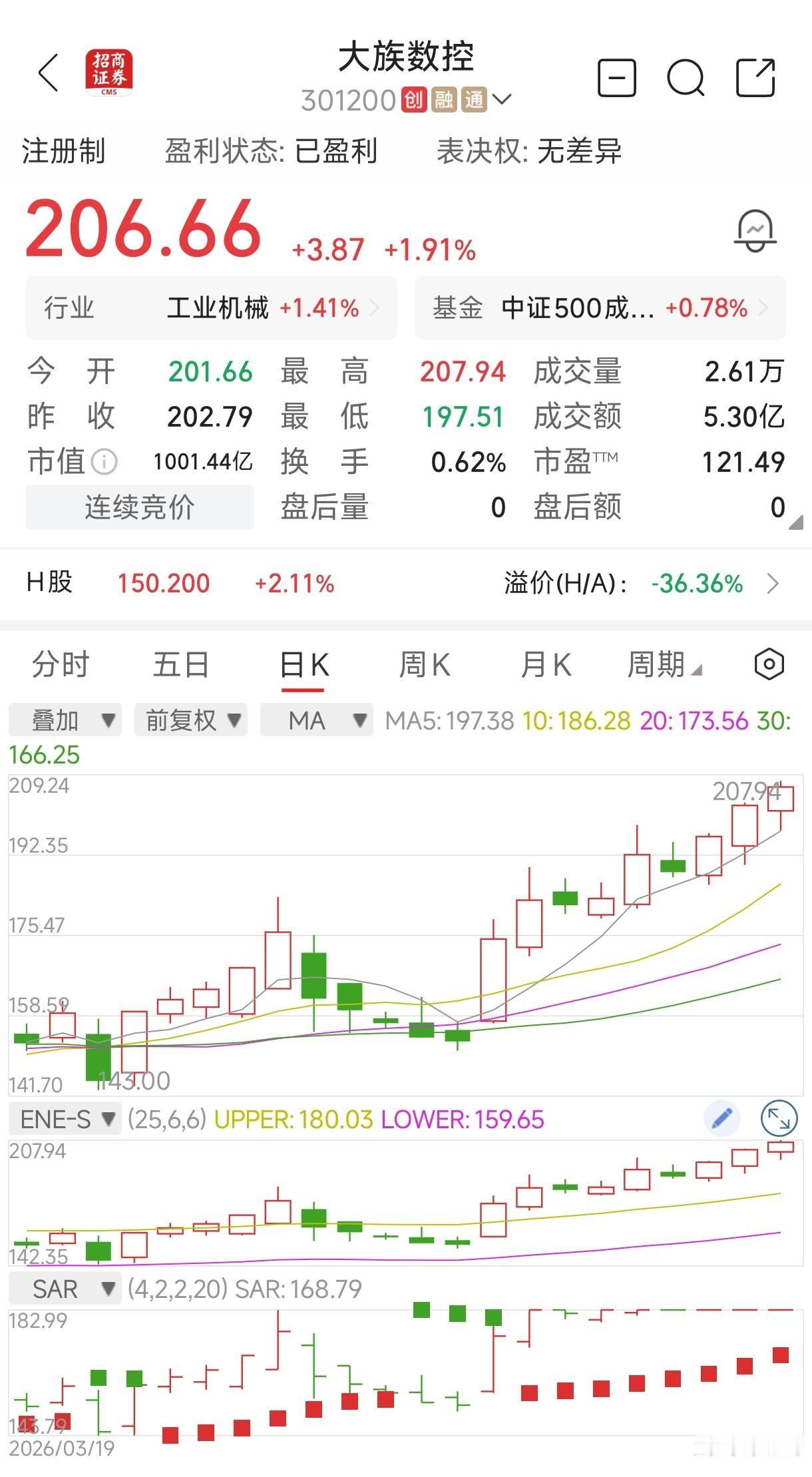 ●大族数控今日股价低开高走,仅以201.66元开盘,较上周收盘价下跌0.56%;随后快速上攻,最高到达207.94元,以总股本4.835亿股计算,总市值约1005亿元,从而成功突破1000亿元平台。大族数控股价本月累计上涨25%,今年累计上涨71%,投资人赚大发了。