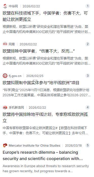 另一组数据也能说明问题。截至2025年底,中国正在参与的“地平线欧洲”项目约为107个。相比中国每年天文数字的国内科研投入,这107个项目在资金总量上确实不算什么。但这背后丢失的,远不止是钱的问题——中国学者正在失去一个重要的国际交流平台,获取欧洲前沿资源、与顶尖团队面对面协作的机会正在大幅减少。不过话说回来,这种损失对欧盟来说恐怕更大。