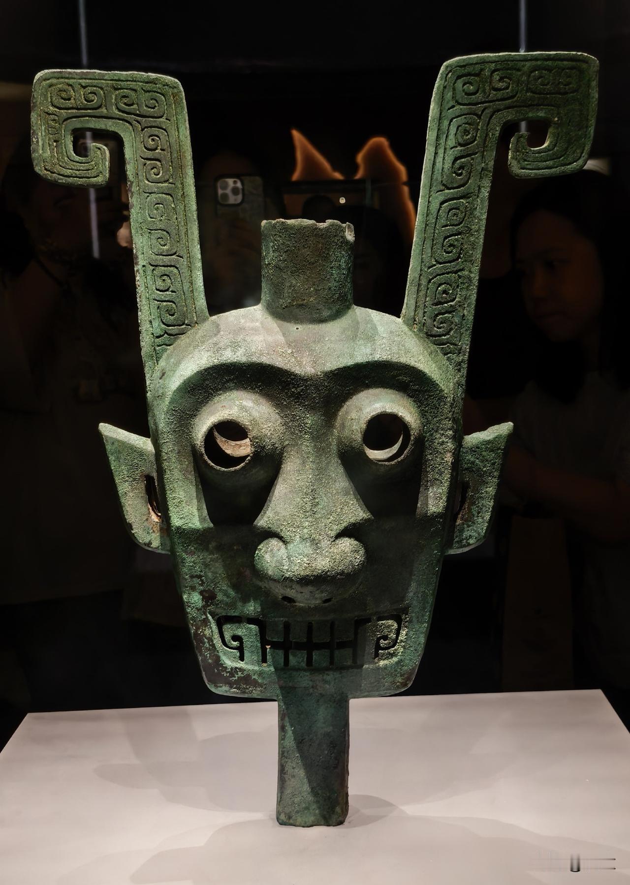 这个青铜头像下颌的地方有銎,可以插个木柄。这个青铜头像是干什么的呢?大致认为是祭祀用的神像。巫沙祭丘或是浮沉祭水什么的,举行仪式用的。