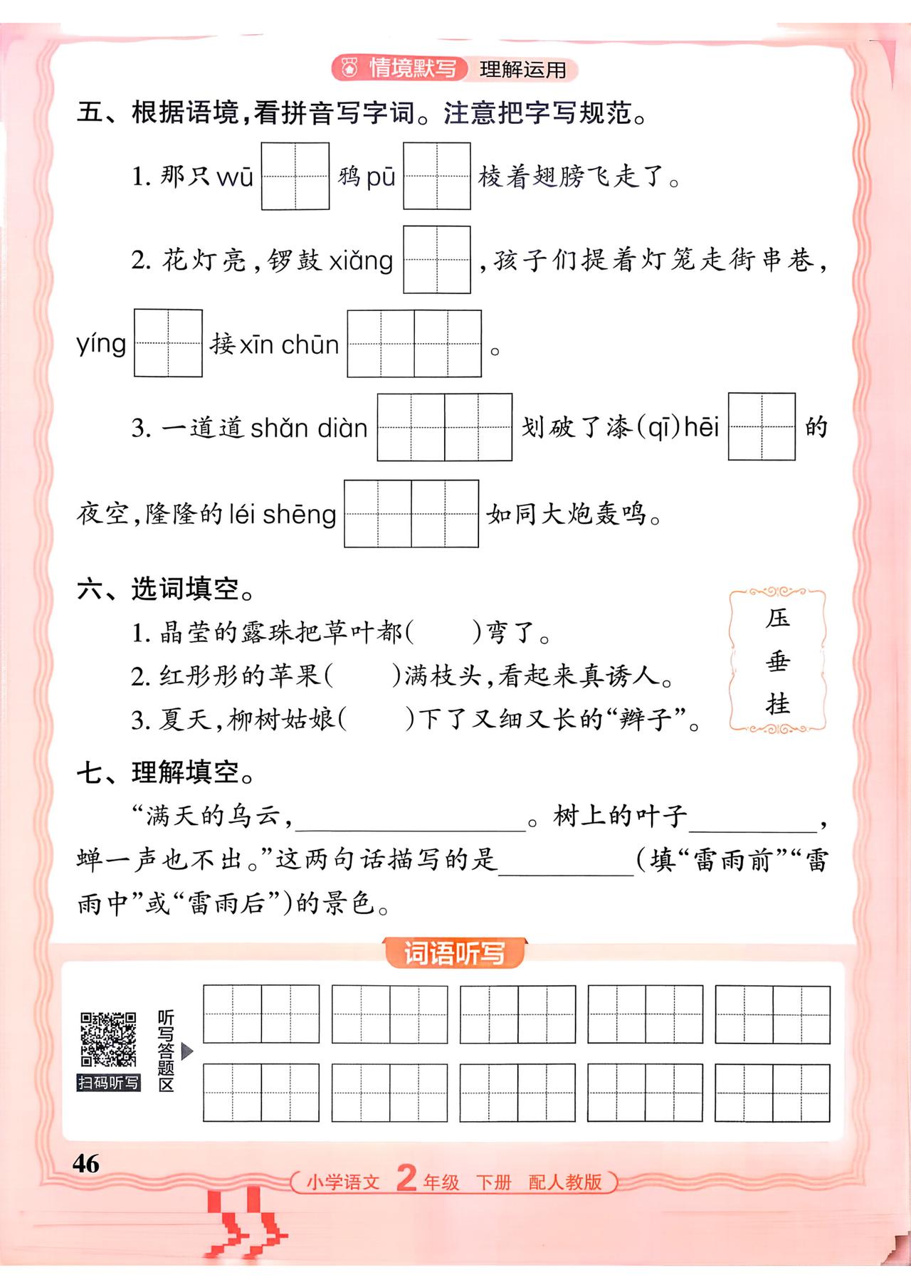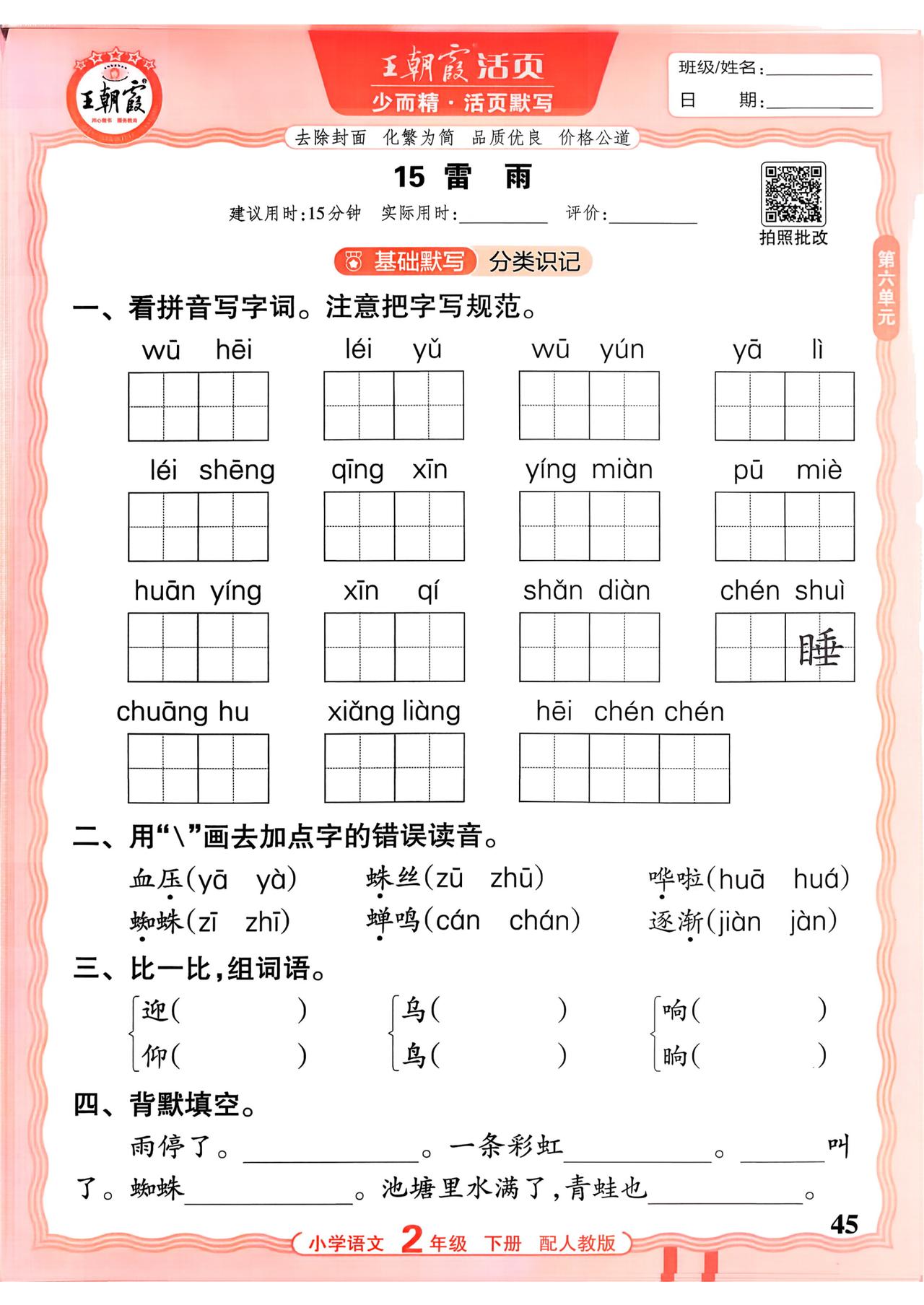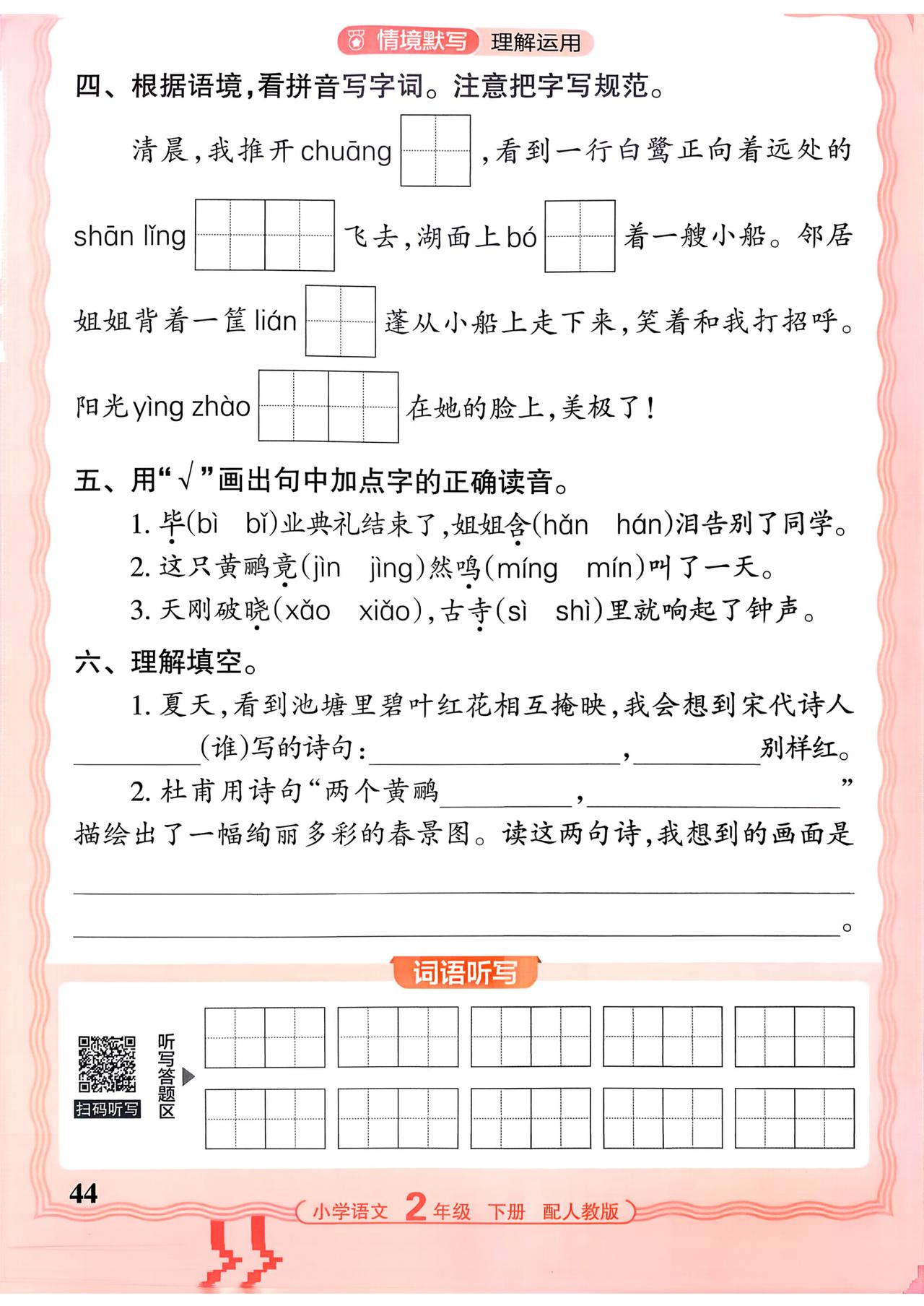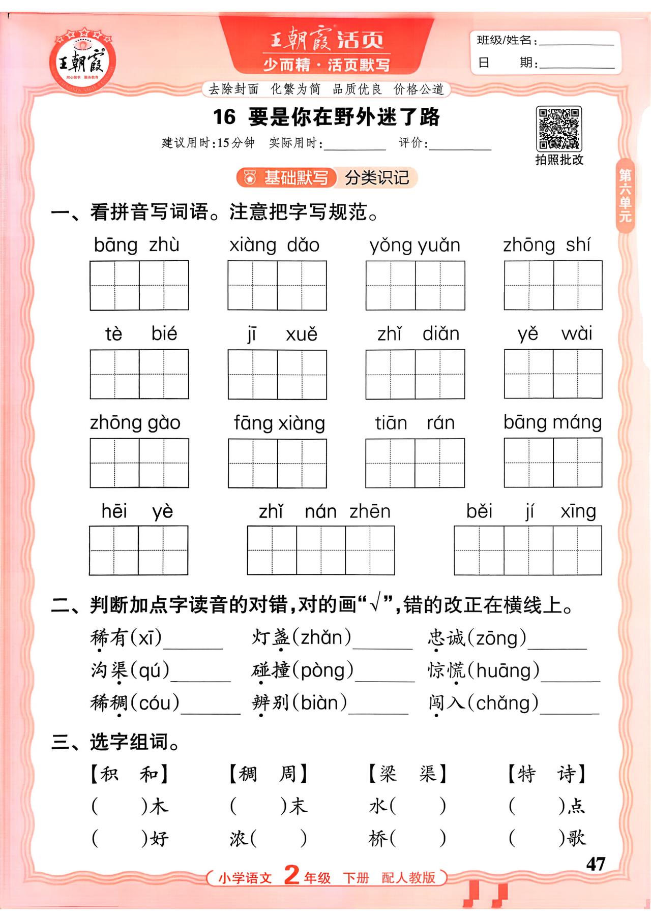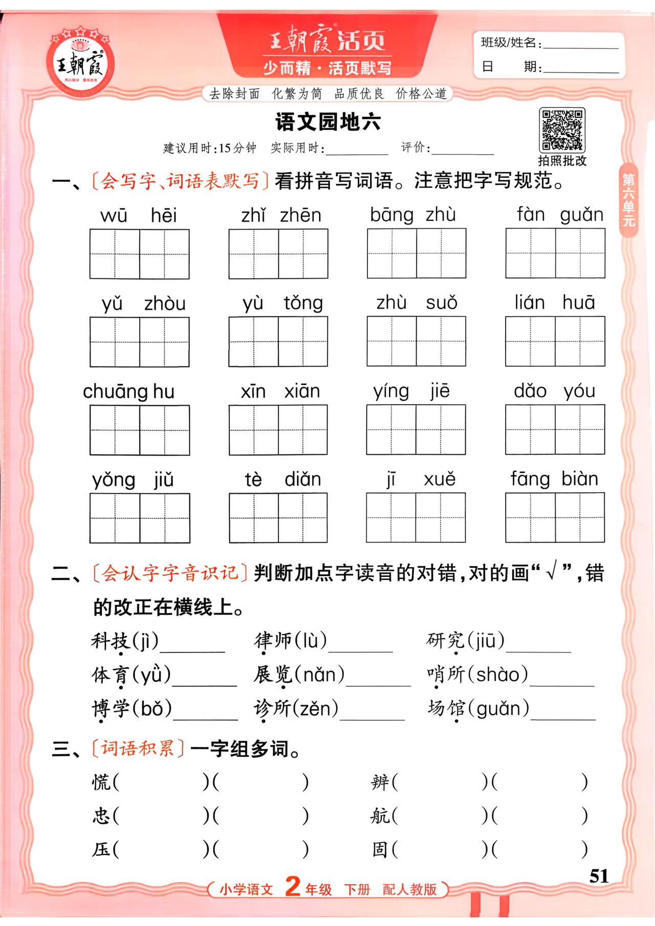 26春二年级下册语文,第六单元基础知识活页默写+参考答案,收藏备用