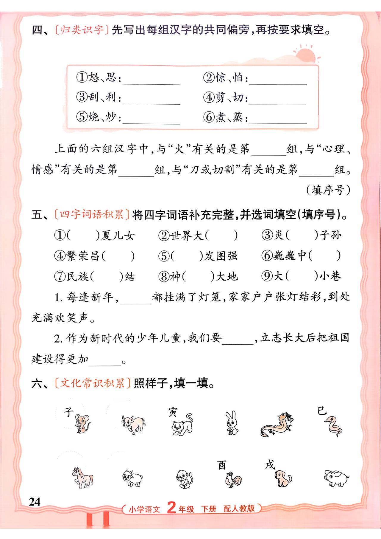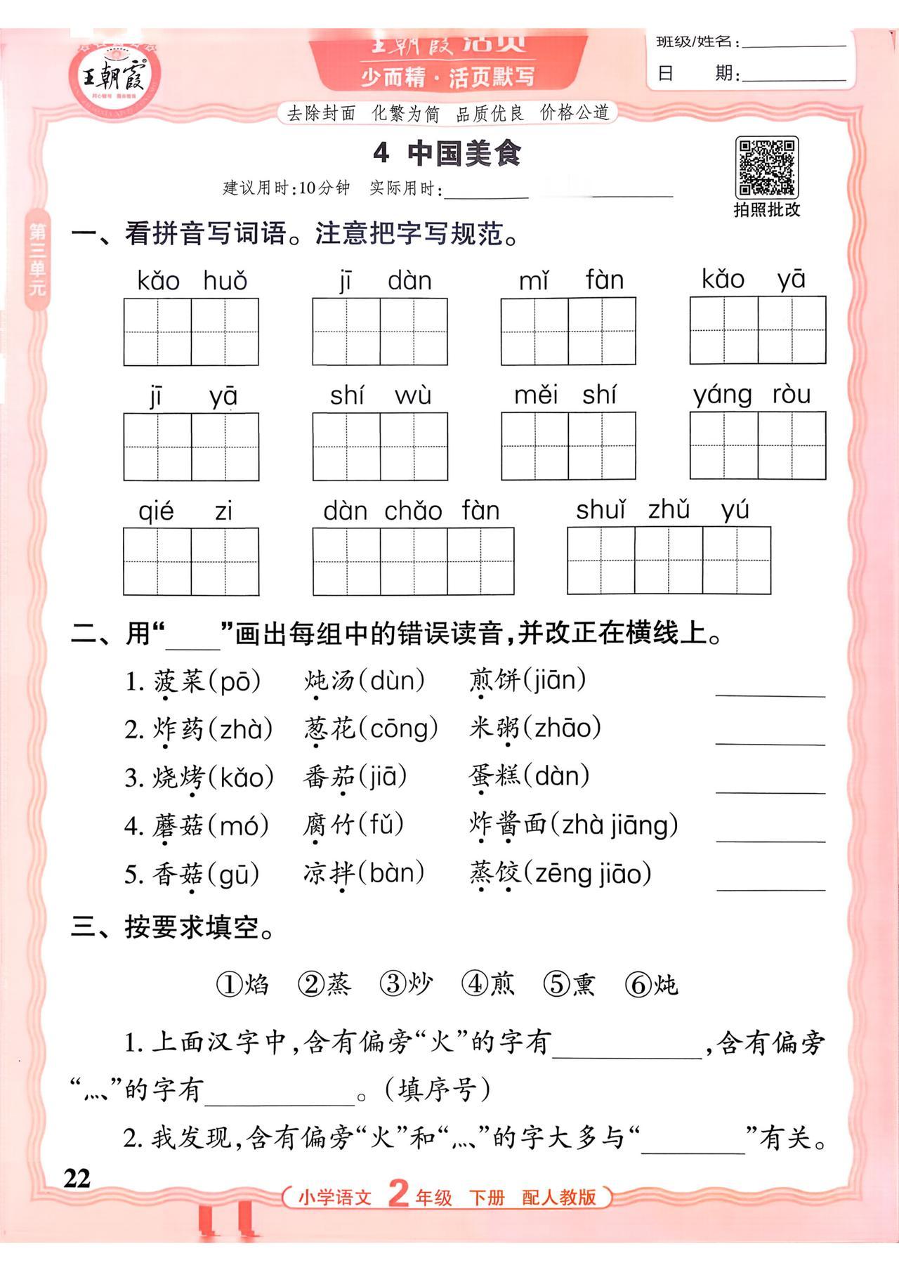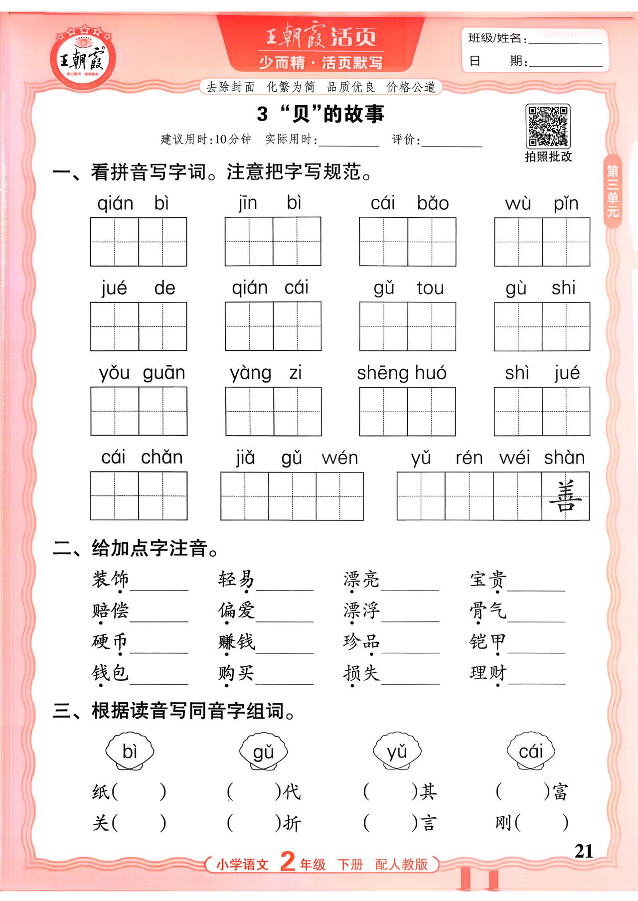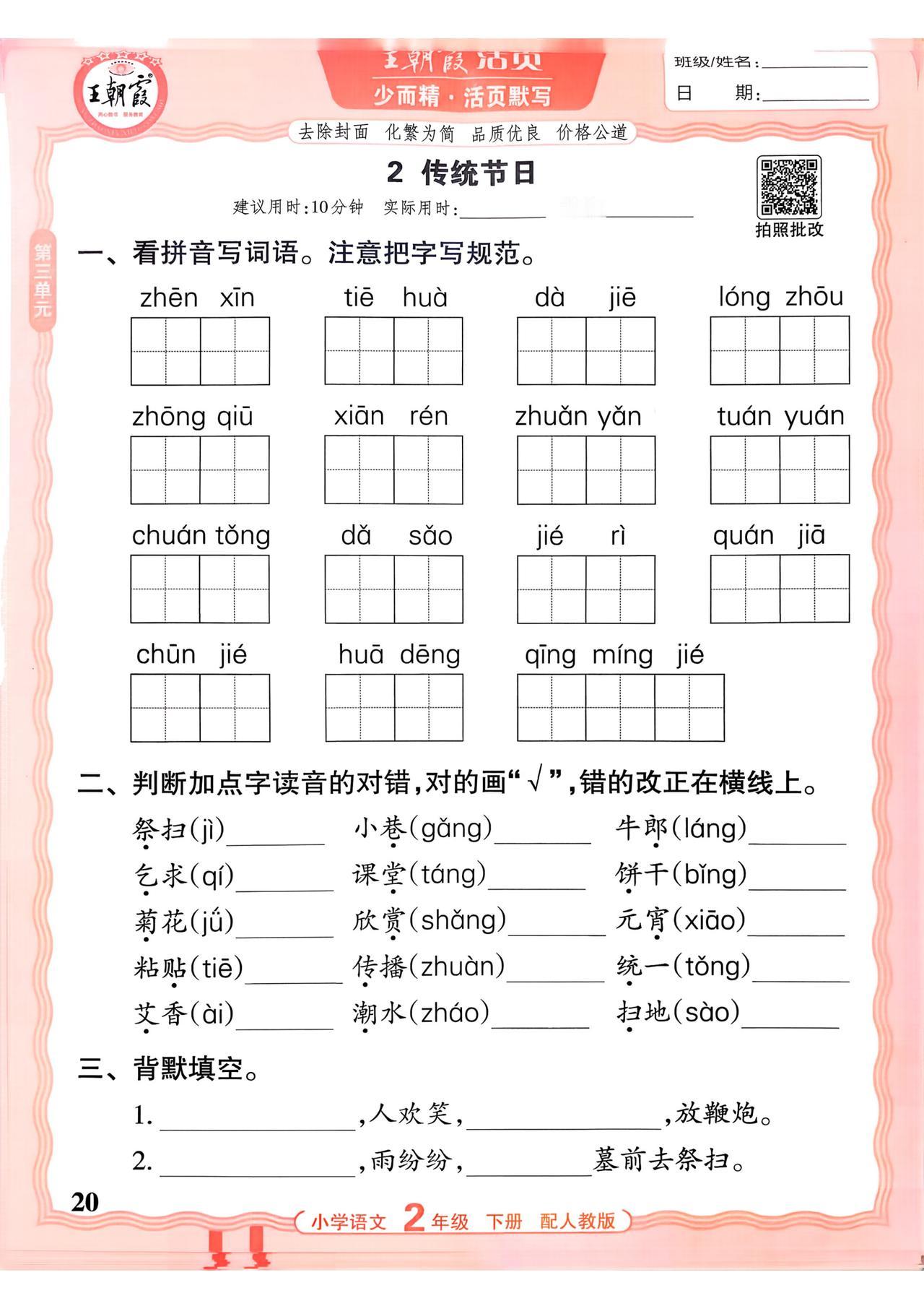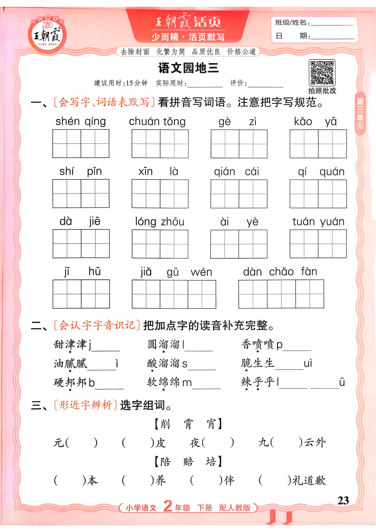 26春二年级下册语文,第三单元基础知识活页默写+参考答案,收藏备用