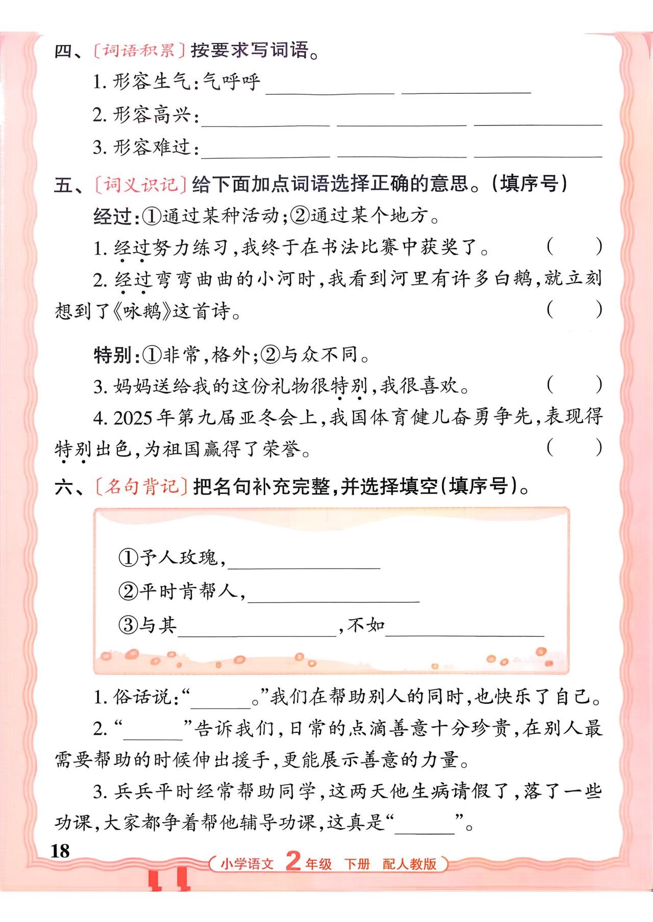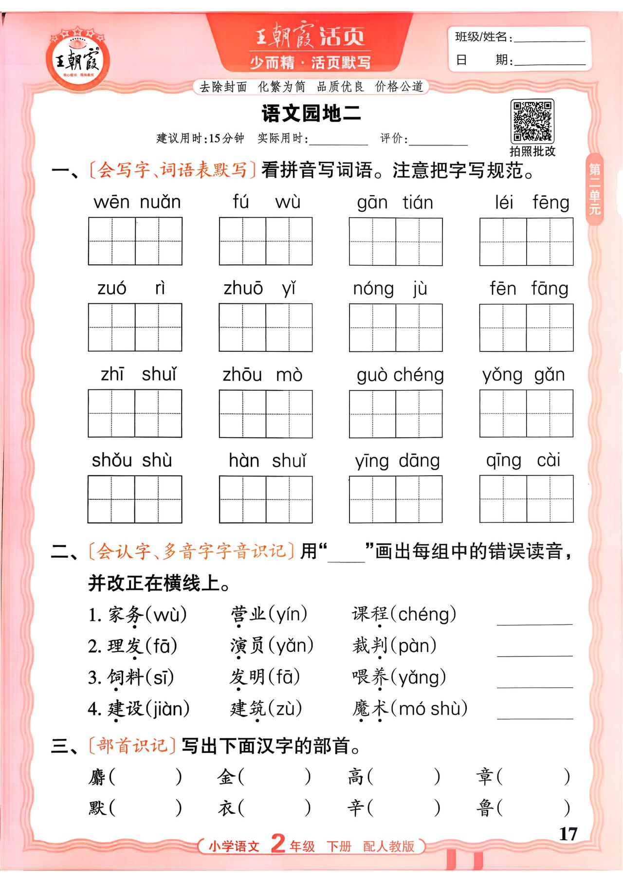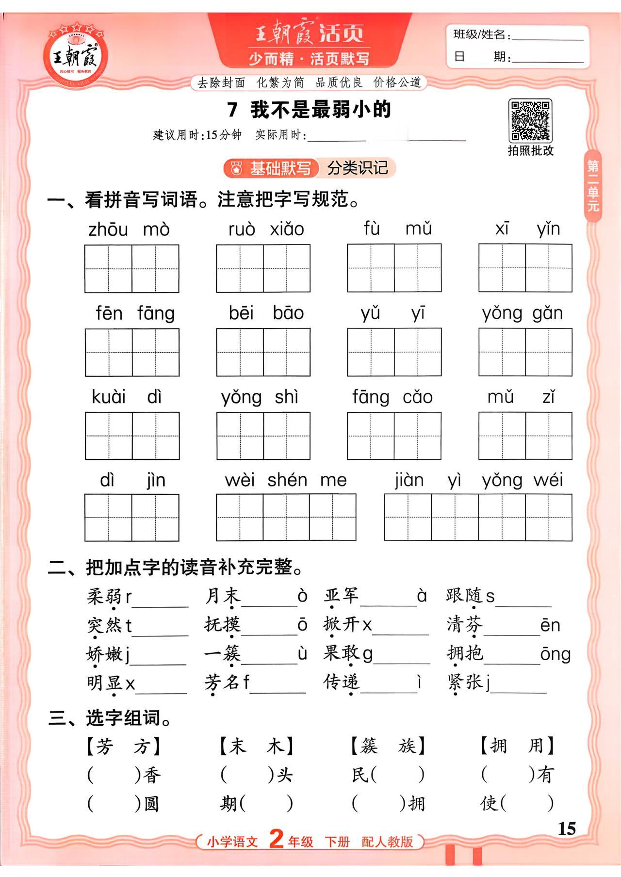 26春二年级下册语文,第二单元基础知识活页默写+参考答案,收藏备用