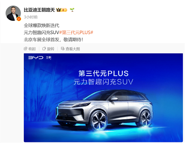 比亚迪第三代元PLUS将于2026北京车展全球首发,定位“元力智趣闪充SUV”,全面升级尺寸、续航与性能: