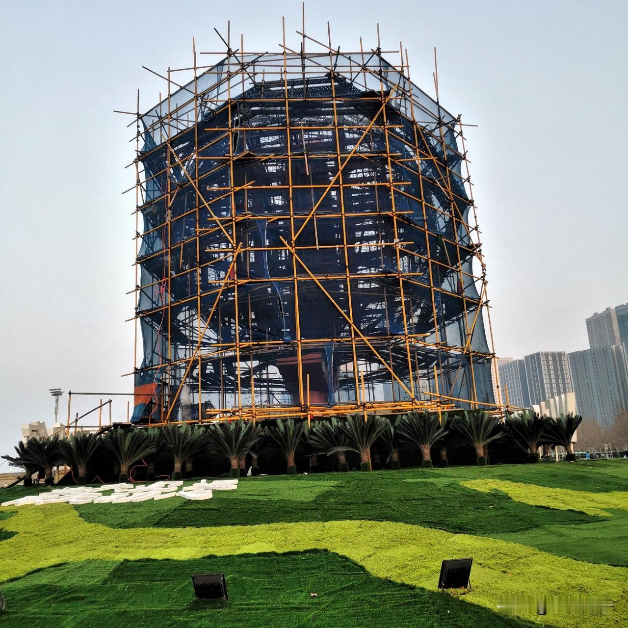 目前,脚手架已全部搭起,里面还套着一层网,“大地球仪”附近的铁树还在那儿摆着,浅绿色和深绿色装饰物,不见一点灰尘,现场干干净净。