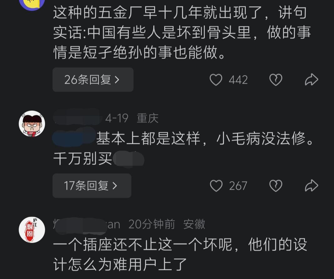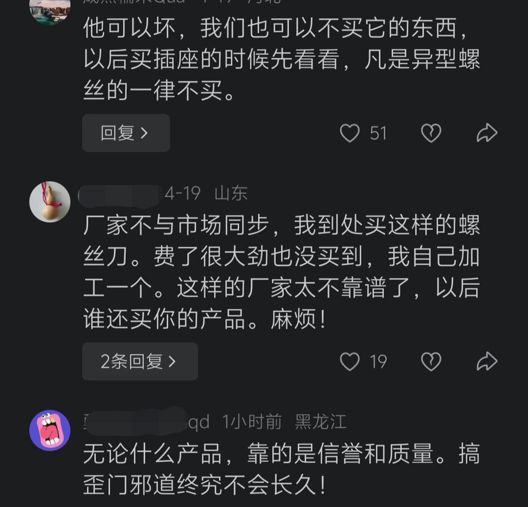 近日,看到一个关于水电维修的视频,视频作者表示:现在的厂家太坏了!故意设计各种异形螺丝装在插座上,普通工具根本拆不掉,目的就是不让你维修,让你换新的。